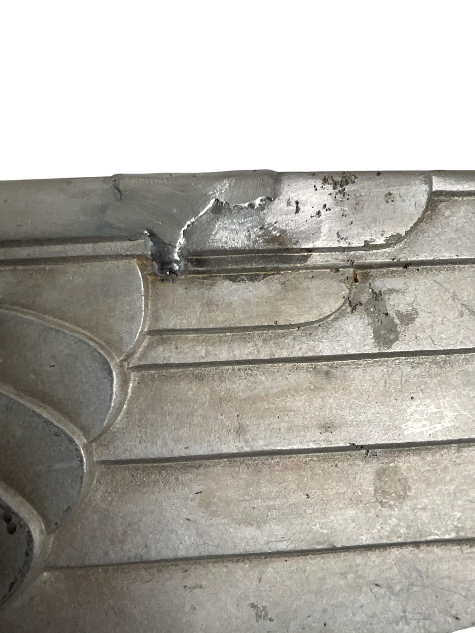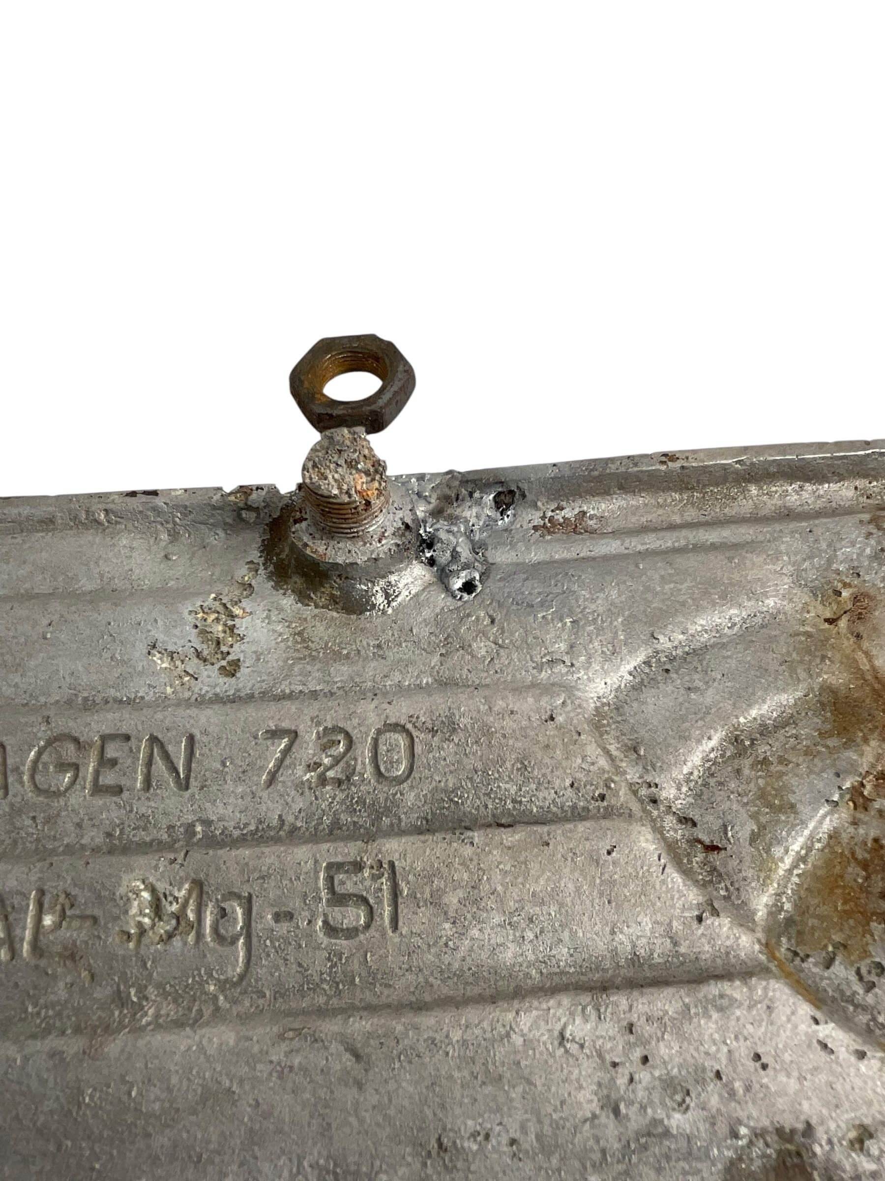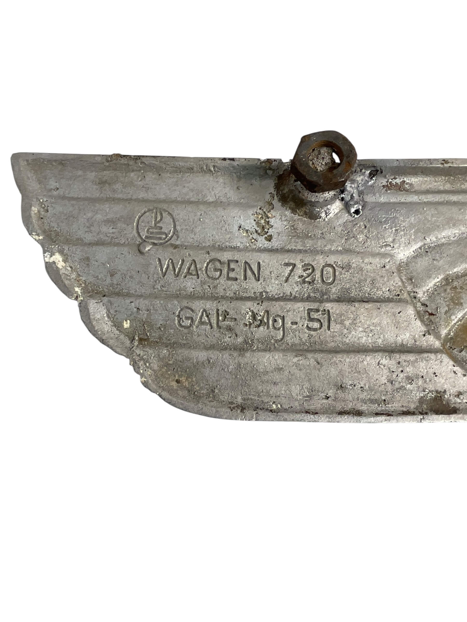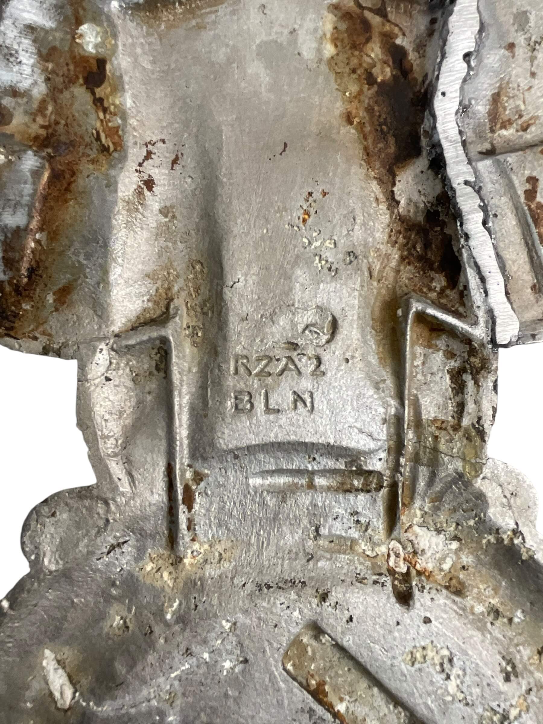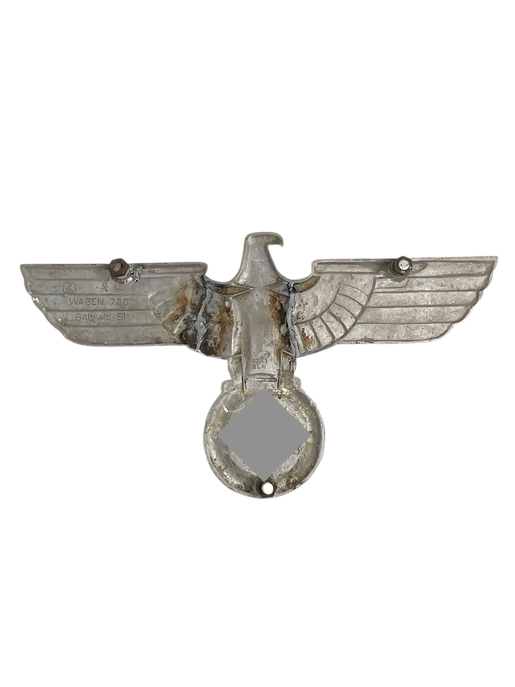 This item is a World War II German Railway Eagle constructed from aluminum. Such eagles were originally mounted on locomotives and railway stations in Germany during the Third Reich period, serving as prominent national emblems. This example retains its characteristic form, with outstretched wings and a centrally positioned swastika within a wreath, consistent with the standard design used by the Deutsche Reichsbahn between 1937 and 1945. The overall dimensions correspond to the typical sizes employed on railway rolling stock and have mounting holes consistent with original installation methods. Notably, this piece has undergone repairs, which are visible on close inspection and are reflected in the overall condition of the aluminum surface. These repairs do not affect any essential identifying features or iconography. This artifact offers a representation of the insignia used by German railway authorities during the Second World War and illustrates the stylized symbolism frequently associated with official Nazi-era objects.