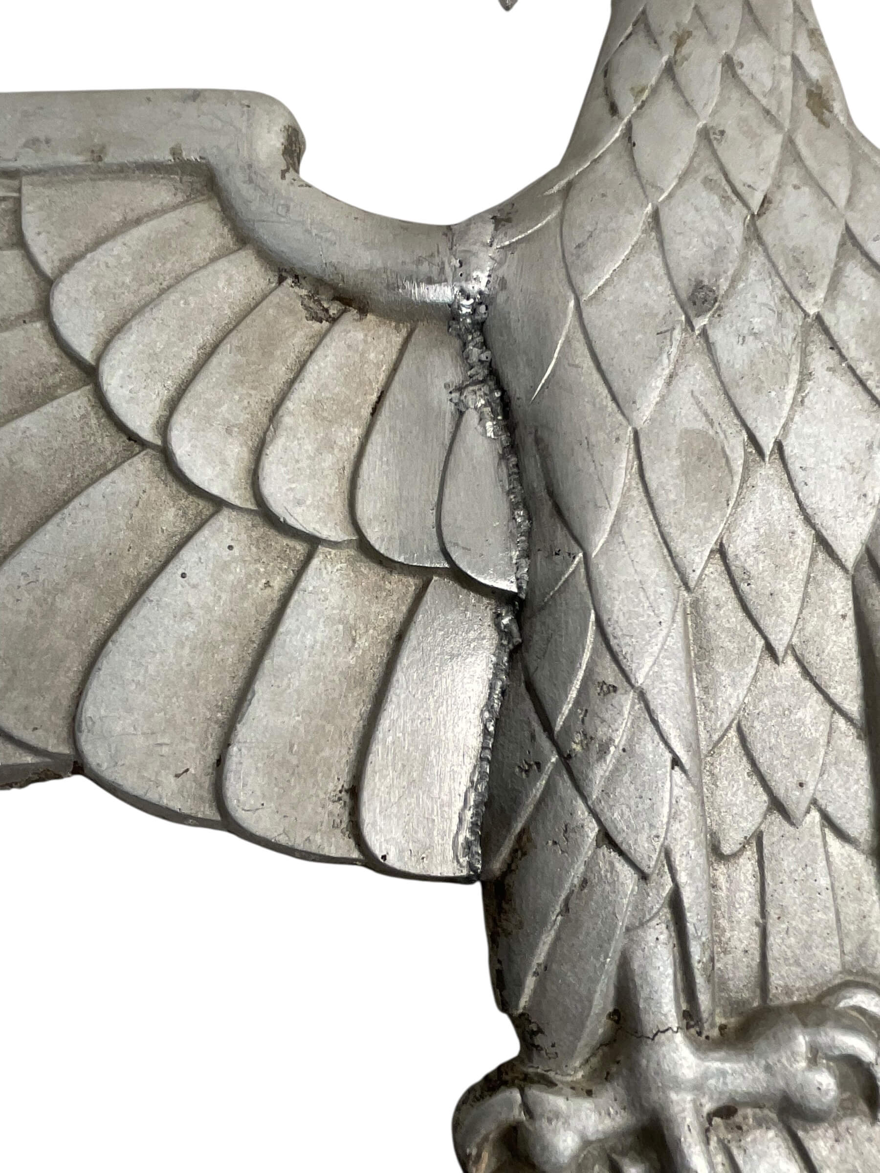 This item is a World War II-era German Railway Eagle that has undergone repair. During the Third Reich period, these eagles were prominently displayed on German railway buildings, bridges, and rolling stock, serving both decorative and propagandistic functions. Typically cast in aluminum or occasionally zinc, the eagle features outstretched wings and clutches a swastika in its talons—an iconic design associated with