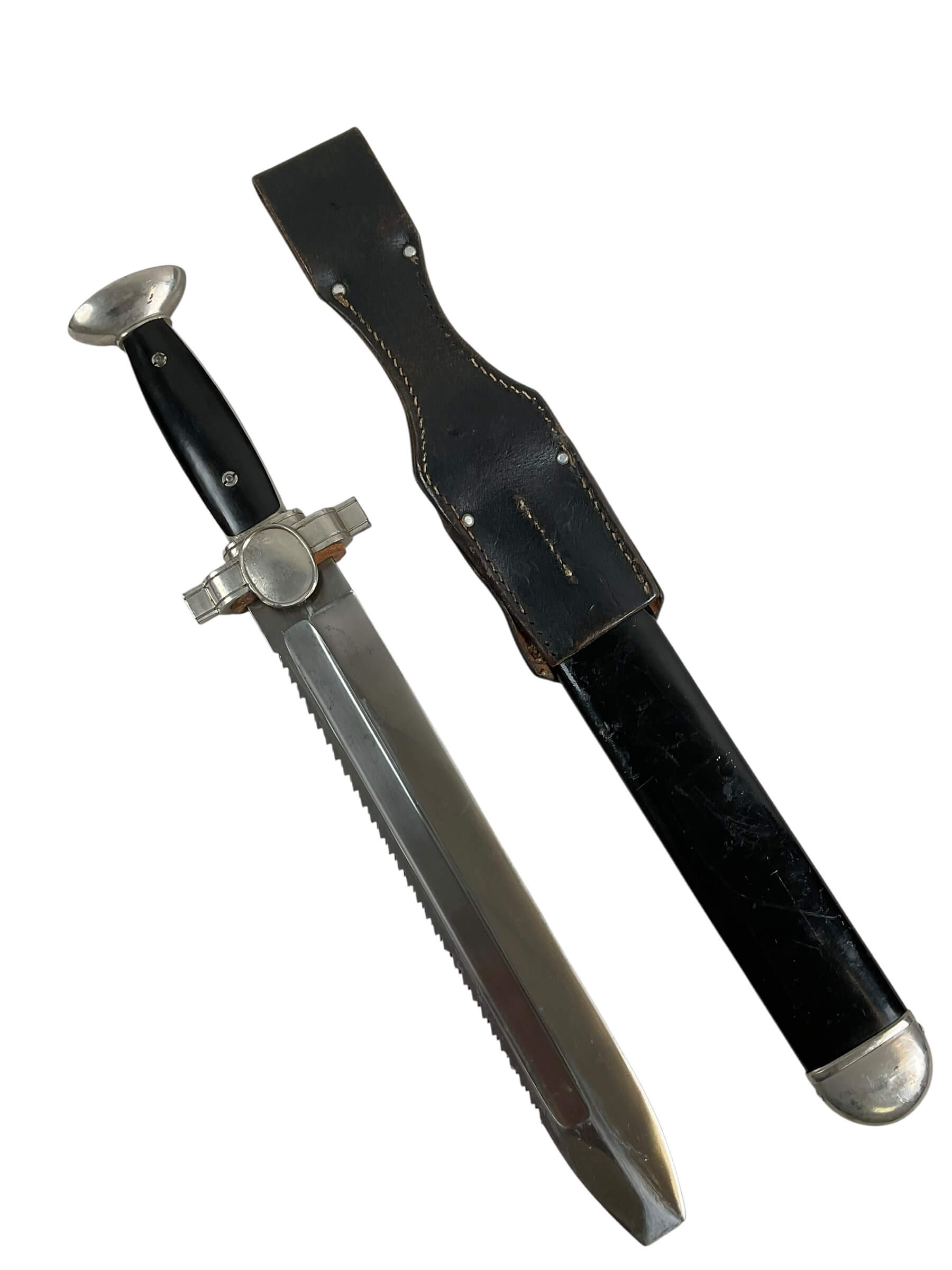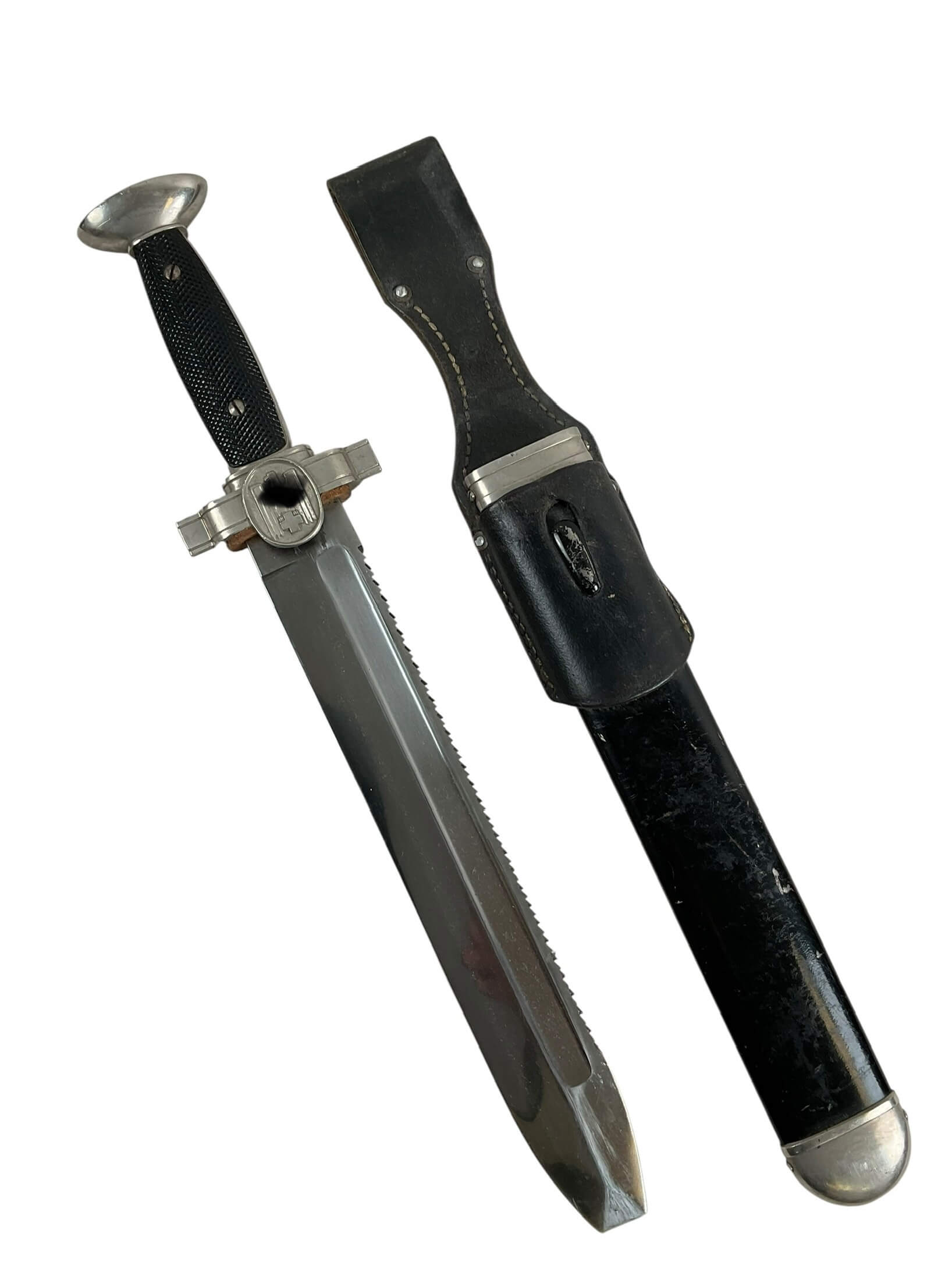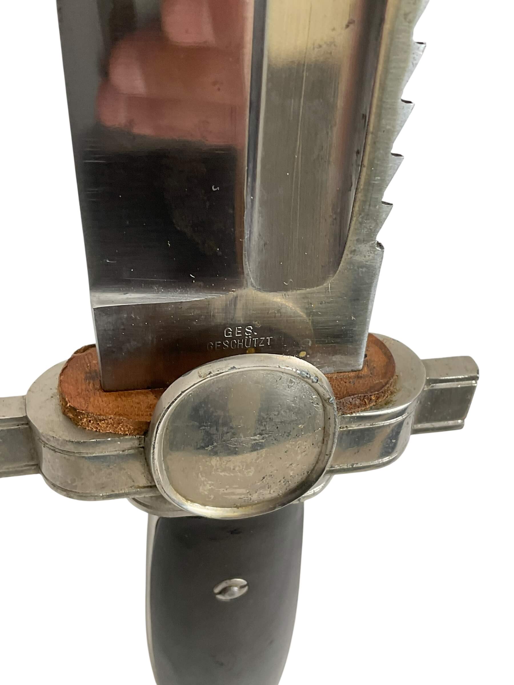 The WW2 German Red Cross Hewer with Frog is a striking piece of history, showcasing the craftsmanship of an era marked by conflict. This hewer, a type of knife traditionally used in military and rescue operations, was specifically designed for use by the German Red Cross during the Second World War. The hewer features a single-edged blade, a metal hilt, and a protective sheath or ‘frog’. The frog, made of sturdy leather, was designed to secure the hewer to a belt for easy access. The hewer is embellished with various insignia, including the Red Cross emblem and markings of the German Reich. The WW2 German Red Cross Hewer with Frog is not just a weapon, but a symbol of the Red Cross’ humanitarian efforts amidst the brutality of war. It is a significant artifact for history enthusiasts and collectors alike, offering a tangible connection to an intense period of world history.