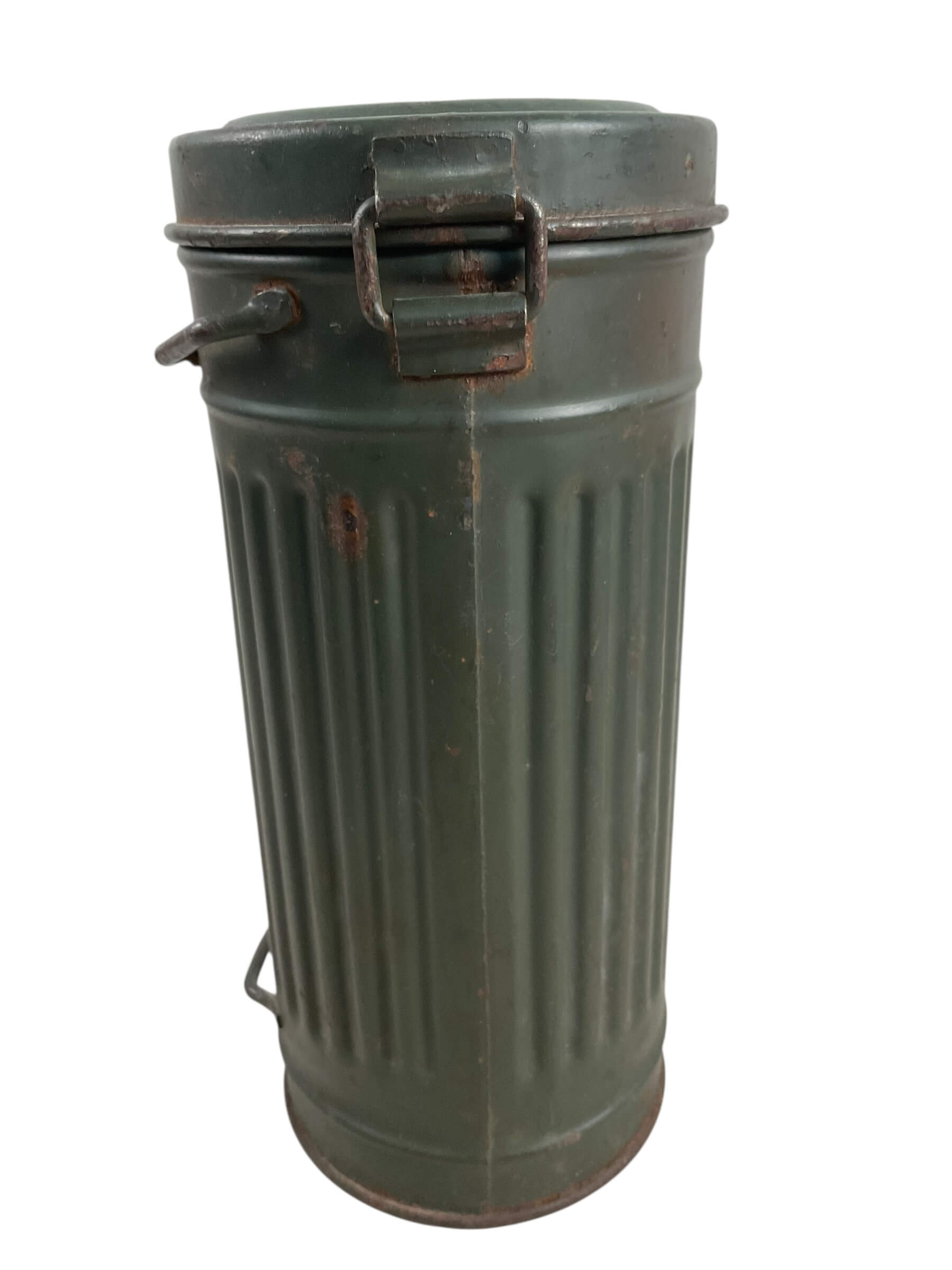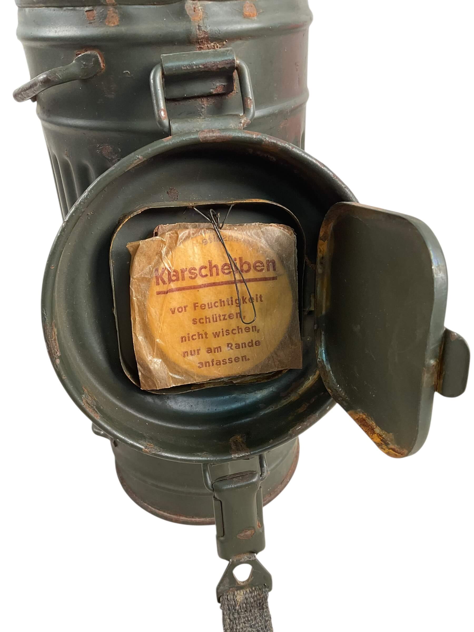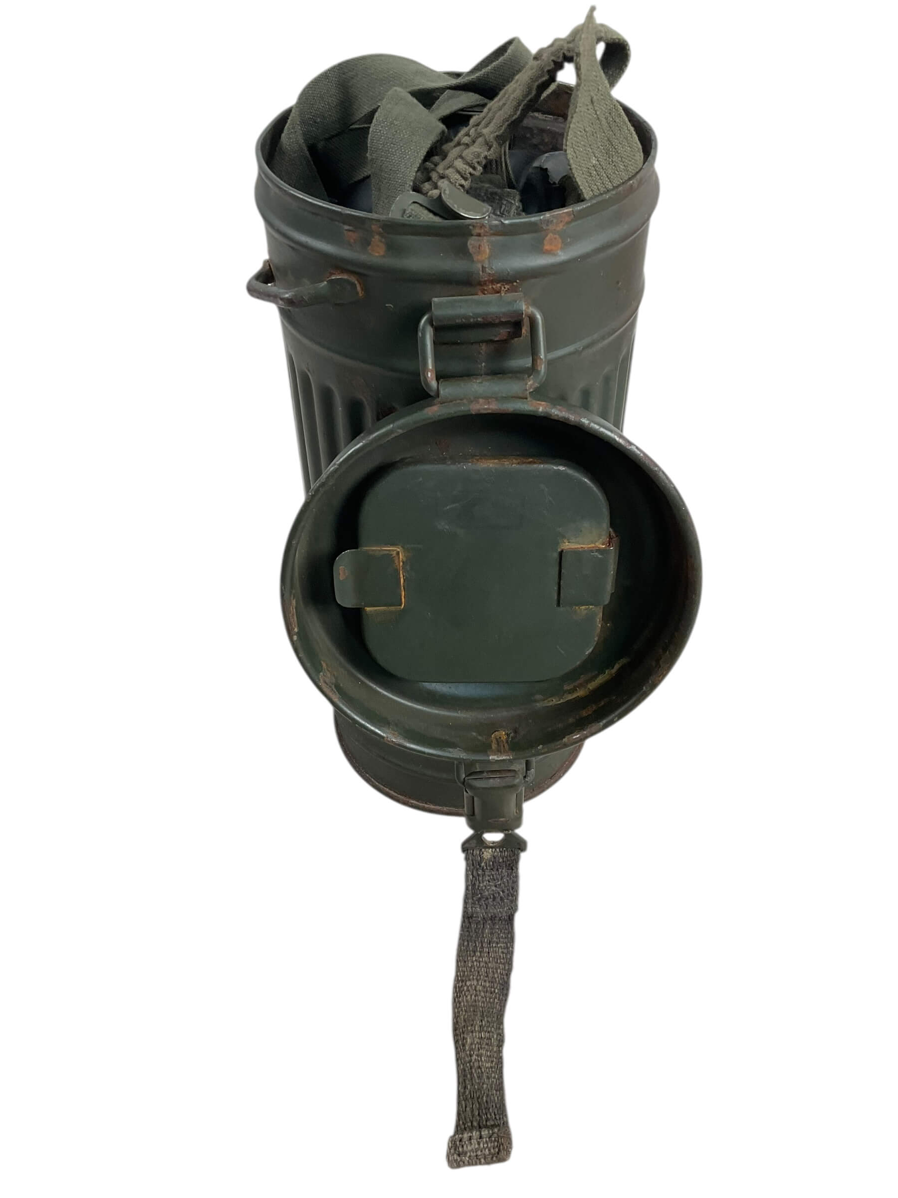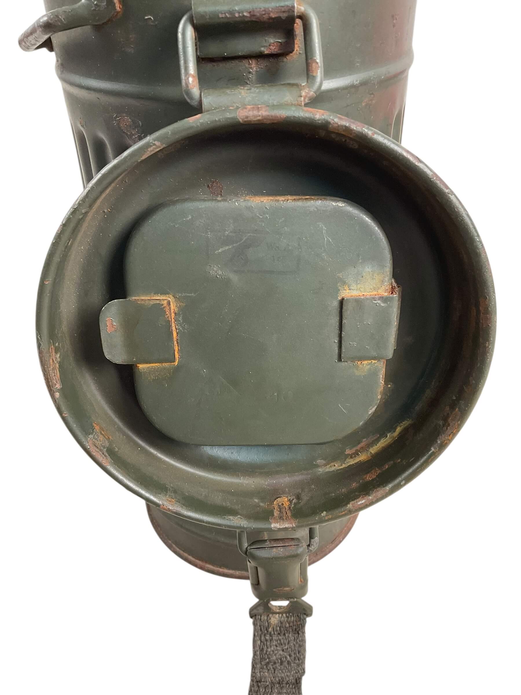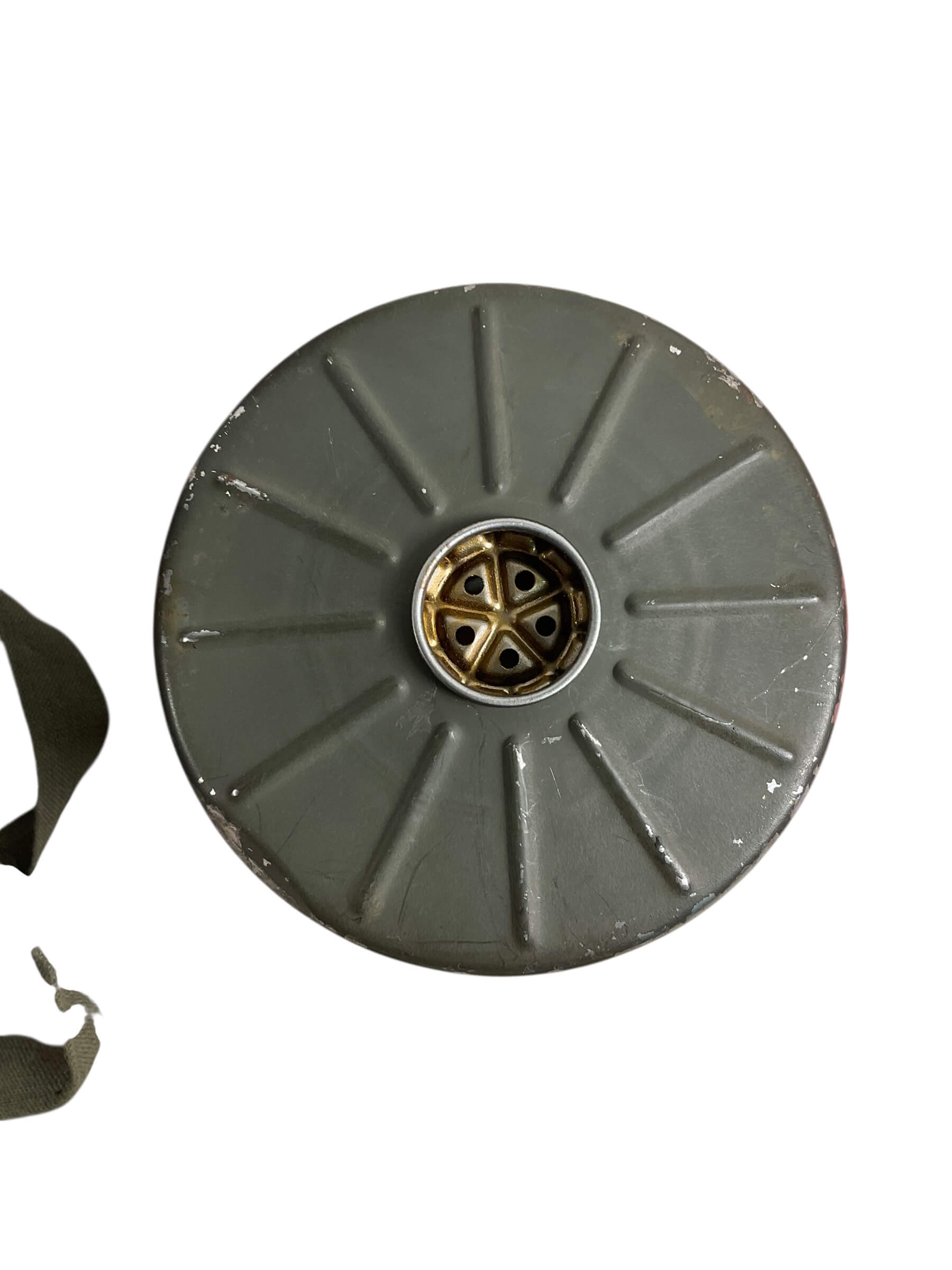 The WW2 German Respirator in Tin Size 5 1/2 is a historical artifact from the Second World War. It’s a German-made respiratory protection device, designed for gas warfare. The respirator comes enclosed in a tin of 5 1/2 inches diameter. It reflects the military equipment standard of the mentioned era. Authenticity not verified.