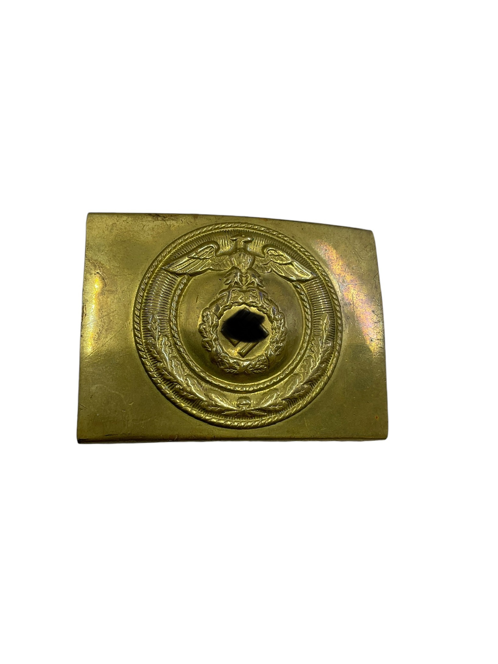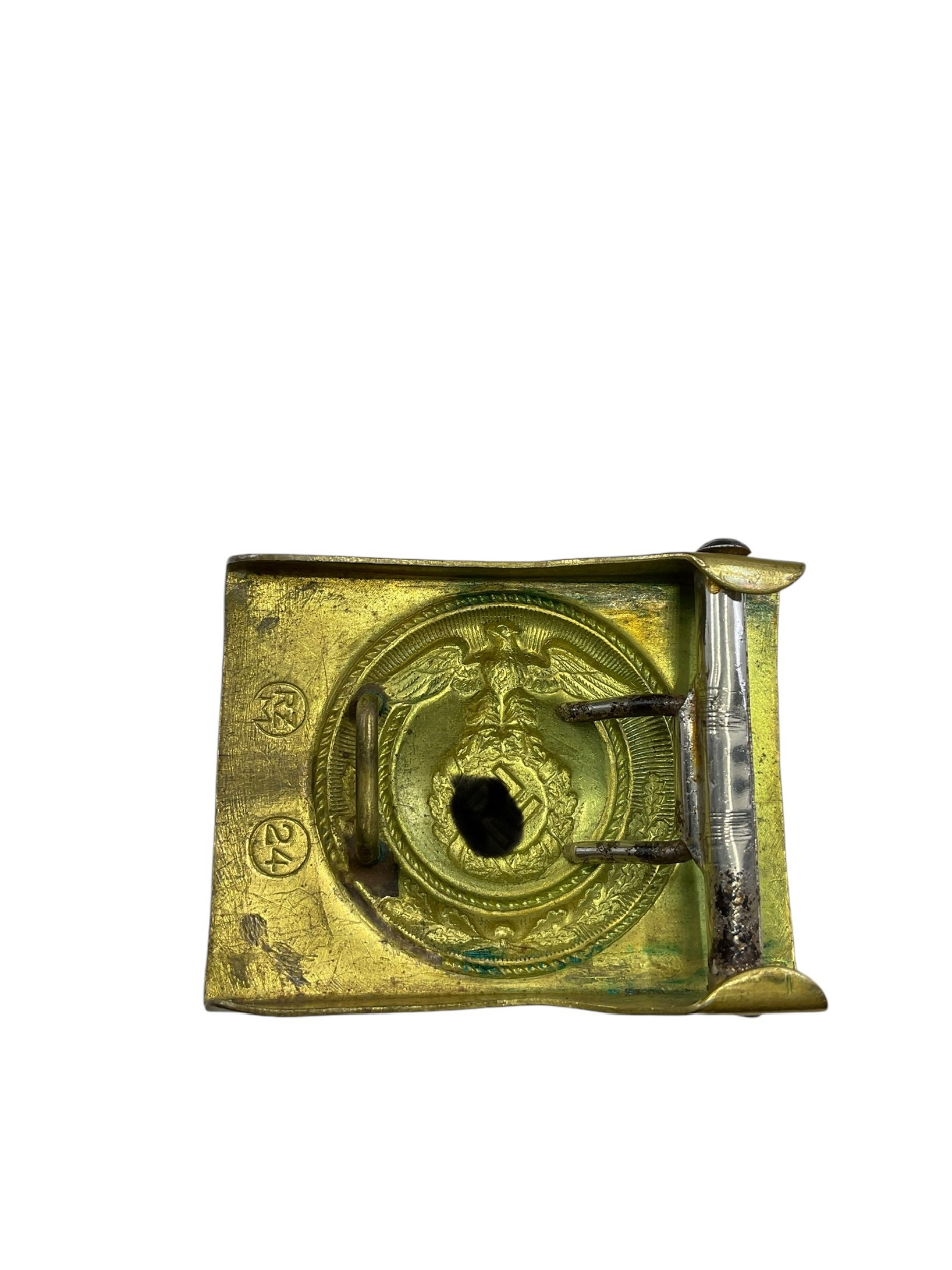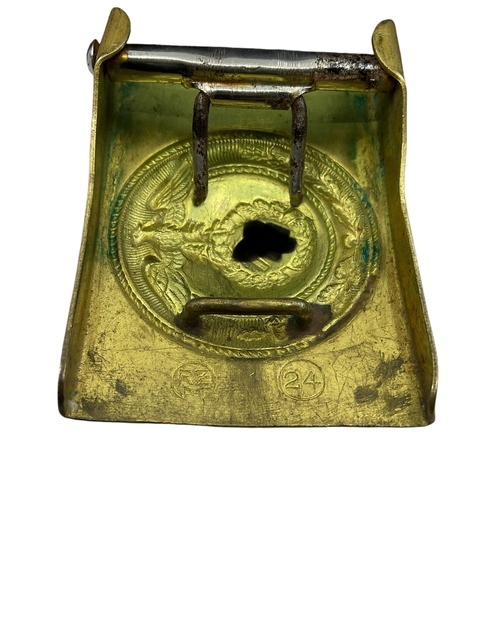 This item is a genuine and rare piece of WWII history: a German SA (Sturmabteilung, also known as the ‘Storm Battalion’) belt buckle, marked with the RZM 24 insignia. The buckle, made from robust, high-quality metal, features the eagle emblem, symbolizing the power of the Nazi era. It showcases fine detailing and craftsmanship, reflective of the period. The RZM 24 mark signifies that it was produced by Overhoff & Cie of Lüdenscheid, a known manufacturer of such items during the WWII era. Accompanying the buckle is an original brown leather belt, well-preserved with signs of wear that only add to its historical value. Its robust construction and rich, warm patina speak volumes about its journey through time. This combination of the German SA belt buckle and leather belt is a significant collectible, offering a tangible link to one of the most impactful periods of world