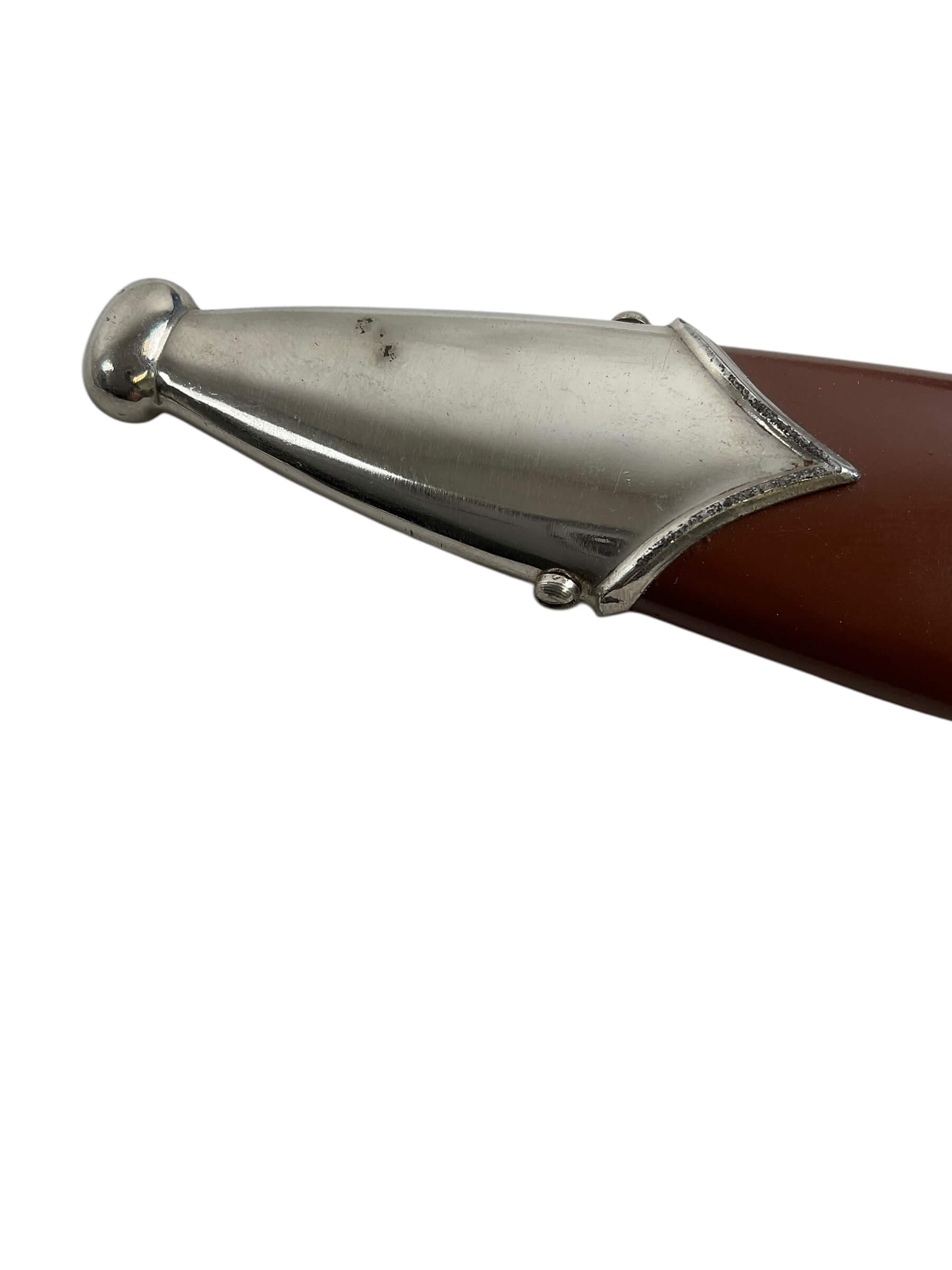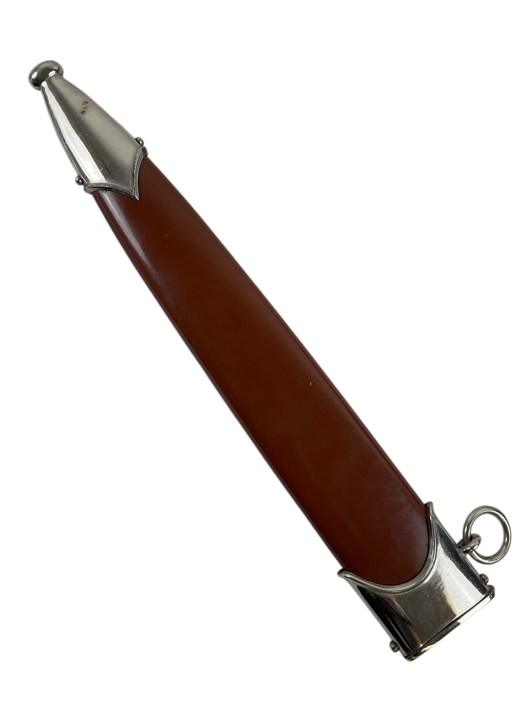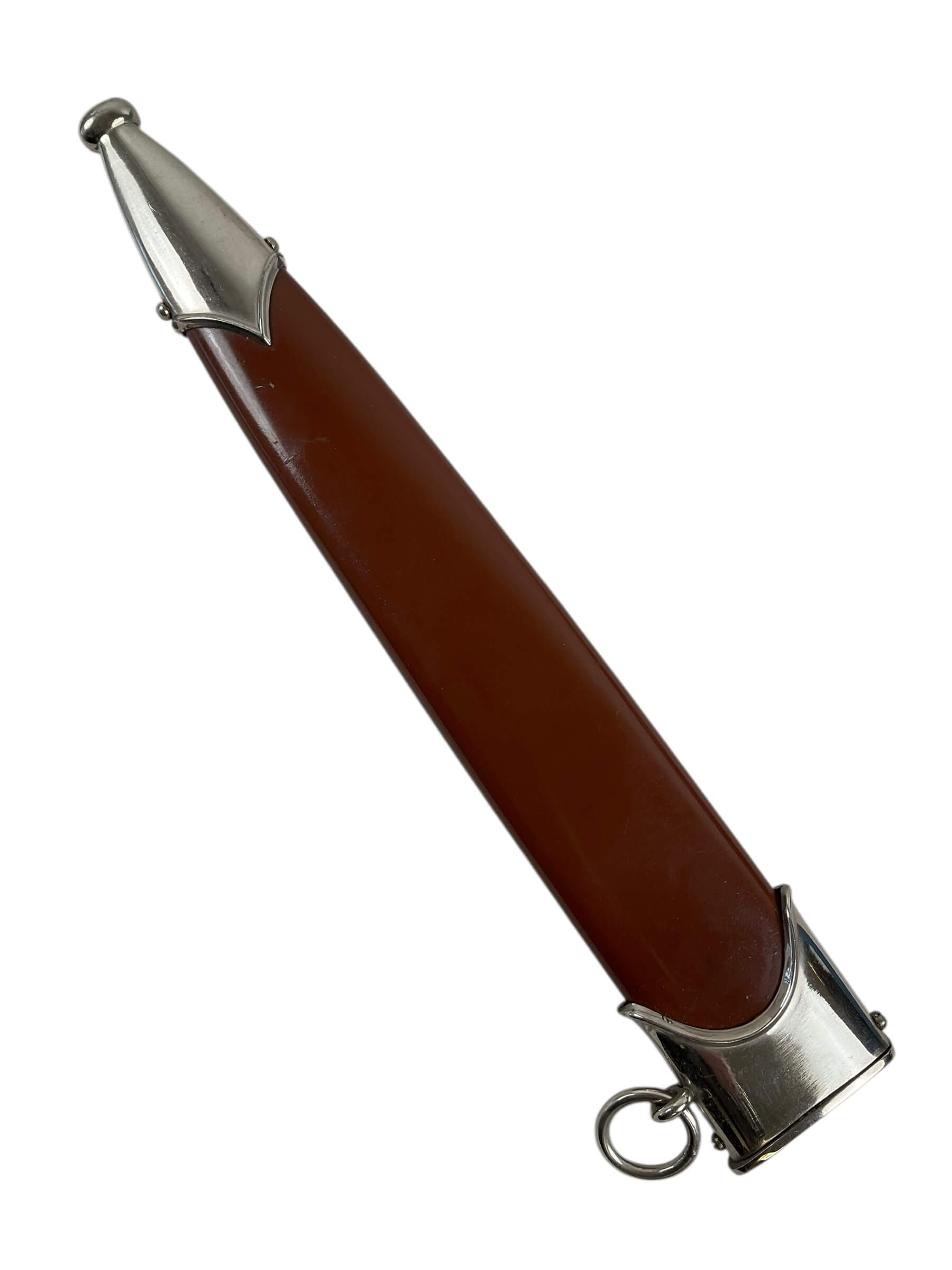 This item is a WW2 German SA Dagger Scabbard, a rare collectible for history and military enthusiasts. The SA, or Sturmabteilung, was the Nazi party’s original paramilitary wing. Their daggers, originally a part of their uniform, later became sought-after collector’s items. This particular scabbard, designed to hold the dagger, is missing its internal throat. This is the component that secures the dagger within the scabbard and protects the blade. Despite this missing piece, the scabbard remains a piece of significant historical value. Its rich patina and original markings provide a glimpse into the past, making it a unique addition to any collection. This item is ideal for those interested in WWII memorabilia or military history. Please note, however, that due to the missing internal throat, it may not securely hold a dagger.
