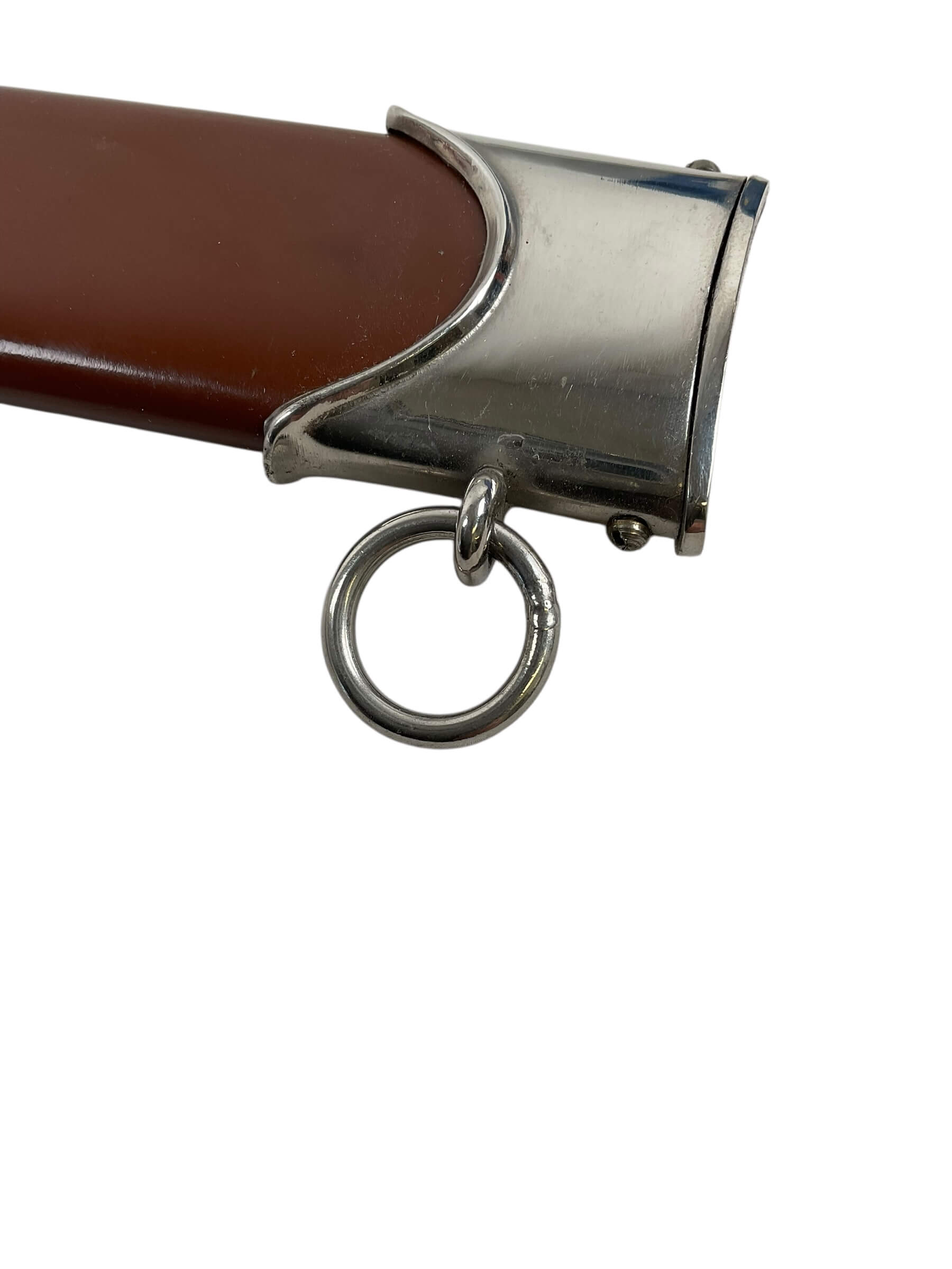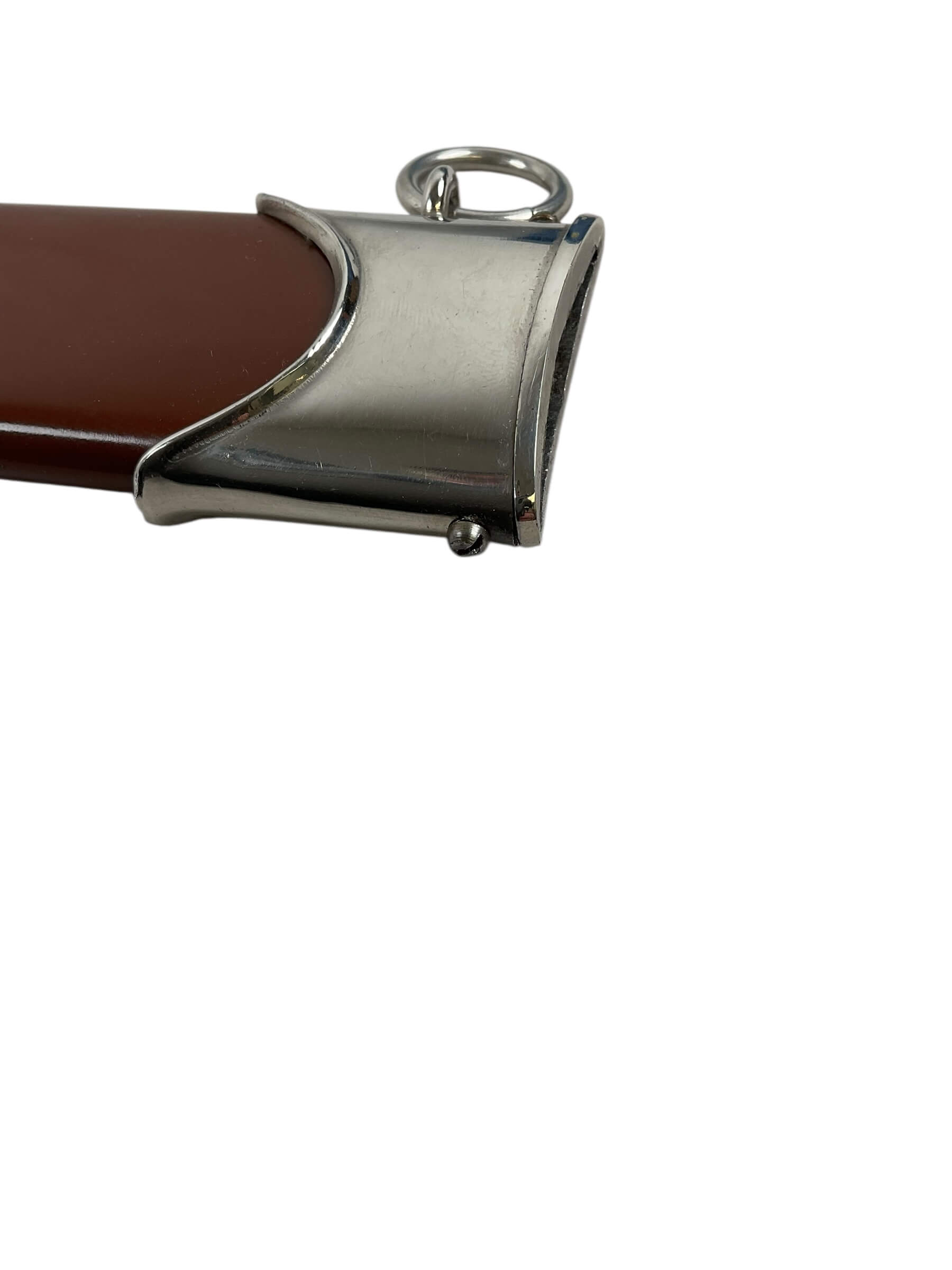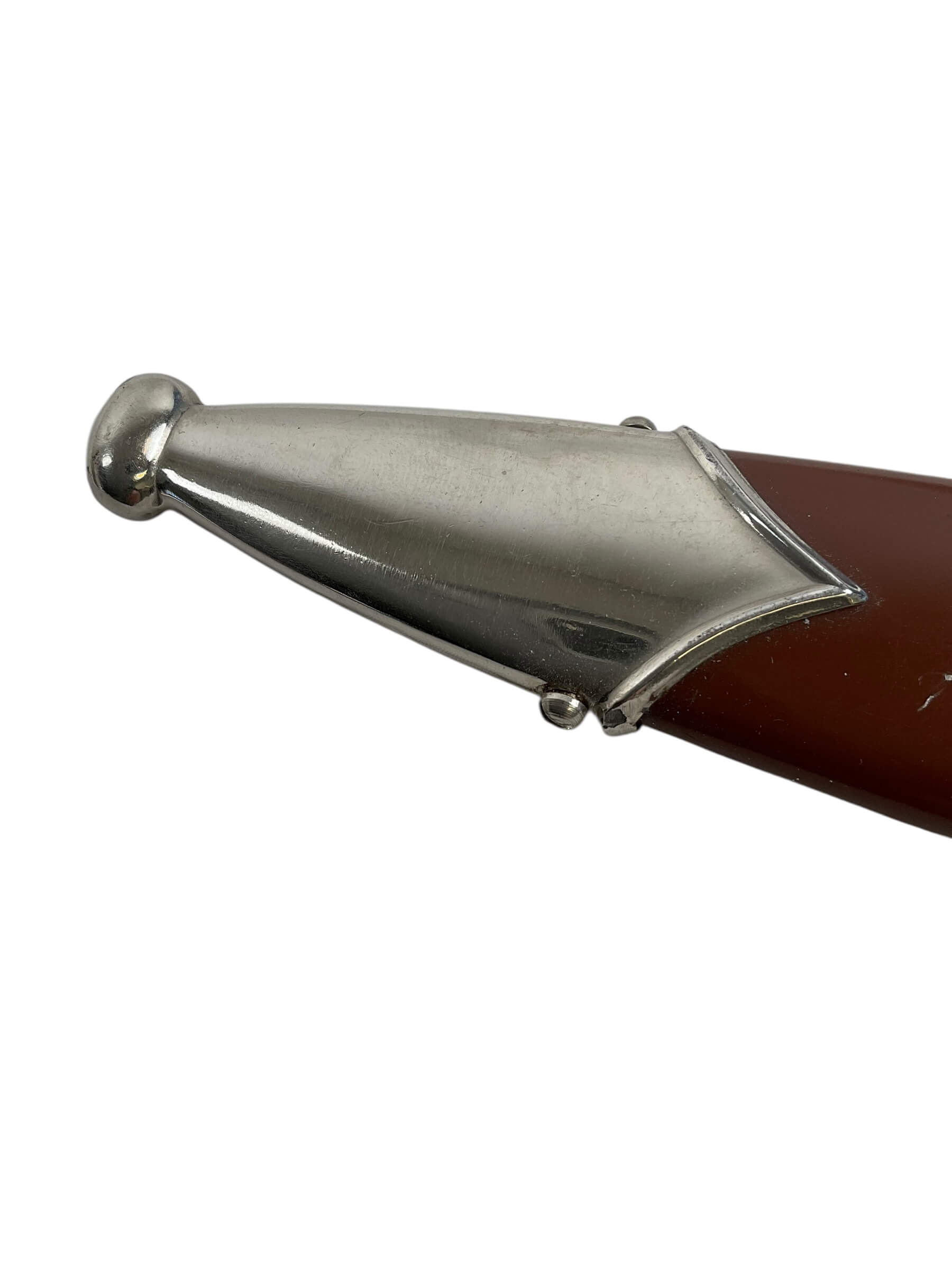 This item is a WW2 German SA Dagger Scabbard, a rare collectible for history and military enthusiasts. The SA, or Sturmabteilung, was the Nazi party’s original paramilitary wing. Their daggers, originally a part of their uniform, later became sought-after collector’s items. This particular scabbard, designed to hold the dagger, is missing its internal throat. This is the component that secures the dagger within the scabbard and protects the blade. Despite this missing piece, the scabbard remains a piece of significant historical value. Its rich patina and original markings provide a glimpse into the past, making it a unique addition to any collection. This item is ideal for those interested in WWII memorabilia or military history. Please note, however, that due to the missing internal throat, it may not securely hold a dagger.