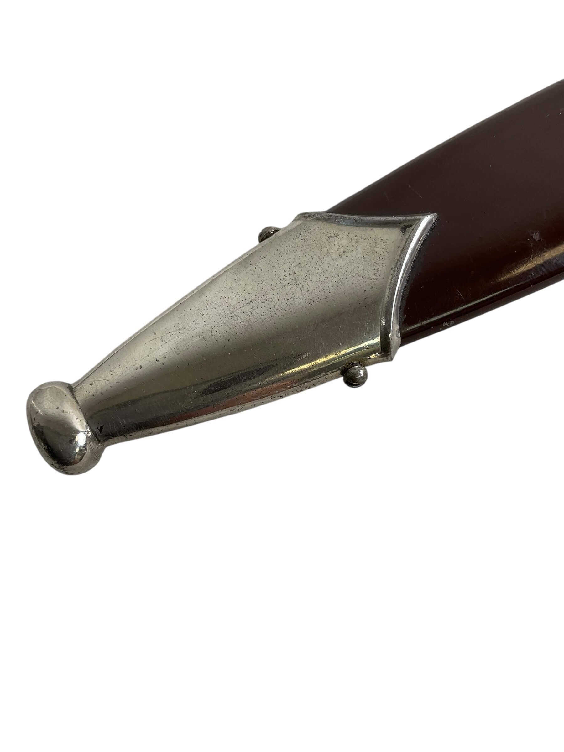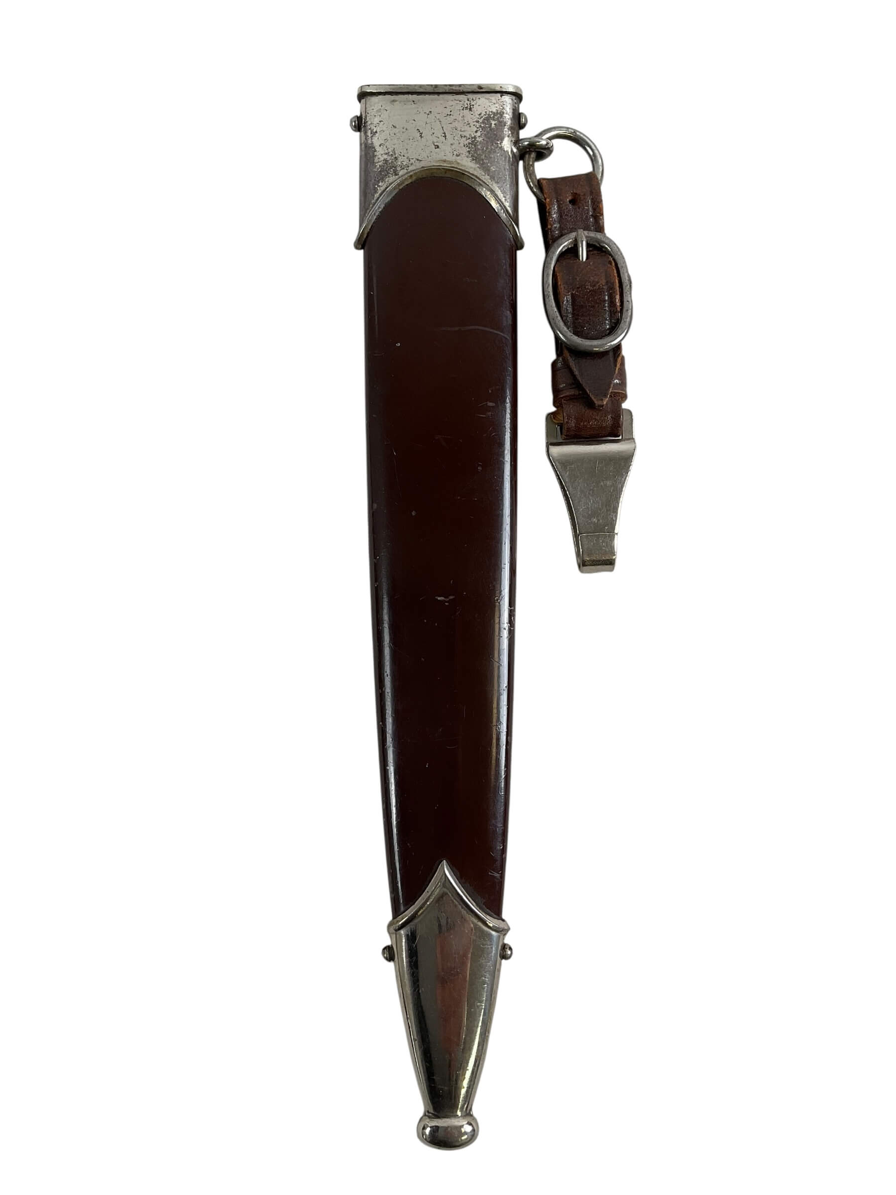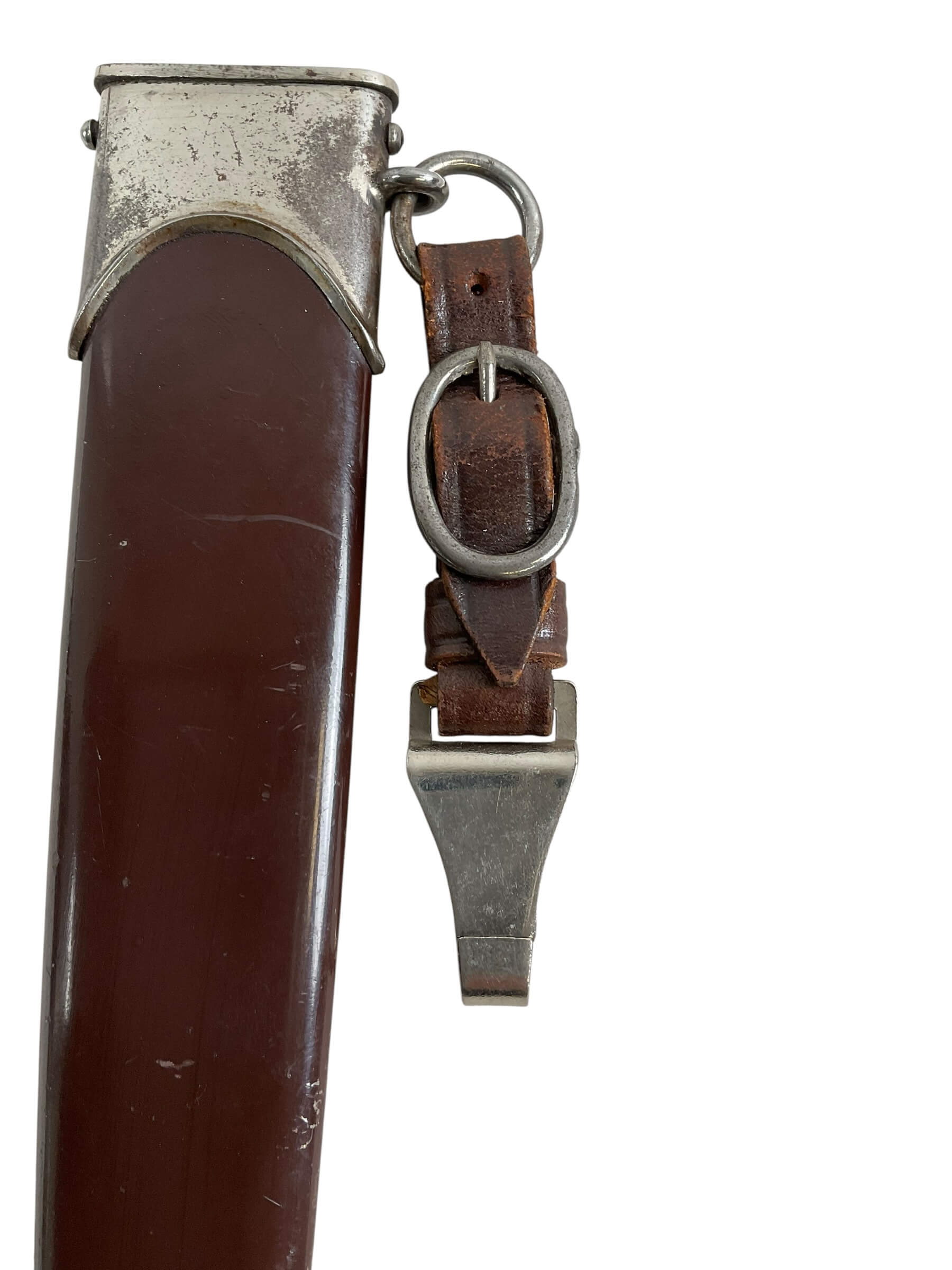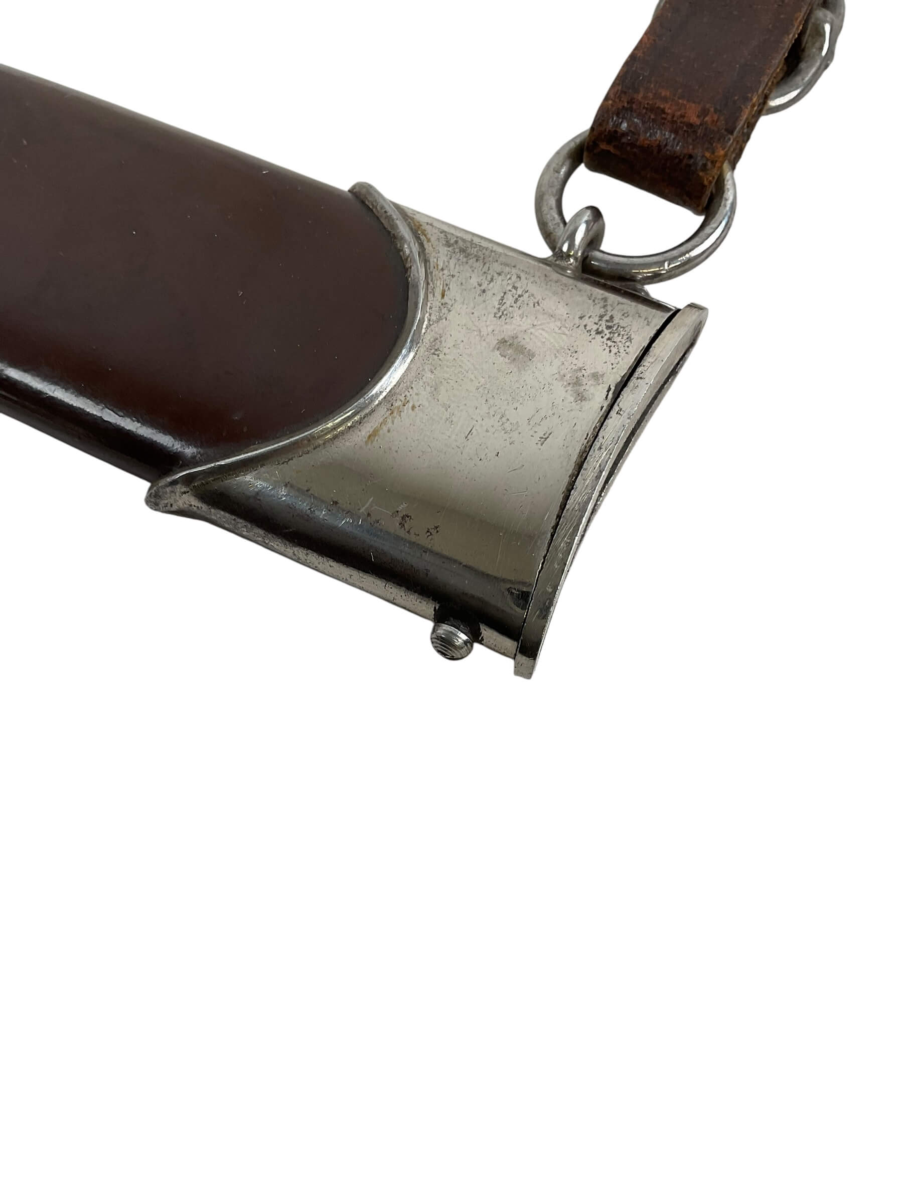 This WWII German SA Parts Dagger with Scabbard RZM M7/9 Maker is an authentic artifact from a critical period in history. This dagger, also known as a service dagger, was used by the Sturmabteilung (SA), the original paramilitary wing of the Nazi Party. The blade is marked with the RZM M7/9 insignia, indicating it was made by Klittermann & Moog and Hartkopf, renowned German manufacturers. The dagger comes with its original scabbard, adding to its historical value. The handle is meticulously crafted with wooden grips, while the blade is made of steel, exhibiting the high-quality German craftsmanship of the era. This item is not only a weapon but also an emblem of power and status. It provides an insightful glimpse into the ideologies and aesthetics of the era, making it an invaluable piece for collectors and history enthusiasts alike.