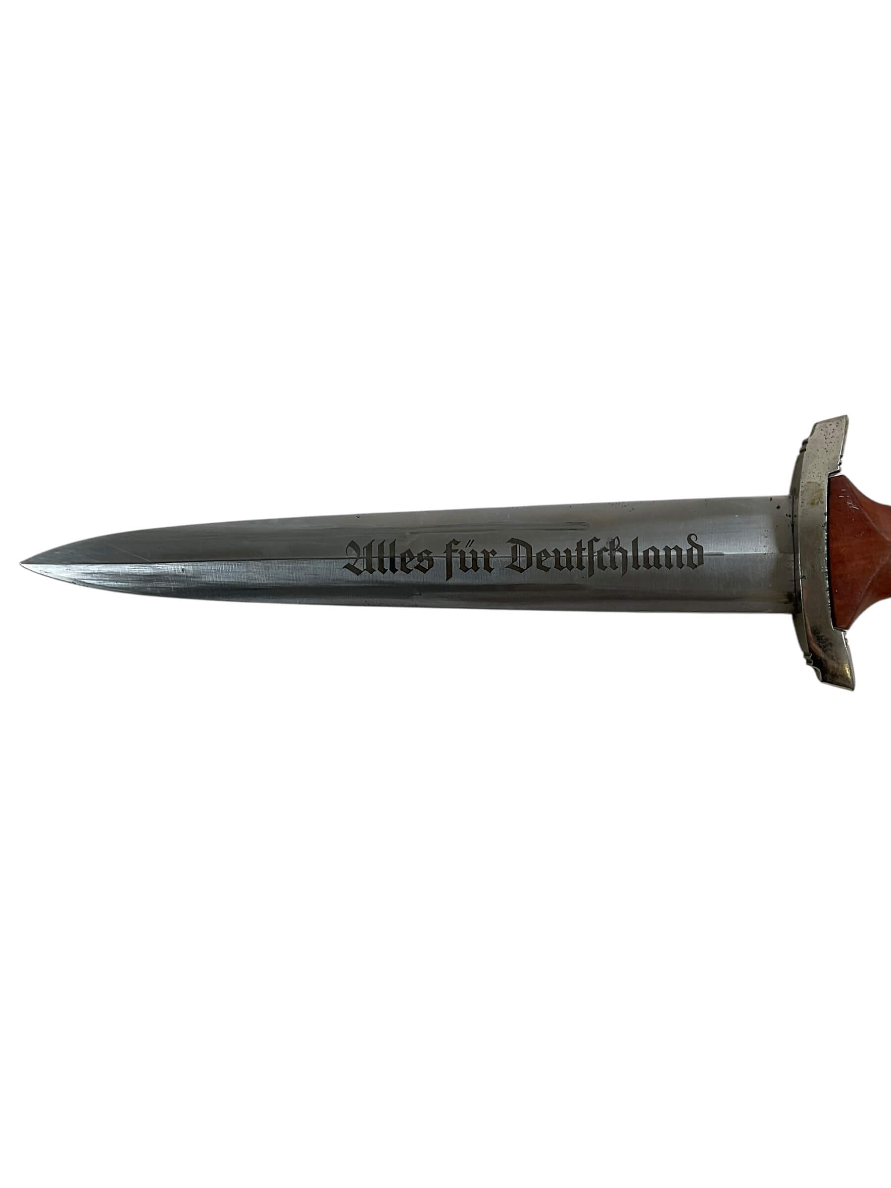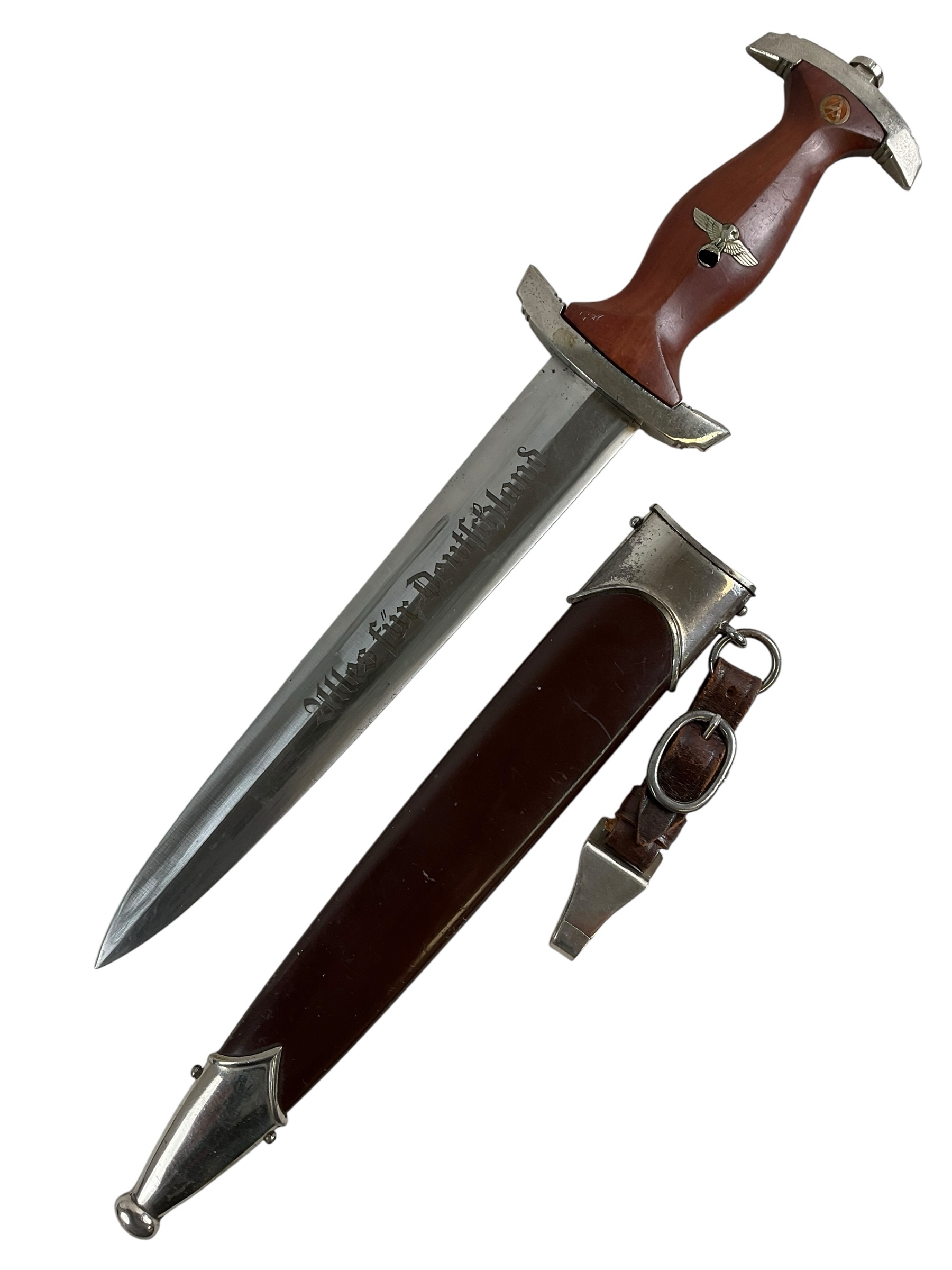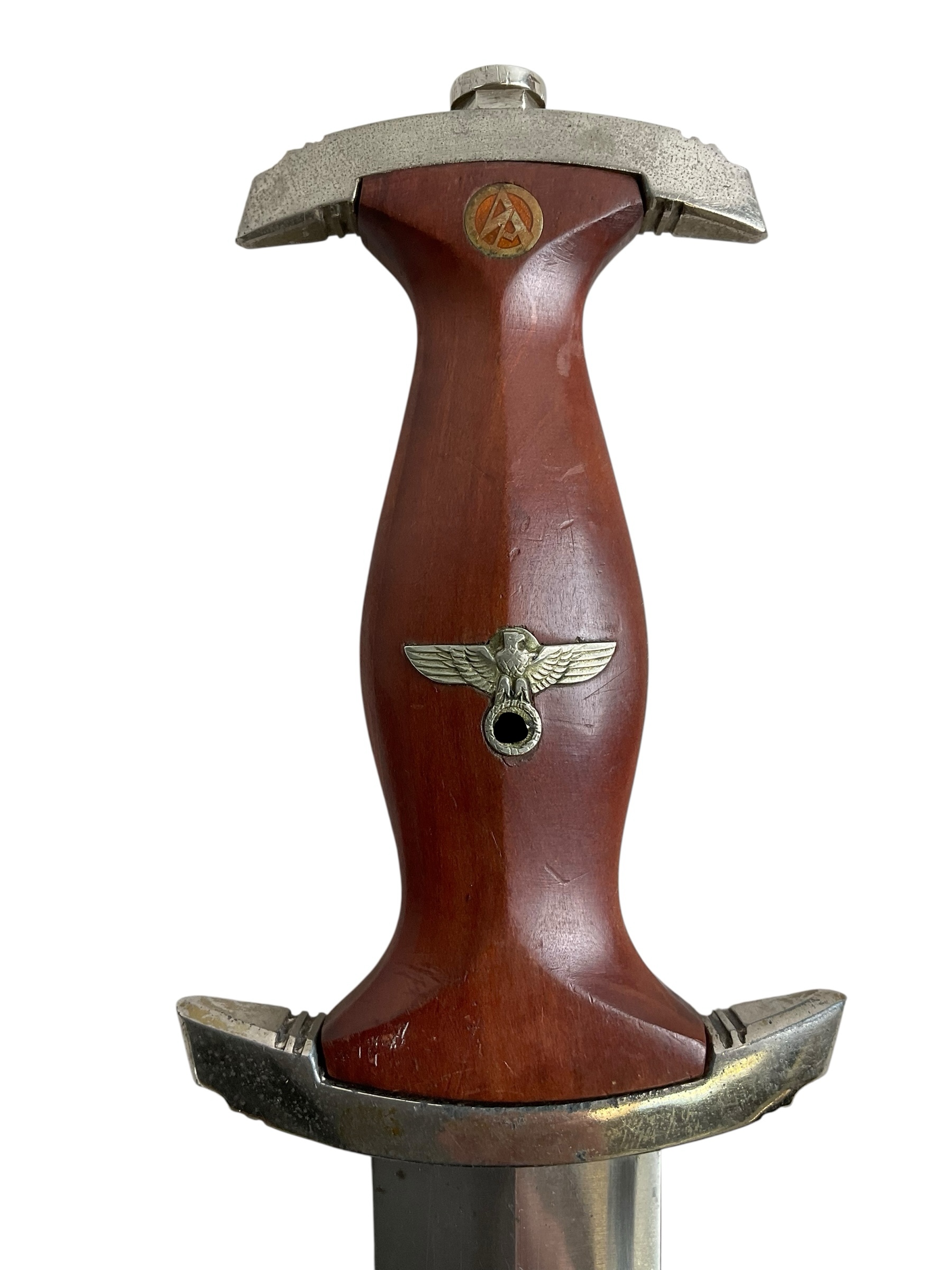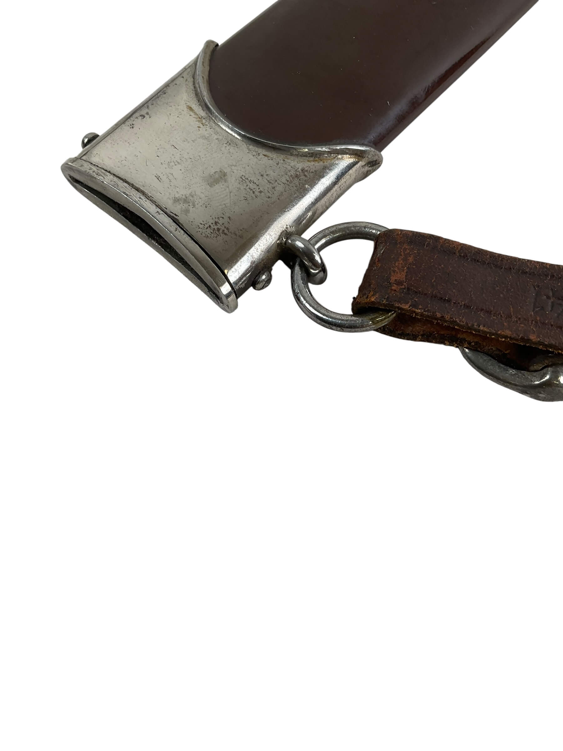 This WWII German SA Parts Dagger with Scabbard RZM M7/9 Maker is an authentic artifact from a critical period in history. This dagger, also known as a service dagger, was used by the Sturmabteilung (SA), the original paramilitary wing of the Nazi Party. The blade is marked with the RZM M7/9 insignia, indicating it was made by Klittermann & Moog and Hartkopf, renowned German manufacturers. The dagger comes with its original scabbard, adding to its historical value. The handle is meticulously crafted with wooden grips, while the blade is made of steel, exhibiting the high-quality German craftsmanship of the era. This item is not only a weapon but also an emblem of power and status. It provides an insightful glimpse into the ideologies and aesthetics of the era, making it an invaluable piece for collectors and history enthusiasts alike.