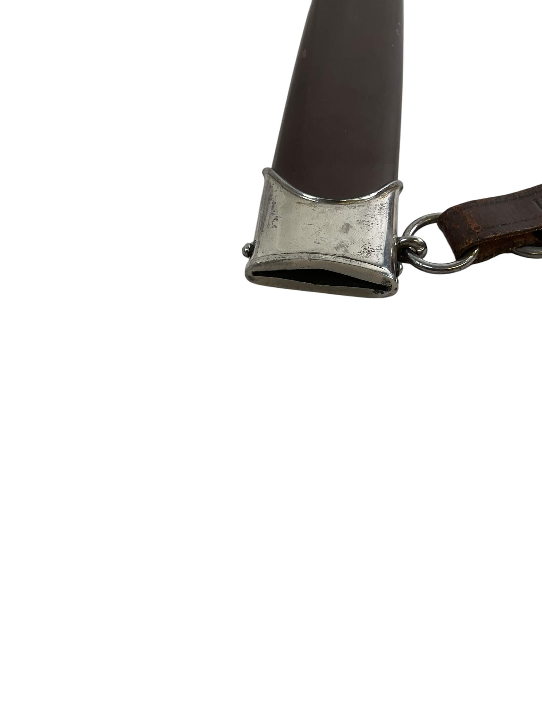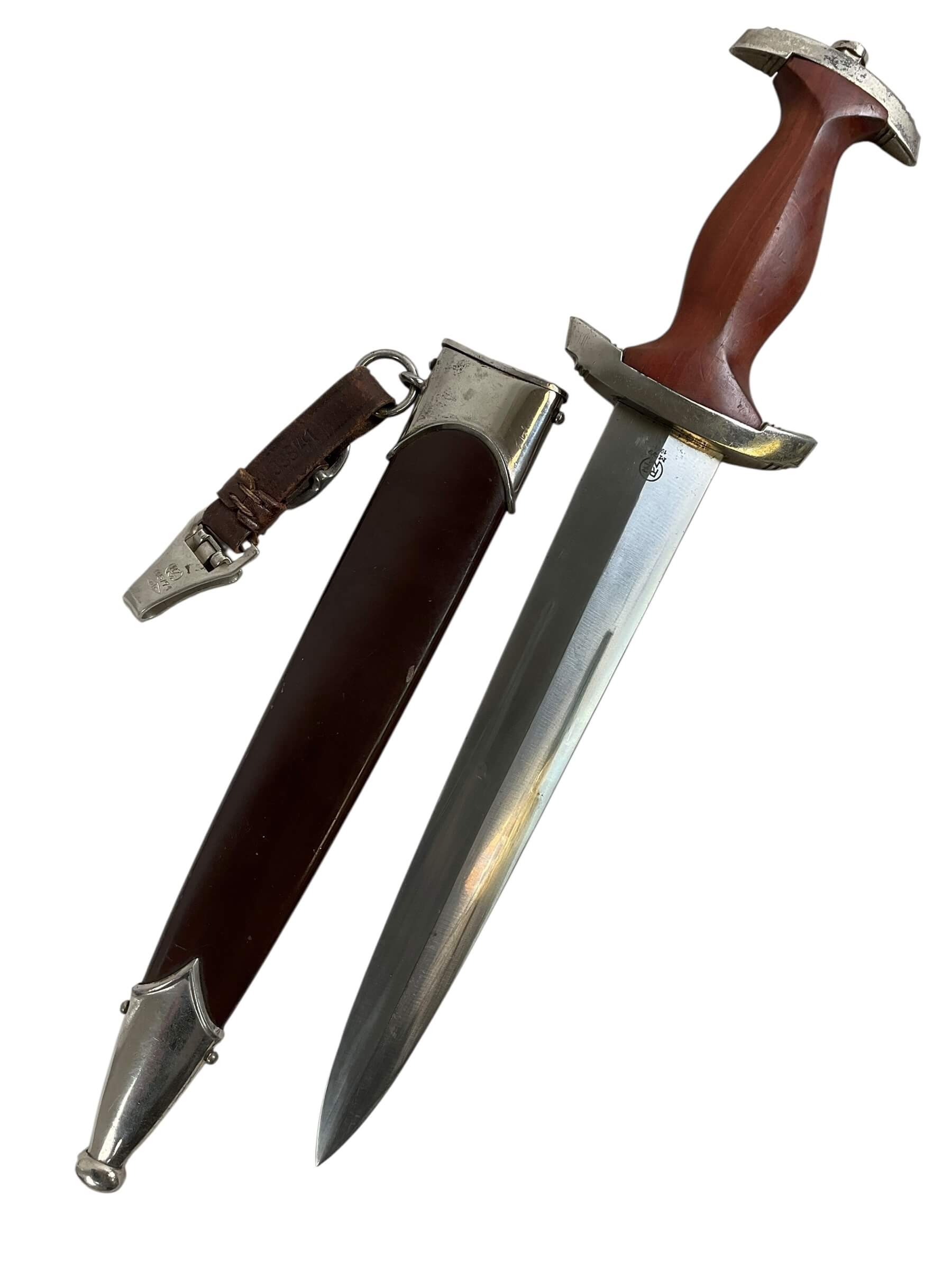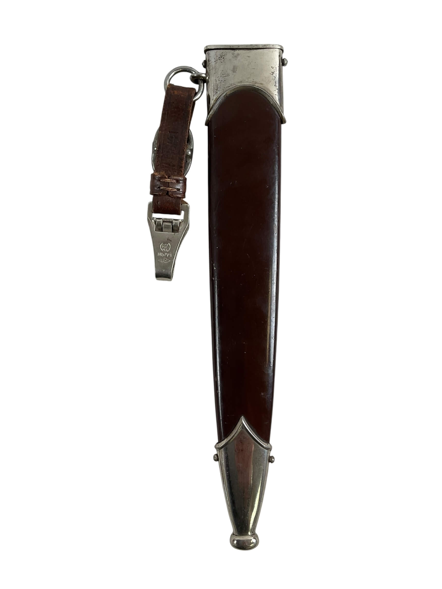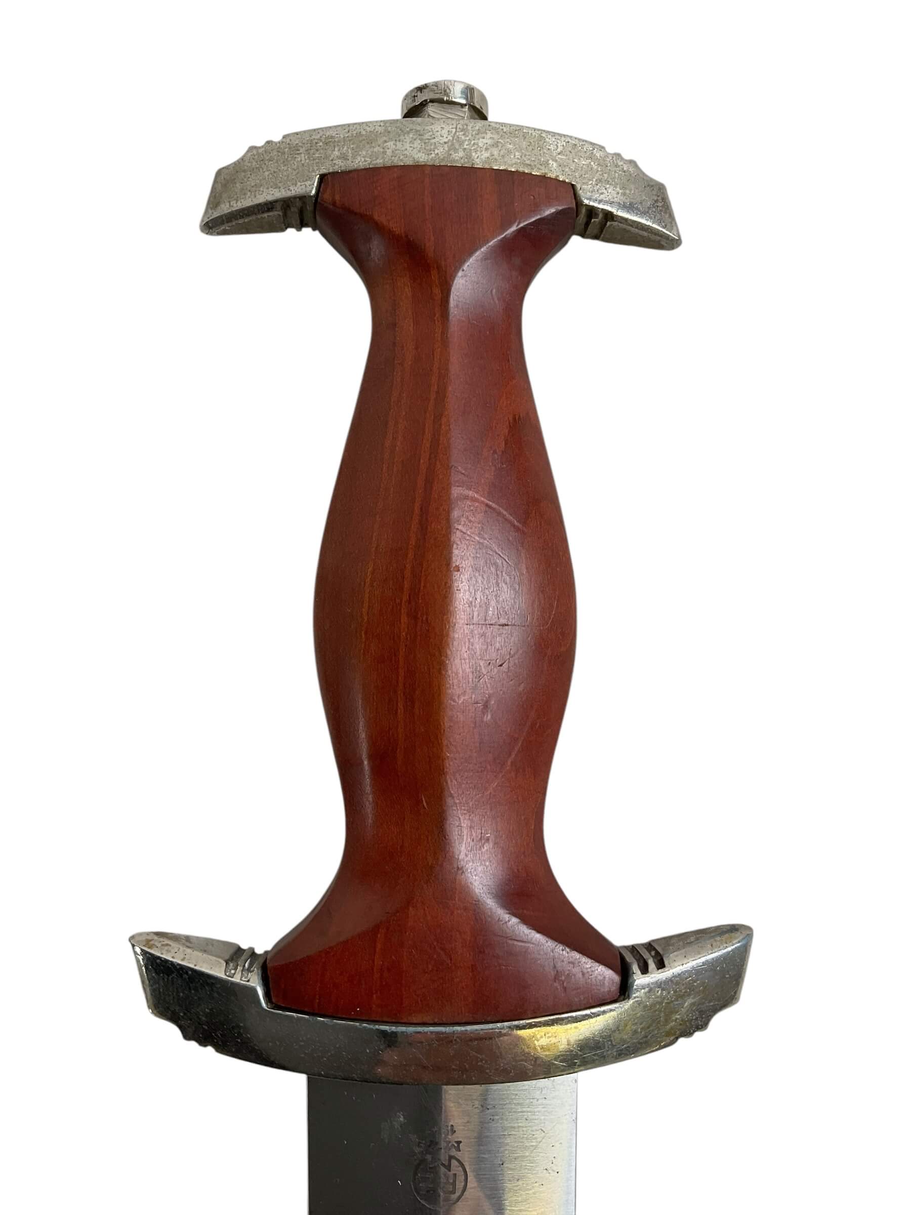 This WWII German SA Parts Dagger with Scabbard RZM M7/9 Maker is an authentic artifact from a critical period in history. This dagger, also known as a service dagger, was used by the Sturmabteilung (SA), the original paramilitary wing of the Nazi Party. The blade is marked with the RZM M7/9 insignia, indicating it was made by Klittermann & Moog and Hartkopf, renowned German manufacturers. The dagger comes with its original scabbard, adding to its historical value. The handle is meticulously crafted with wooden grips, while the blade is made of steel, exhibiting the high-quality German craftsmanship of the era. This item is not only a weapon but also an emblem of power and status. It provides an insightful glimpse into the ideologies and aesthetics of the era, making it an invaluable piece for collectors and history enthusiasts alike.