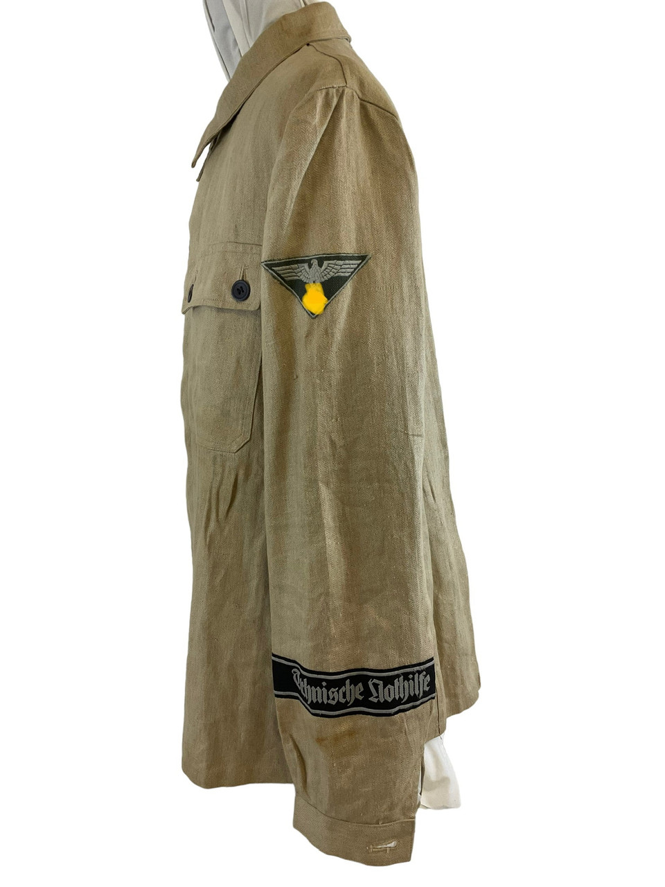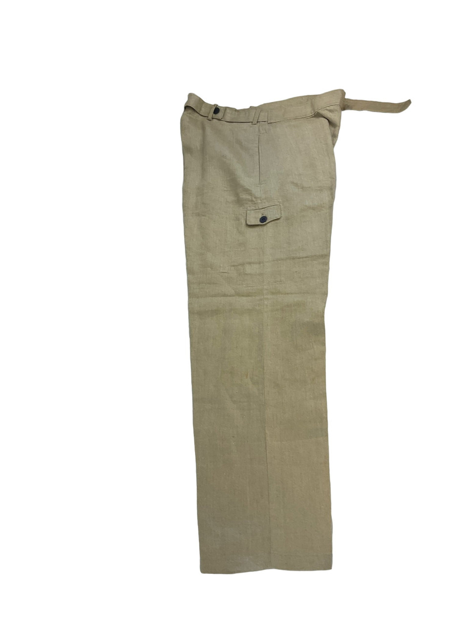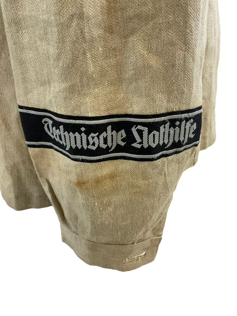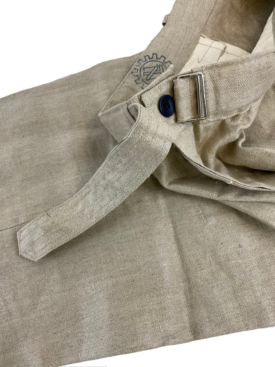 The WW2 German TENO HBT Drill Cream Coloured Tunic and Matching Trousers are an authentic representation of historical military attire. Crafted from durable herringbone twill (HBT) fabric, this set was designed for work and drill purposes, offering both utility and comfort. The cream-colored tunic features practical pockets and button closures, reflecting the functional design philosophy of the era. Matched with corresponding trousers, this ensemble provides a cohesive and professional appearance. Both pieces exhibit meticulous attention to detail, enhancing their historical value. Ideal for collectors, reenactors, or history enthusiasts, this uniform set not only signifies the uniformity and discipline of TENO (Technische Nothilfe) during World War II but also serves as a tangible link to the past, preserving the essence of a bygone military tradition.
