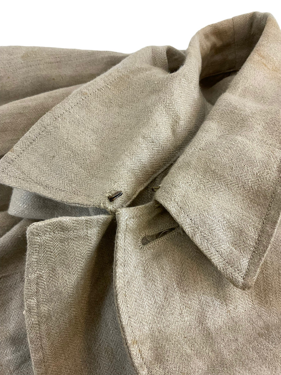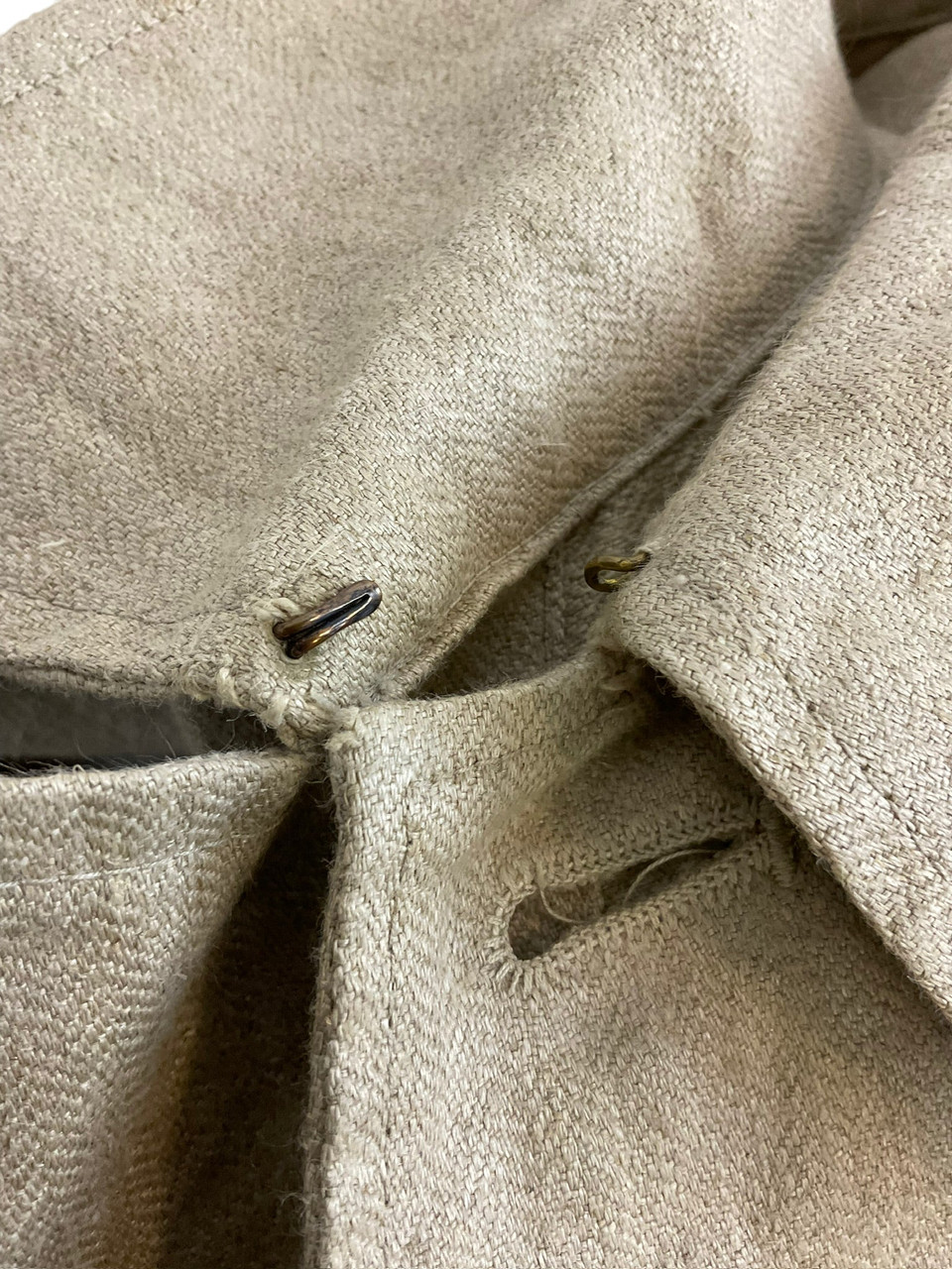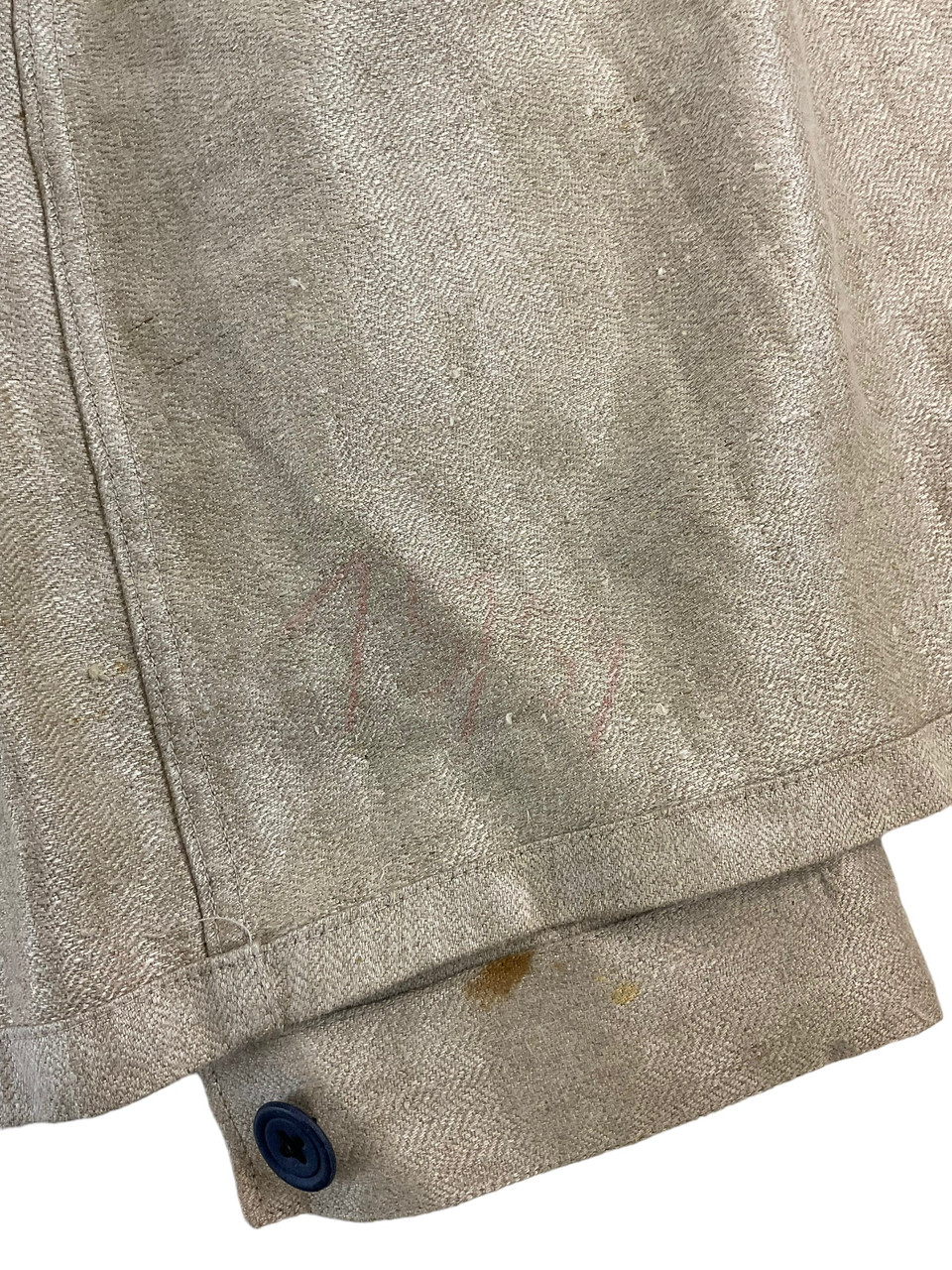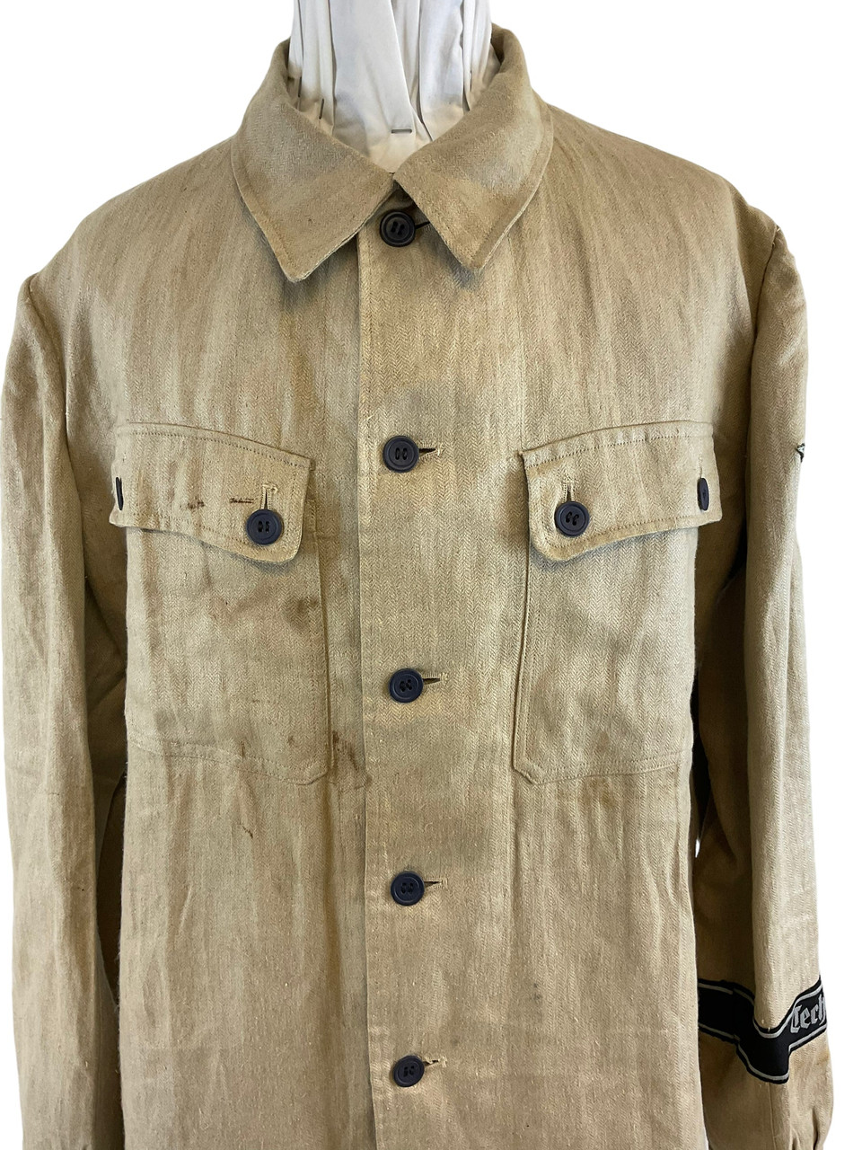 The WW2 German TENO HBT Drill Cream Coloured Tunic and Matching Trousers are an authentic representation of historical military attire. Crafted from durable herringbone twill (HBT) fabric, this set was designed for work and drill purposes, offering both utility and comfort. The cream-colored tunic features practical pockets and button closures, reflecting the functional design philosophy of the era. Matched with corresponding trousers, this ensemble provides a cohesive and professional appearance. Both pieces exhibit meticulous attention to detail, enhancing their historical value. Ideal for collectors, reenactors, or history enthusiasts, this uniform set not only signifies the uniformity and discipline of TENO (Technische Nothilfe) during World War II but also serves as a tangible link to the past, preserving the essence of a bygone military tradition.