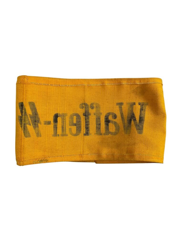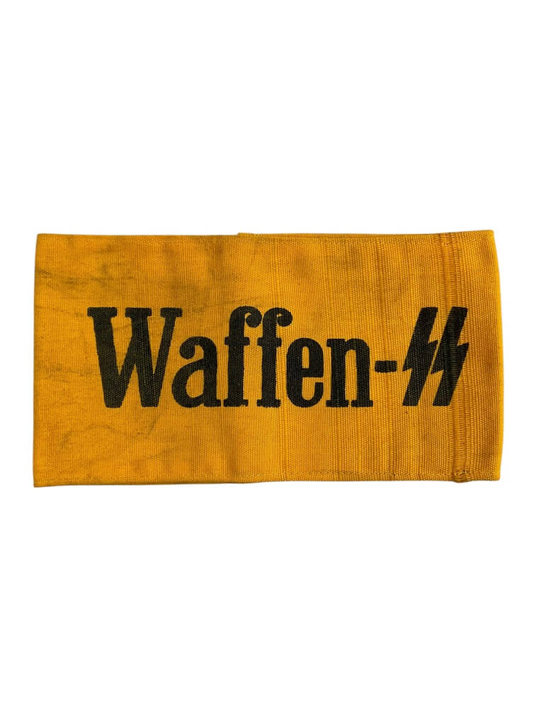 This item is a WW2 German Waffen-SS Yellow Printed Armband. This rare piece of history hails from the era of World War II and was used to distinguish members of the Waffen-SS, the combat branch of the infamous Schutzstaffel, or SS, of Nazi Germany. The armband is characterized by its distinctive yellow color, a striking contrast to the usual black and white insignia of the SS. The design features the iconic SS symbol printed directly onto the fabric, a detail that marks its authenticity and importance. The armband is a significant memento from one of the darkest chapters in human history, providing a tangible link to the past. It serves as a stark reminder of the dangers of extremism and the importance of learning from our history. The armband remains in good condition, making it a valuable addition for any collector specializing in WWII memorabilia.