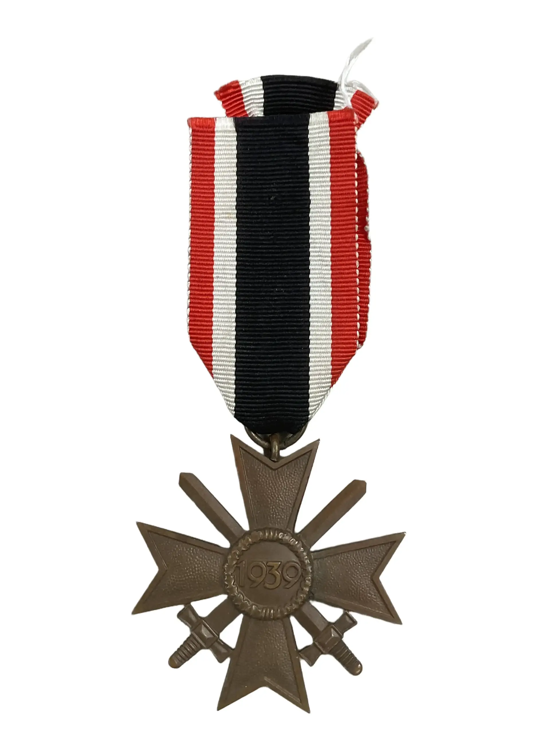 The WW2 German War Merit Cross 2nd Class With Swords No Maker Full Size Medal is a military decoration issued during the Second World War by Nazi Germany. Established on 18 October 1939, the War Merit Cross was awarded to military and civilian personnel for exceptional service not directly involving combat. The version with swords, such as this example, was specifically presented to individuals who performed acts of merit under combat conditions but not necessarily involving battlefield valor. This full-size medal is constructed from zinc or bronze alloy and measures approximately 48mm in width. The cross features a Maltese design with a central swastika on the obverse and crossed swords positioned between the cross’s arms, denoting merit in a combat-related capacity. The reverse is plain. As indicated by “No Maker,” this specimen does not display a manufacturer’s mark, which is typical of some late-war issues. The medal is typically accompanied by a red, white, and black ribbon.
