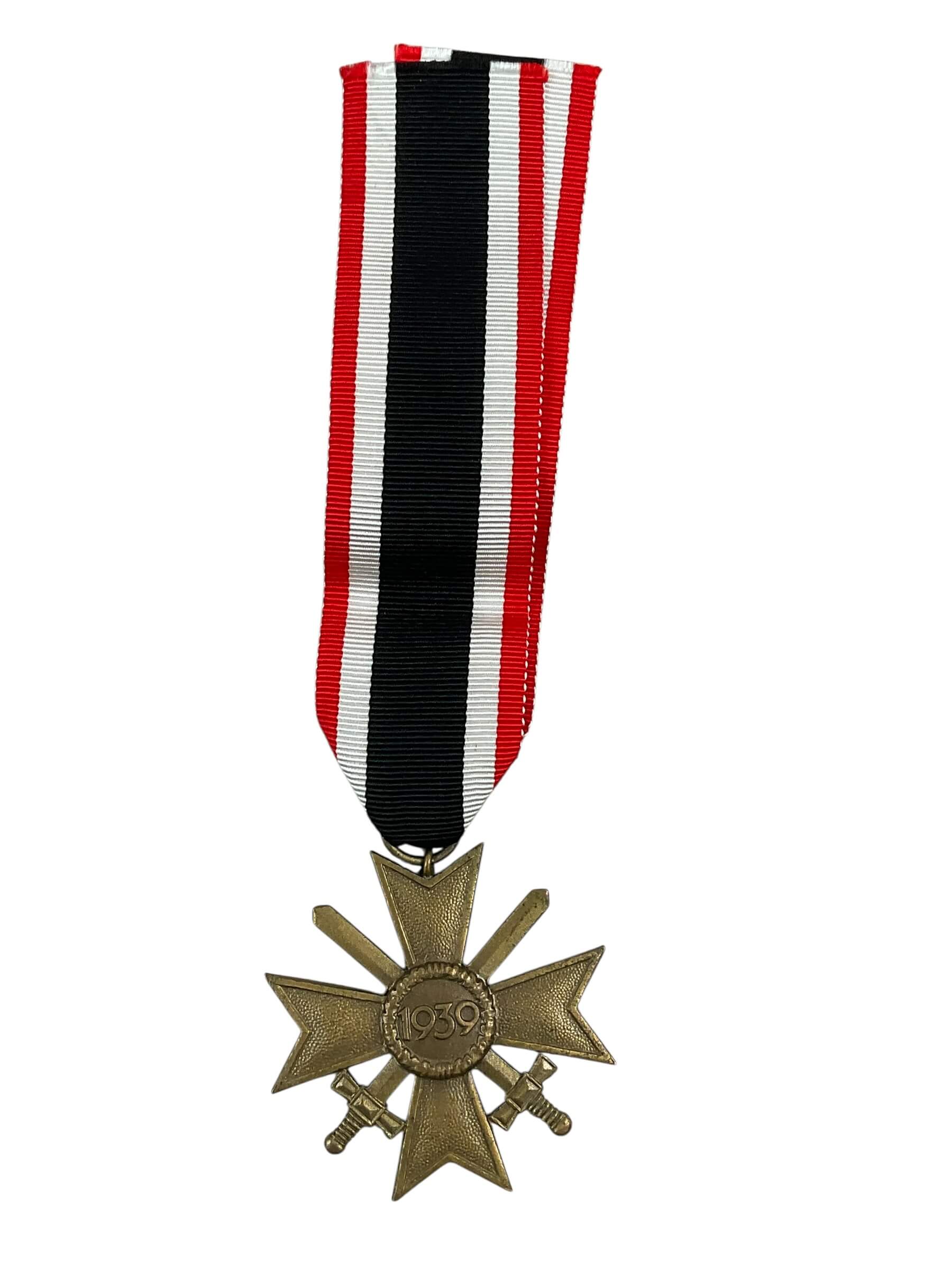 The WW2 German War Merit Cross 2nd Class with Swords is a full-size military decoration awarded during the Second World War by Nazi Germany. Instituted in 1939, this particular version features crossed swords, signifying that it was presented for merit in combat or under combat conditions to military personnel and some civilians. The medal consists of a bronze Maltese cross with a central medallion featuring a swastika surrounded by a laurel wreath on the obverse, with the reverse side bearing the date “1939.” This example is a no maker variation, meaning it lacks a manufacturer’s mark, which was common for some batches of these awards. The medal is designed to be suspended from a ribbon colored red with white-black-white stripes at the edges. The War Merit Cross with Swords reflects Germany’s practice of recognizing non-frontline achievements that contributed to the war effort under hazardous or military circumstances.