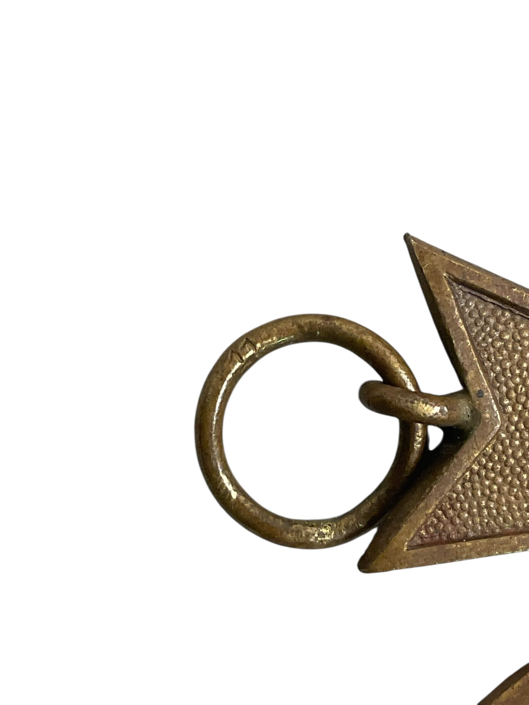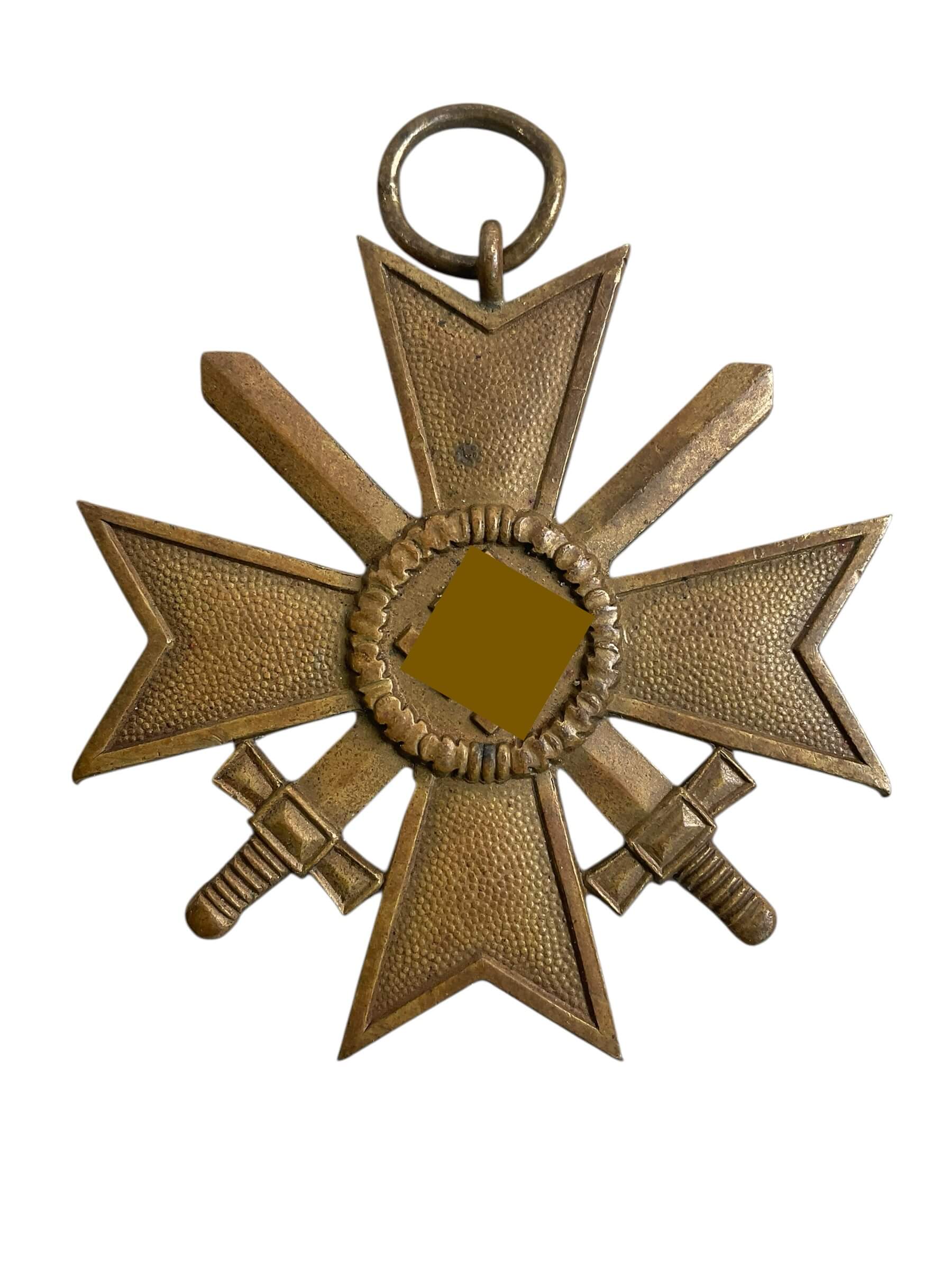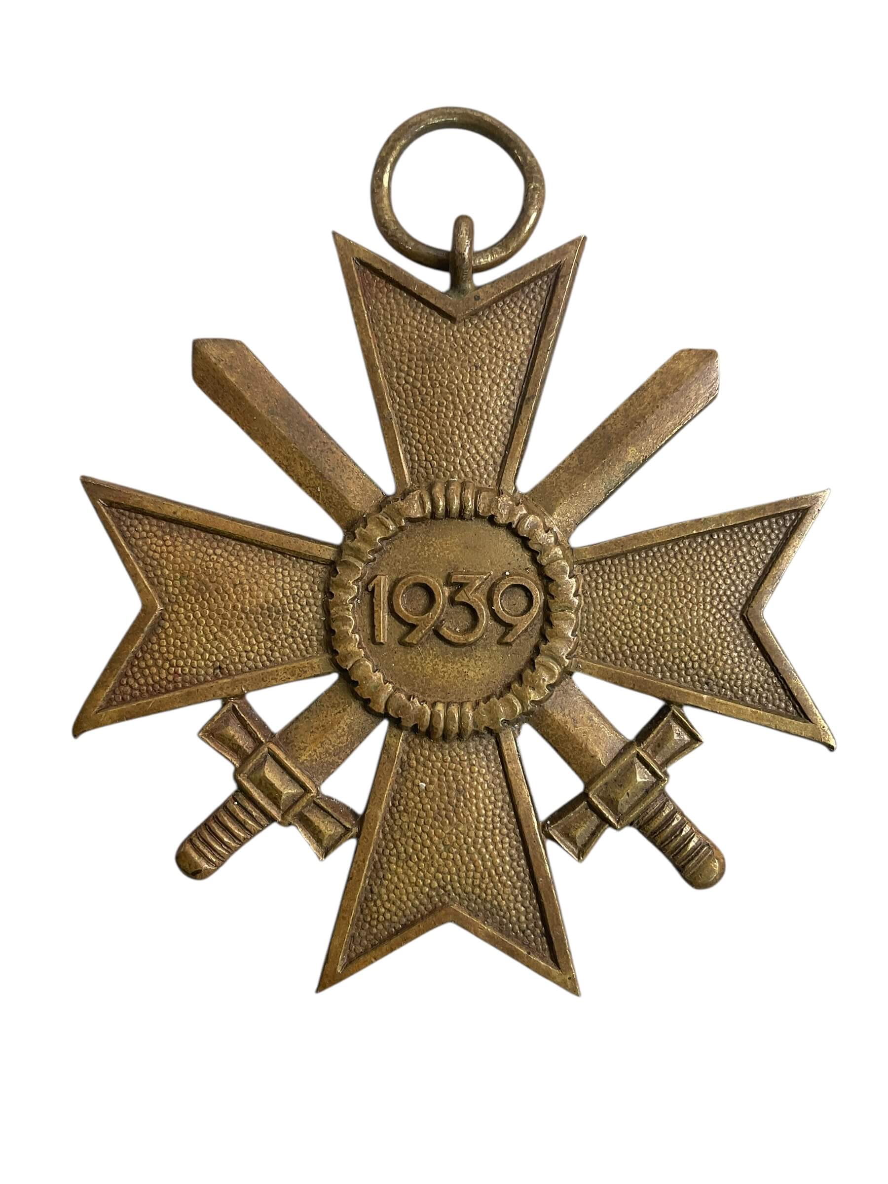 The WW2 German War Merit Cross with Swords is a military decoration awarded during the Second World War by Nazi Germany. This example is a full-size version produced by Grossman & Co., Vienna, identified by the maker mark “11” on the suspension ring. The War Merit Cross with Swords was presented to military personnel and civilians for meritorious service not directly involving combat but nonetheless contributing to the war effort. The “with Swords” designation denotes an award for actions under hazardous conditions or involving personal risk, differentiating it from the version without swords. This medal features a Maltese cross design made from a bronze alloy, with crossed swords positioned between the arms of the cross. The obverse center bears a swastika, as was standard for medals of this era. The reverse is plain, without inscriptions or embellishments. Grossman & Co. was one of several contractors authorized to manufacture this award, providing authenticity to this specific piece.