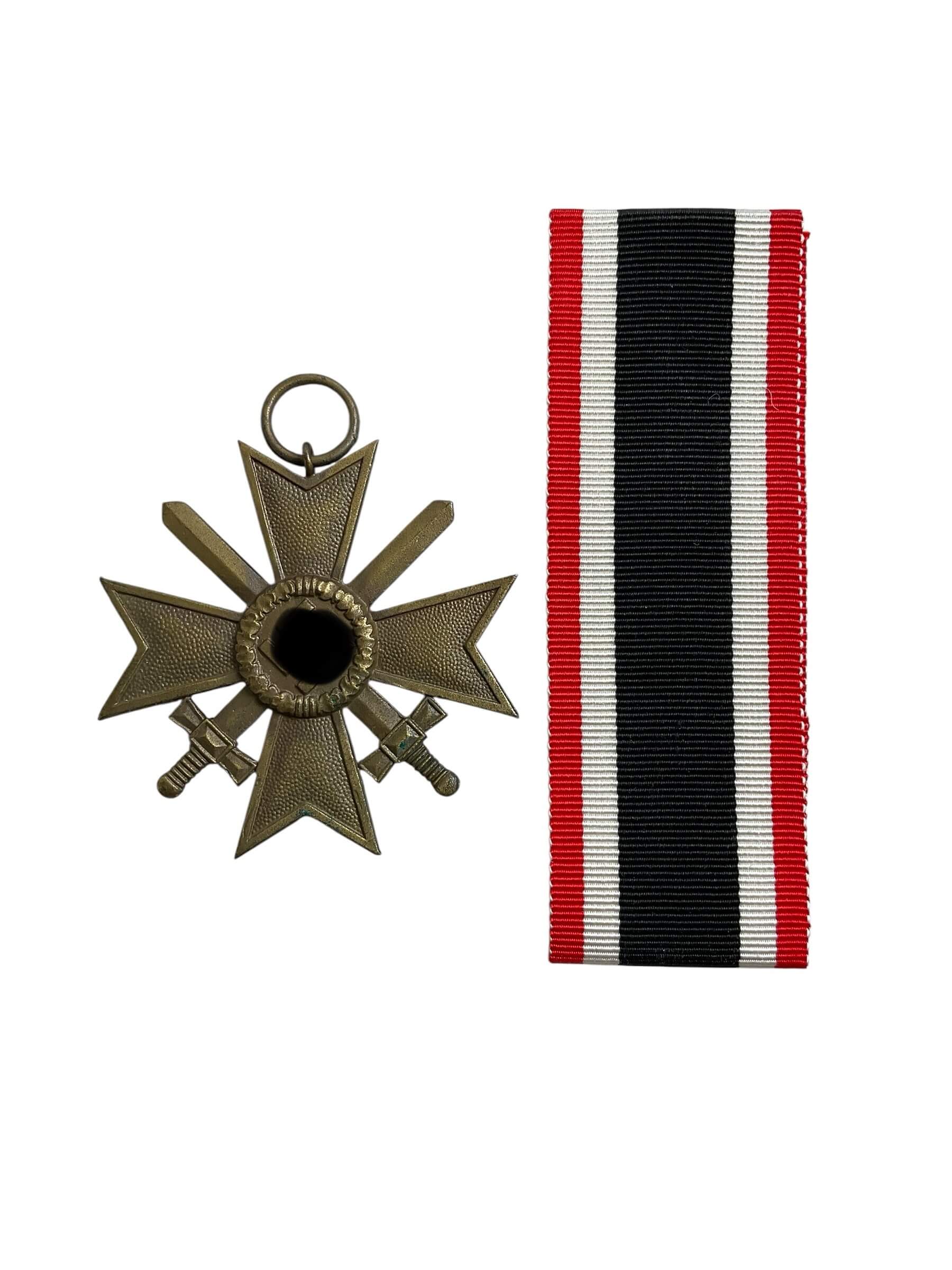 This item is an original WW2 German War Merit Cross with Swords, noteworthy for its absence of a maker’s mark. The War Merit Cross was a military decoration awarded for outstanding service during World War II, often to non-combatants for exceptional bravery beyond the call of duty. This particular piece, embellished with swords, signifies it was awarded for military merit. The absence of a maker’s mark is unusual and adds an intriguing aspect to its history, giving it a unique appeal to collectors and history enthusiasts. Although showing signs of age, the cross retains its original design and detailing, testament to its historical authenticity. The bronze color, the intricate design of the Nazi swastika in the center, and the swords crossing behind it, all contribute to this piece’s historical significance. This item presents a fascinating opportunity to own a tangible piece of World War II history.