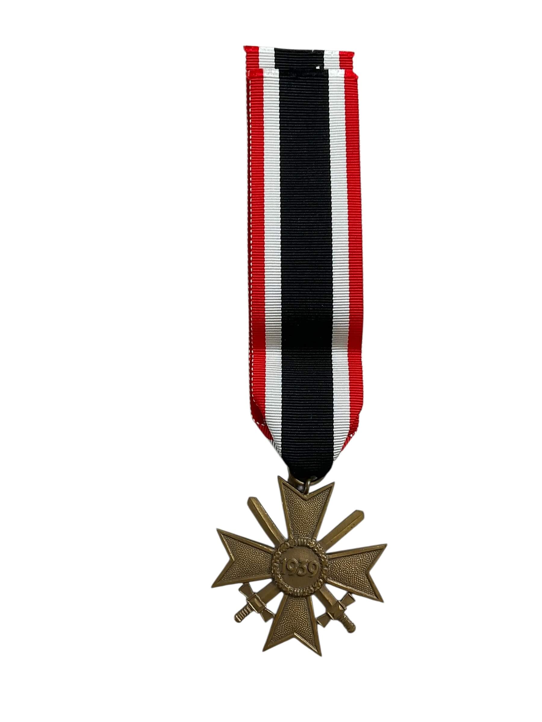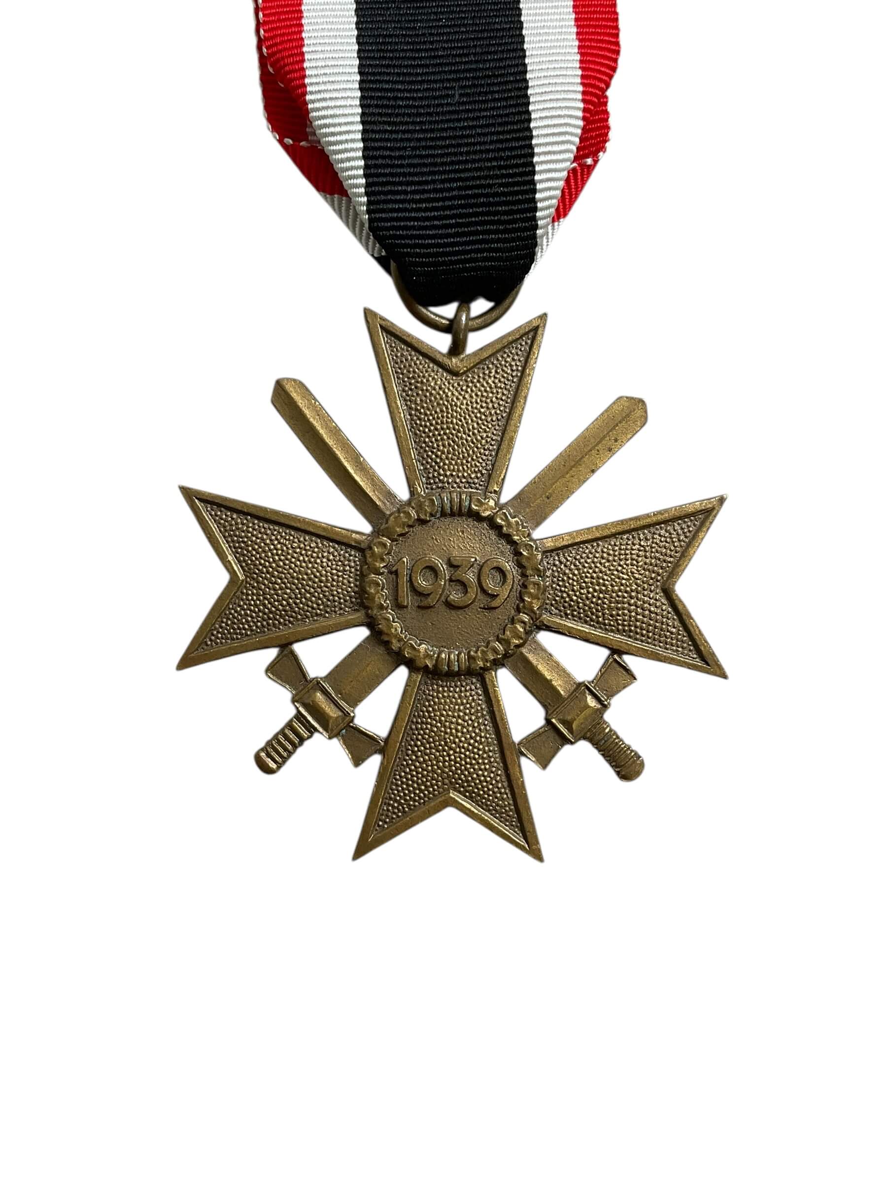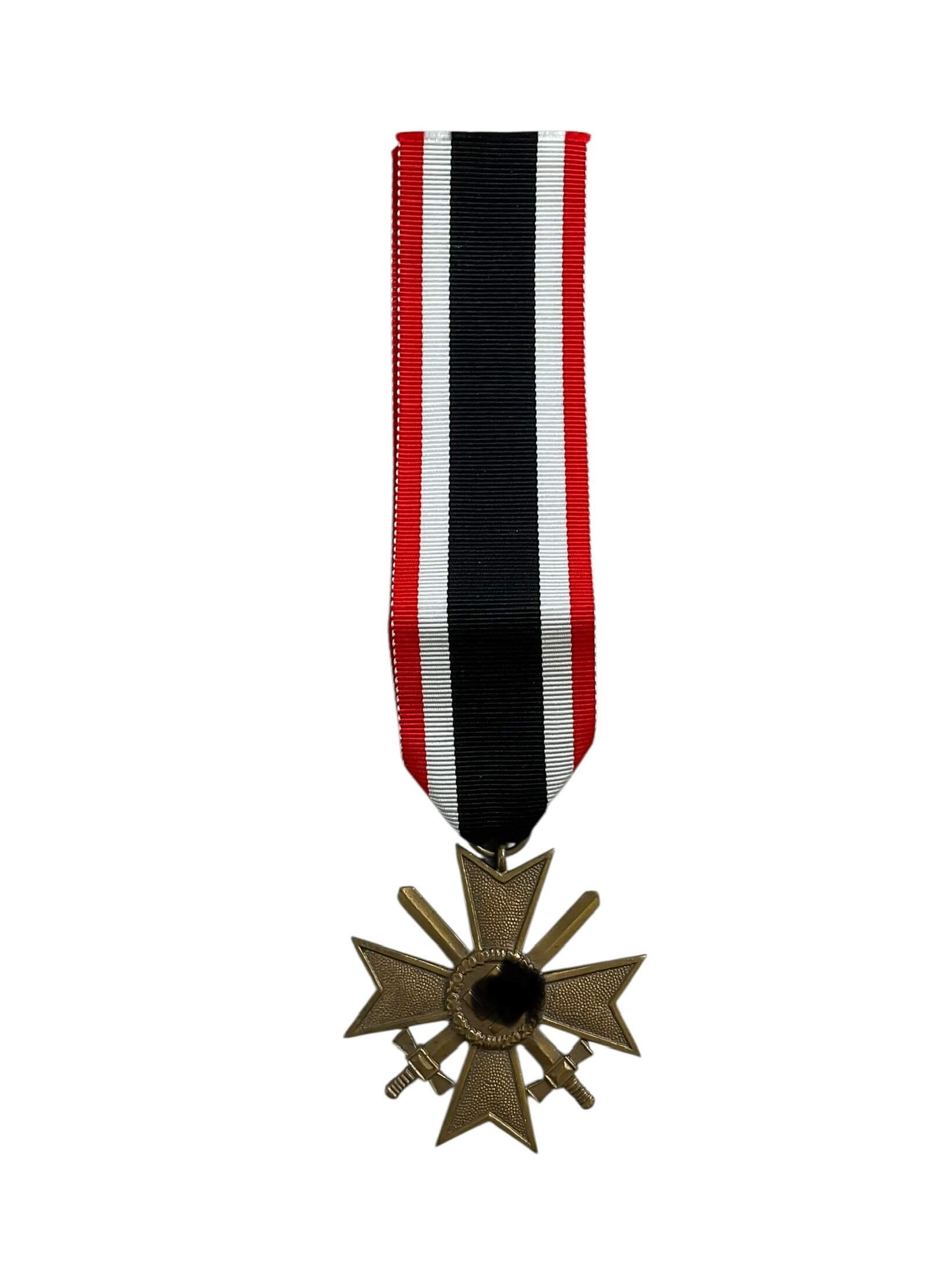 This WW2 German War Merit Cross with Swords NO MAKER represents a historic artifact from one of the most significant periods of the 20th century. Primarily awarded to military personnel for exceptional service beyond the call of duty, it’s a symbol of bravery and honor. The cross, adorned with swords, signifies readiness for combat, reflecting the tumultuous era from which it originates. Despite having no identifiable maker, the craftsmanship involved in its creation is evident in the intricate detailing. The design bears the distinctive German aesthetic of the time, making it a fascinating piece for historians, collectors, and enthusiasts of military memorabilia. Its authenticity and preservation offer a tangible connection to the past, particularly to the experiences of those who served during World War II. This item is not only a military decoration but also a piece of history that provides a unique insight into the era.