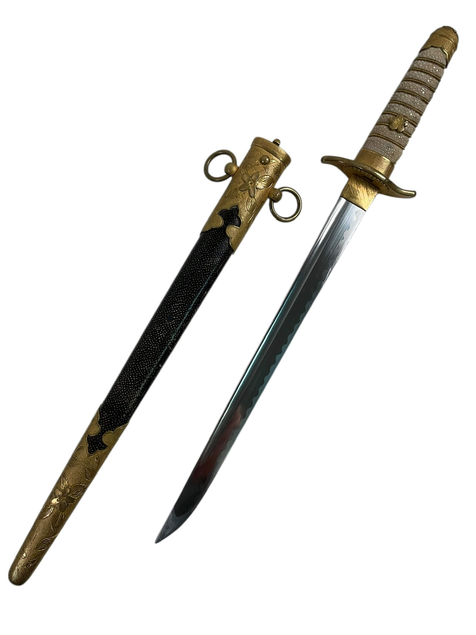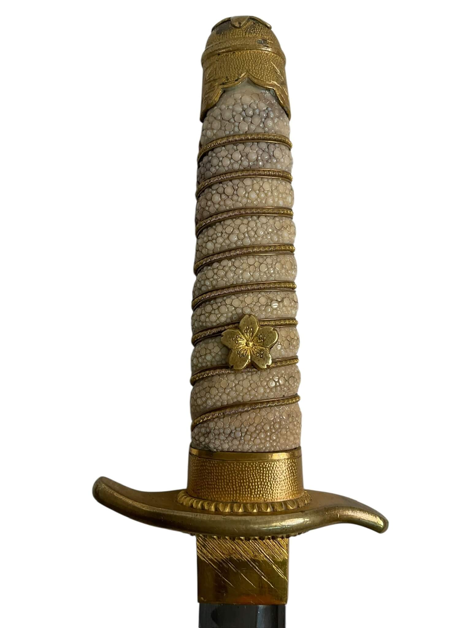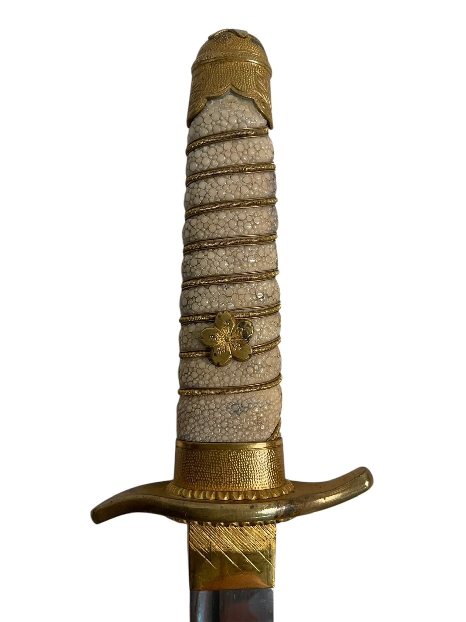 The WW2 Imperial Japanese Navy Officers Dagger is a ceremonial sidearm issued to commissioned officers in the Imperial Japanese Navy during the Second World War. This dagger typically features a straight, single-edged blade, measuring approximately 24-26 centimeters in length, housed within a metal scabbard often decorated with ray-skin and brass fittings. The handle is usually wrapped in white ray skin, bound with