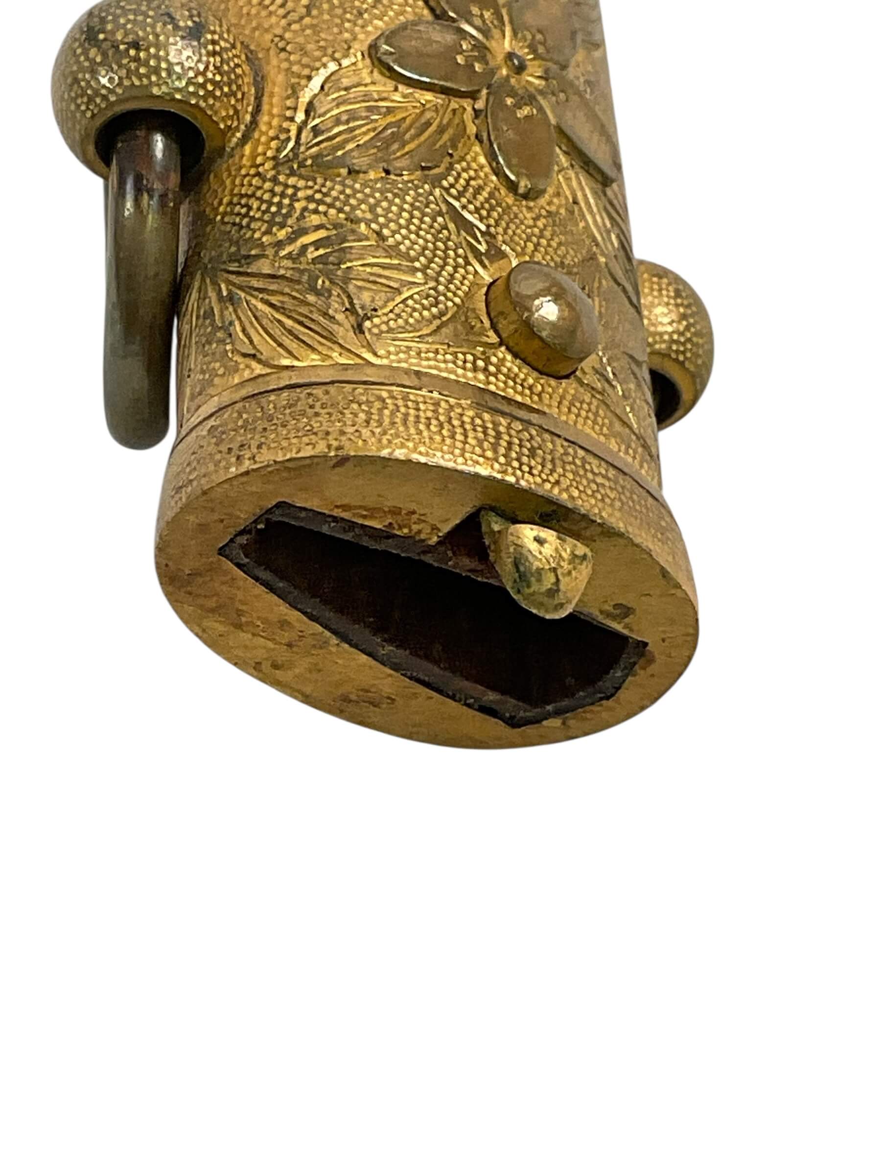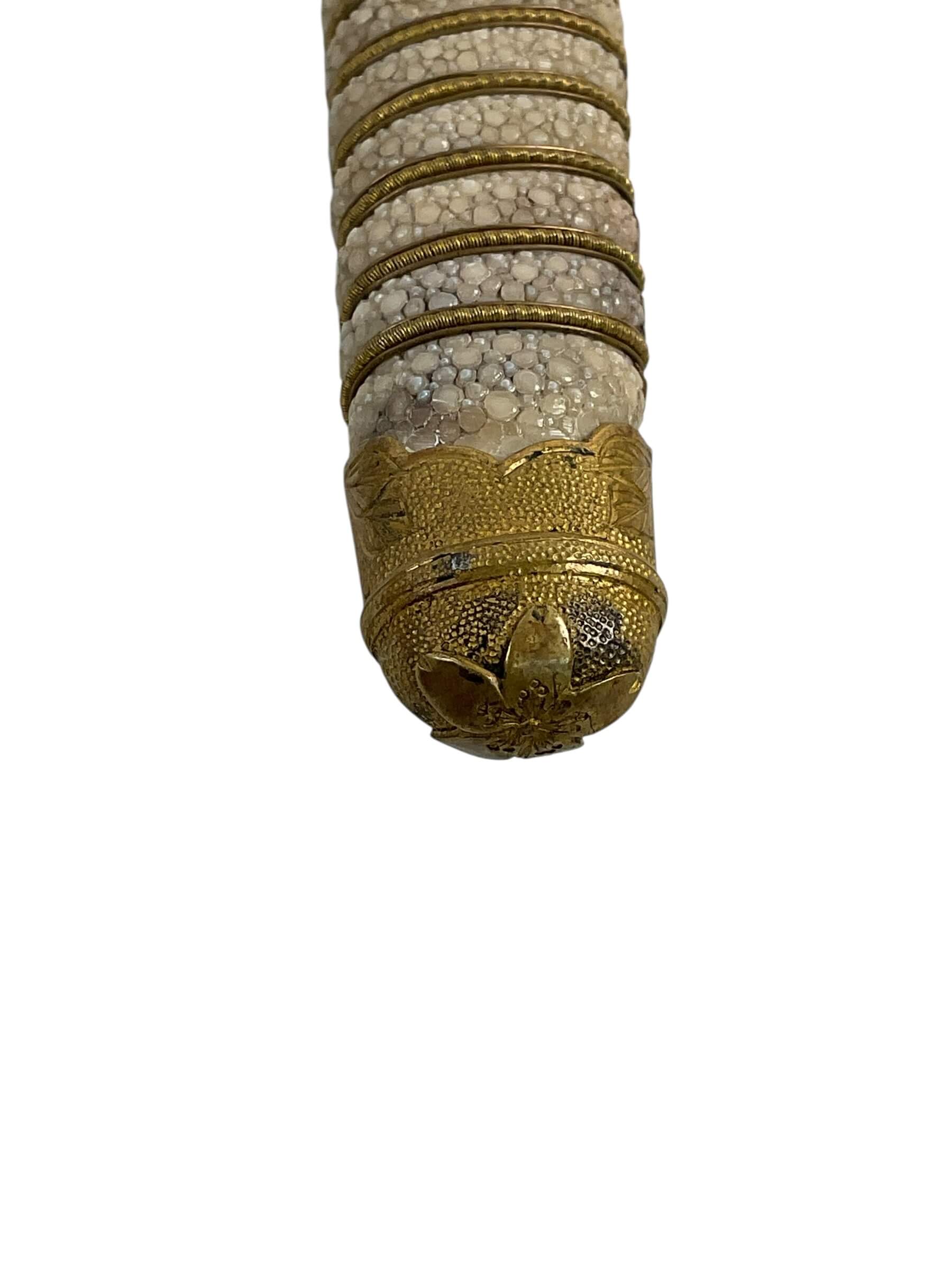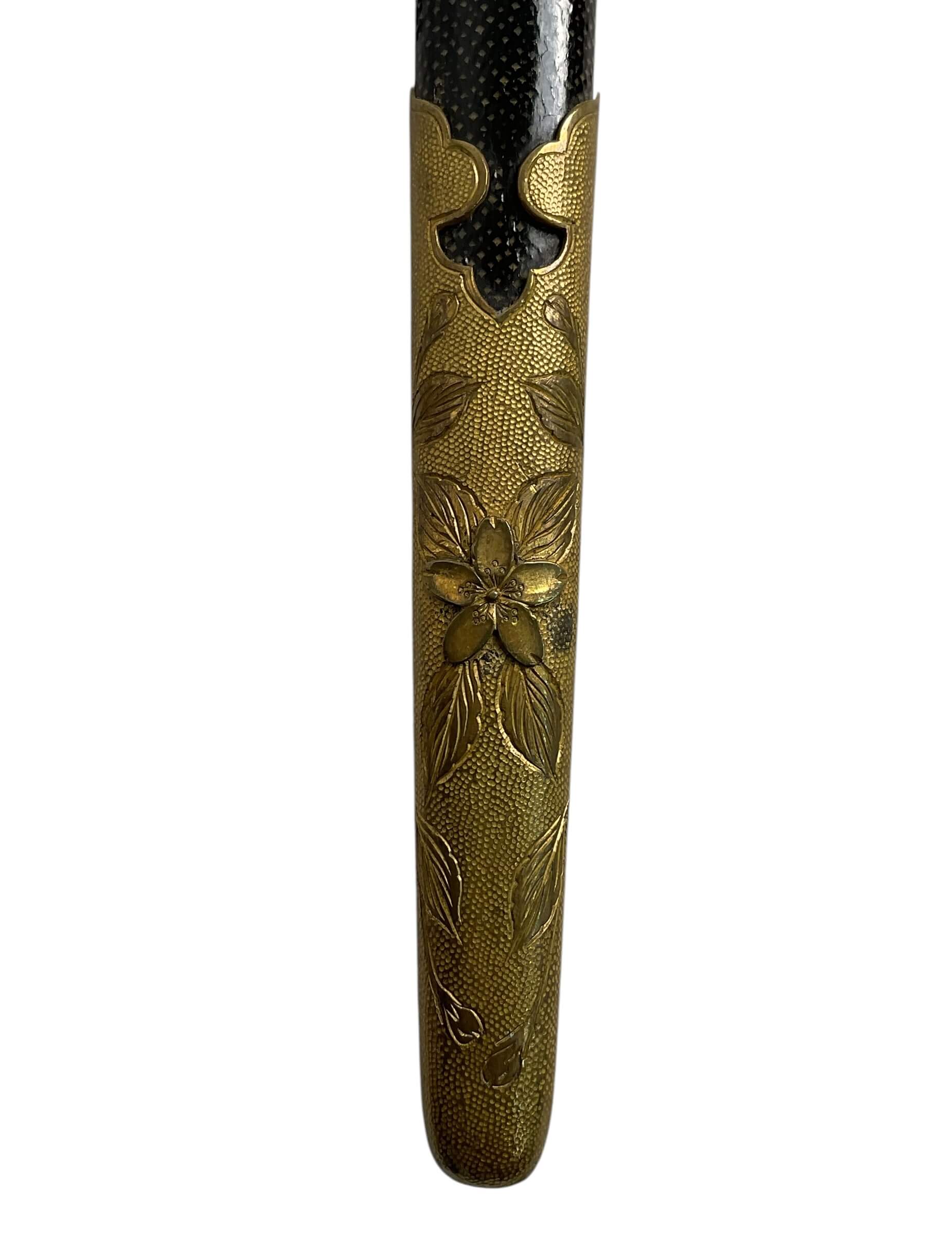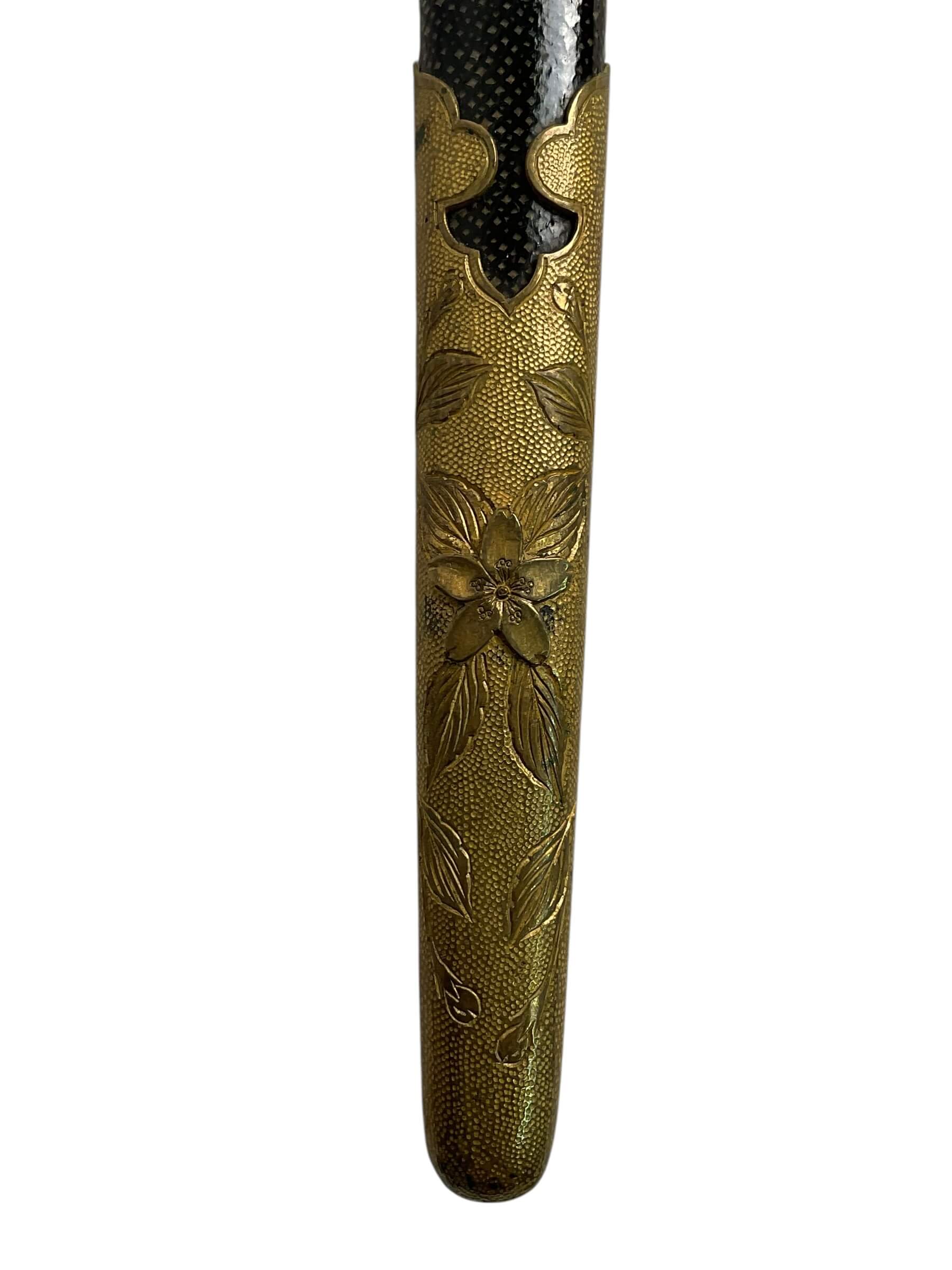 The WW2 Imperial Japanese Navy Officers Dagger is a ceremonial sidearm issued to commissioned officers in the Imperial Japanese Navy during the Second World War. This dagger typically features a straight, single-edged blade, measuring approximately 24-26 centimeters in length, housed within a metal scabbard often decorated with ray-skin and brass fittings. The handle is usually wrapped in white ray skin, bound with
