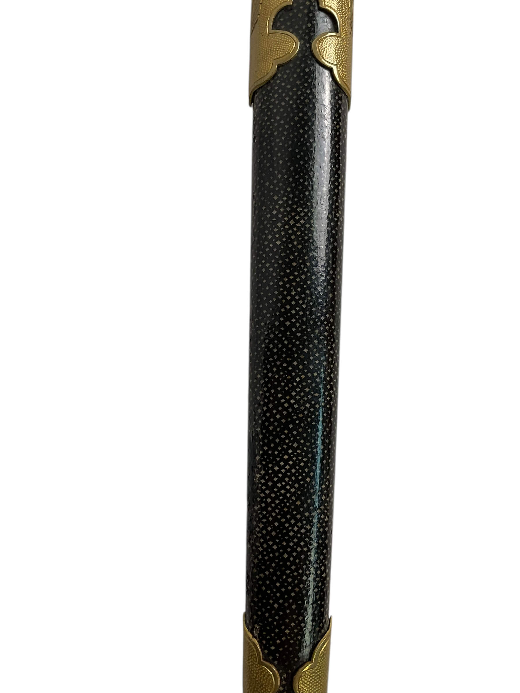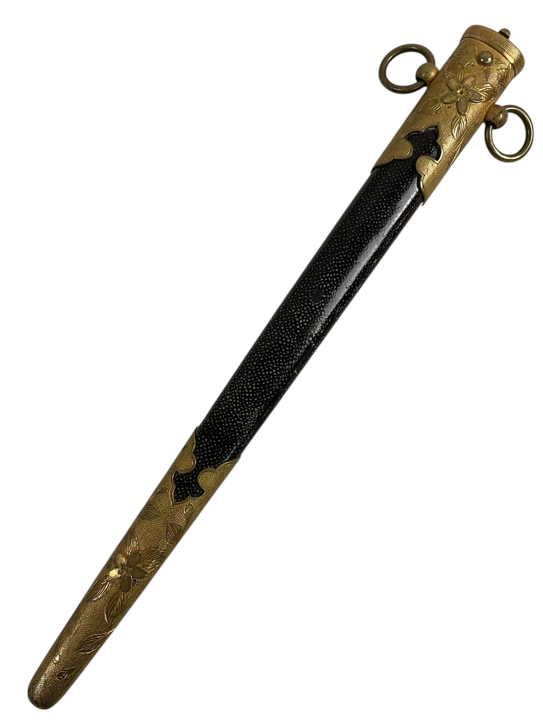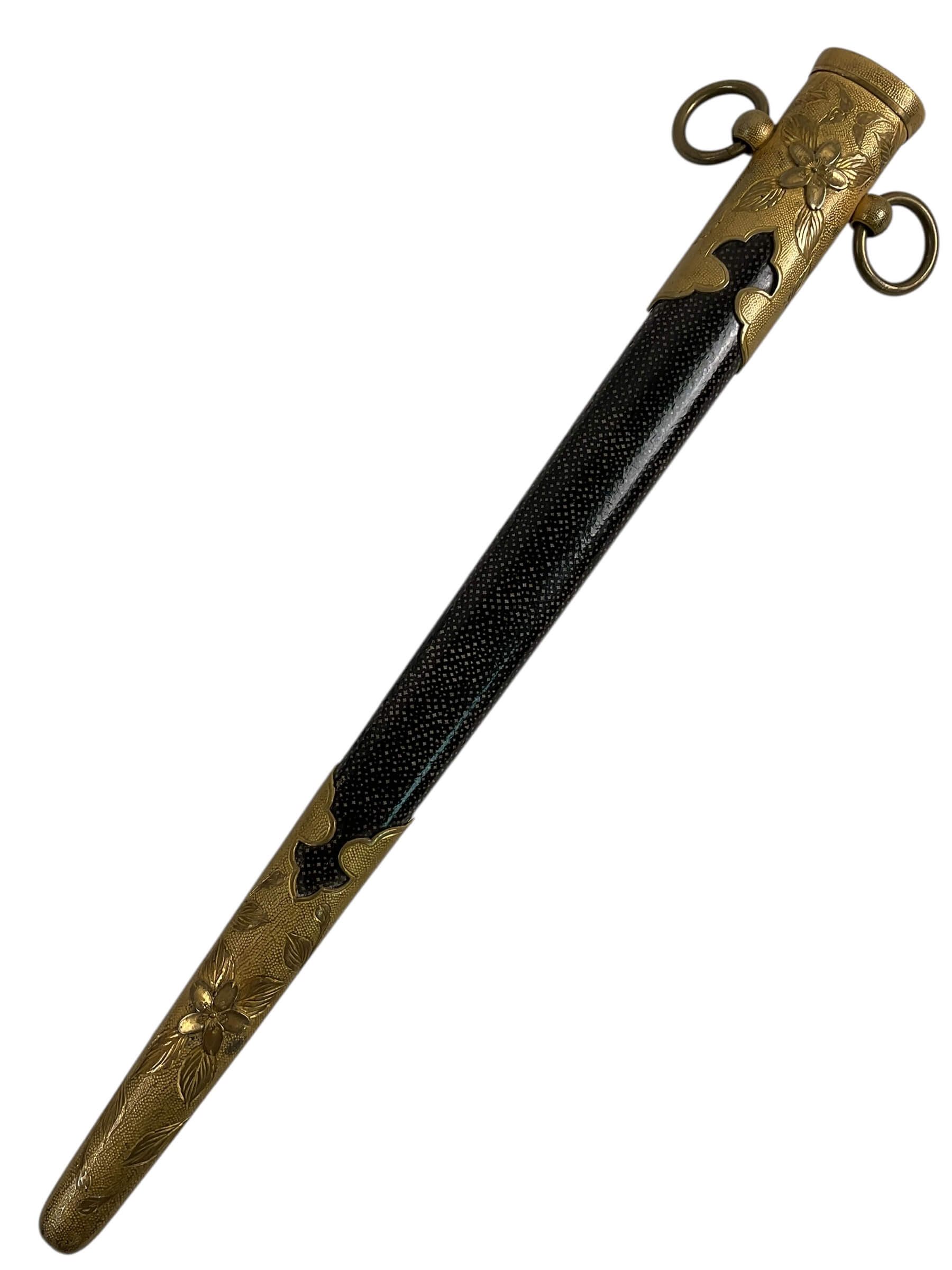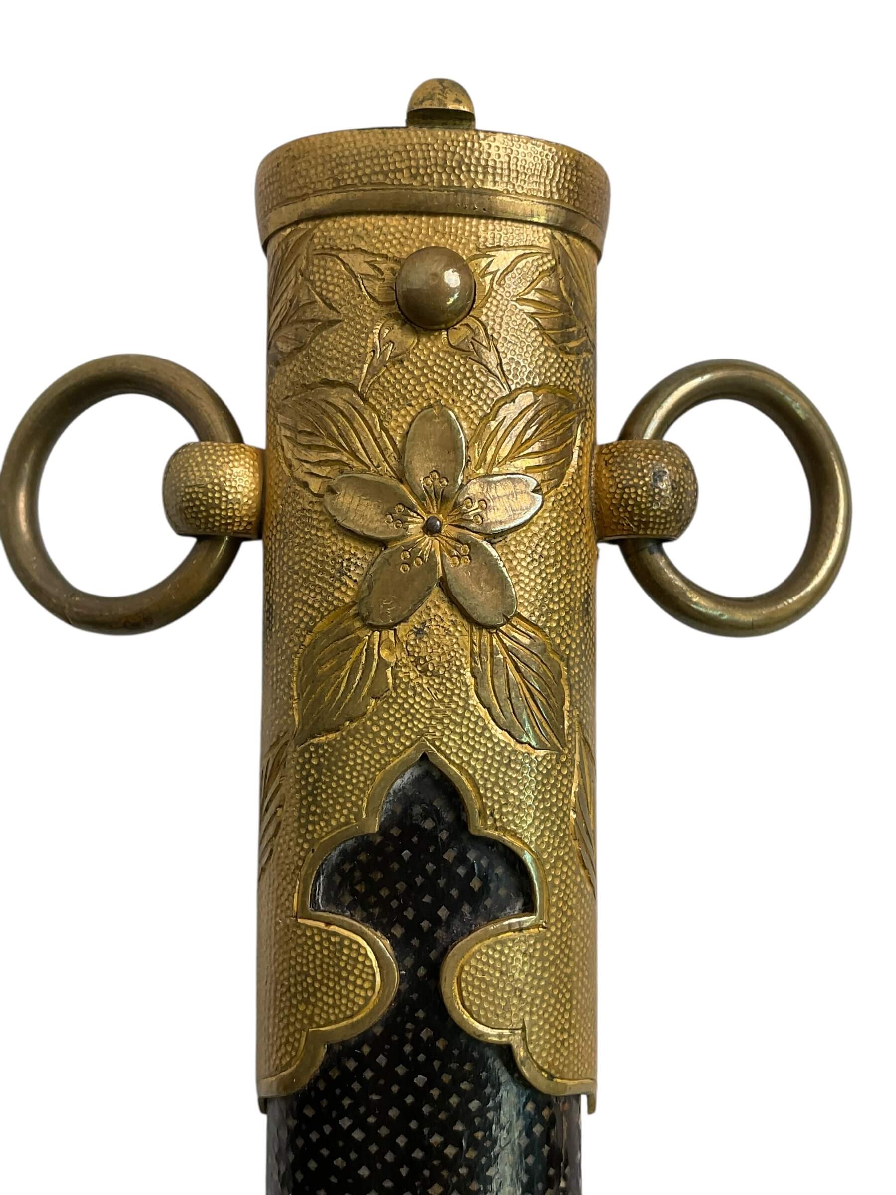The WW2 Imperial Japanese Navy Officers Dagger is a ceremonial edged weapon carried by commissioned officers of the Imperial Japanese Navy during the Second World War. This model features a nickel-plated steel blade with a single edge and typically measures approximately 23 to 25 centimeters in length. The hilt is distinguished by a wire-wrapped ray skin grip, brass fittings, and a pommel often shaped as a chrysanthemum, symbolizing the Japanese monarchy. The scabbard is generally constructed from lacquered metal with brass fittings and suspension rings for attachment to a uniform belt. Issued as part of the formal dress uniform, the dagger was intended as a mark of rank and status rather than a combat weapon. Its design reflects early 20th-century Japanese military aesthetics, combining traditional elements with European influences. These daggers are of interest for their historical association with naval personnel in Imperial Japan and their role in Japanese military regalia.