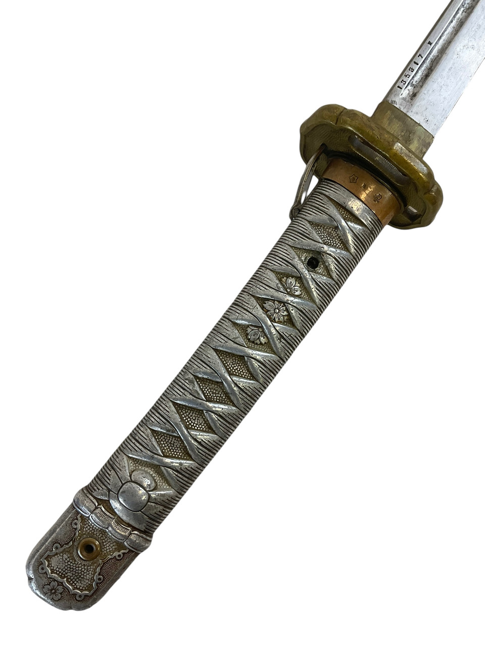 This authentic WW2 Japanese Army NCO Sword comes with a scabbard, though the identification numbers do not match. The sword is a genuine piece from the era, reflecting the craftsmanship and design typical of the non-commissioned officers’ weapons of the time. The blade retains its original sharpness and features the distinct fullers running along its length, while the hilt is adorned with traditional Japanese motifs. The metal scabbard, though showing some signs of wear consistent with its age and use in the field, remains sturdy and reliable. This historical artifact provides a tangible connection to the period and would make an outstanding addition to any military memorabilia collection, despite the mismatch in numbers. Whether for display or scholarly study, this sword and scabbard set offers a compelling glimpse into the equipment used by Japanese forces during one of history’s most significant conflicts.