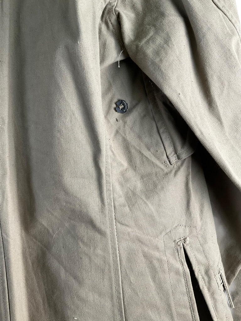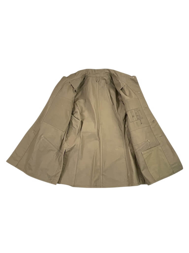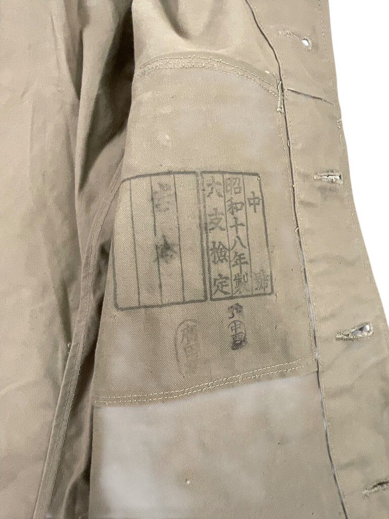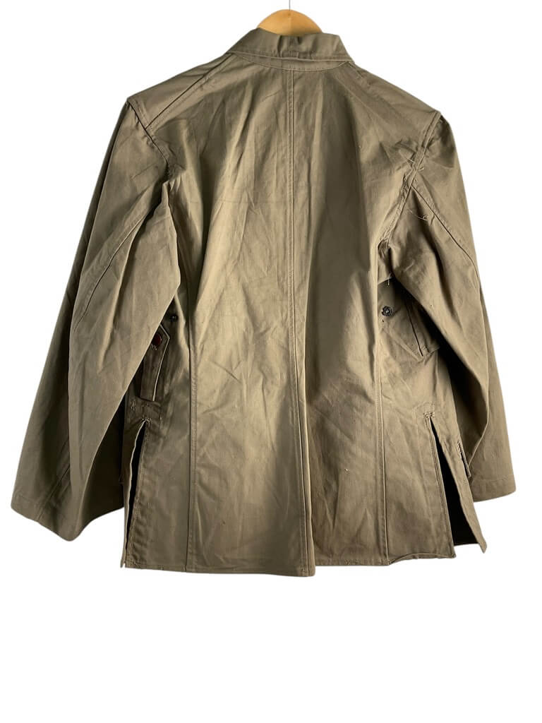 The WW2 Japanese Army Summer Weight Tunic for Senior Private is an original uniform item used by the Imperial Japanese Army during the Second World War. Designed for use in warmer climates, the tunic is constructed from lightweight cotton fabric in a khaki or light tan color, providing comfort and ventilation during summer operations. The tunic features a stand-and-fall collar, front button closure, and two chest