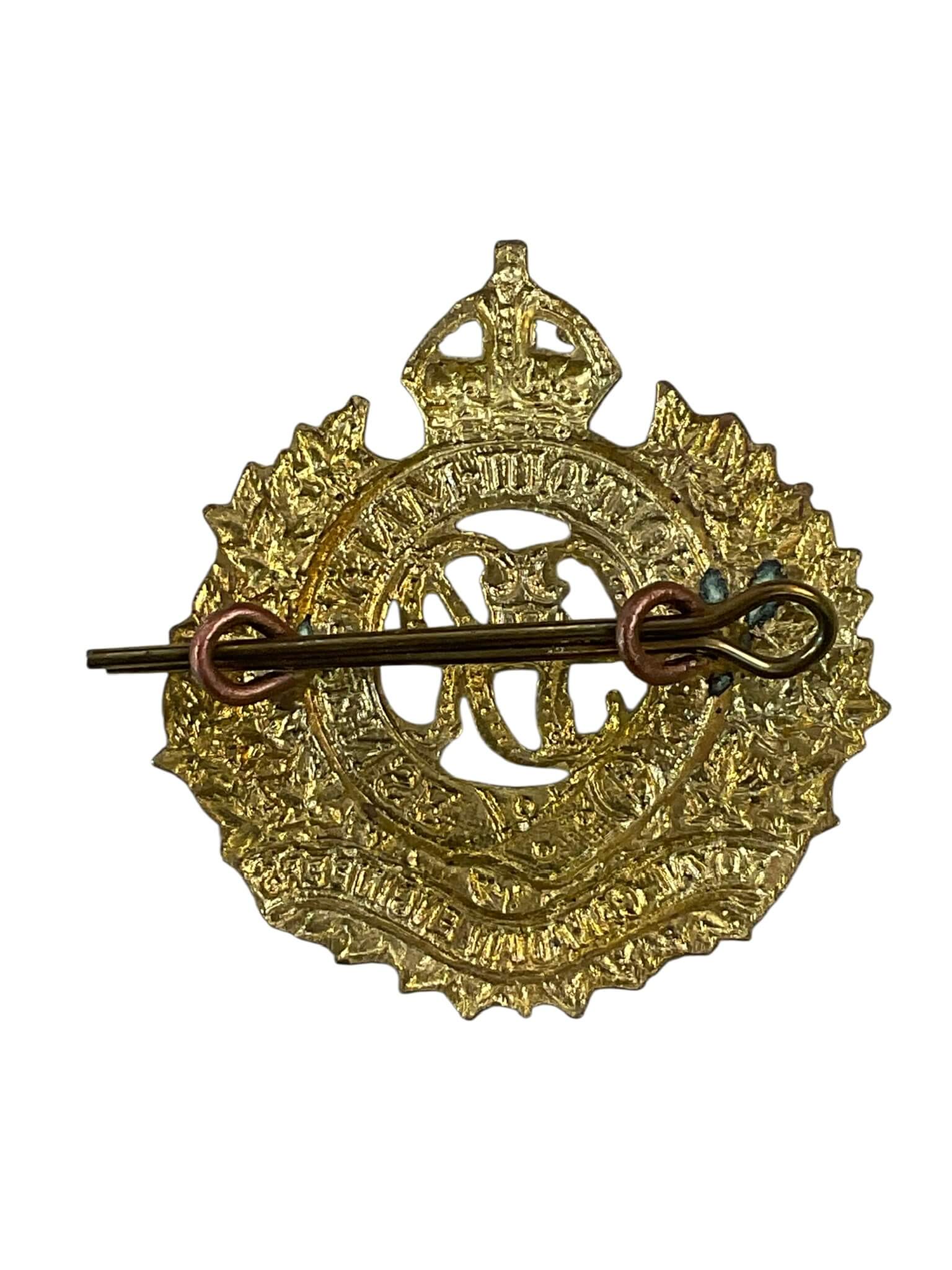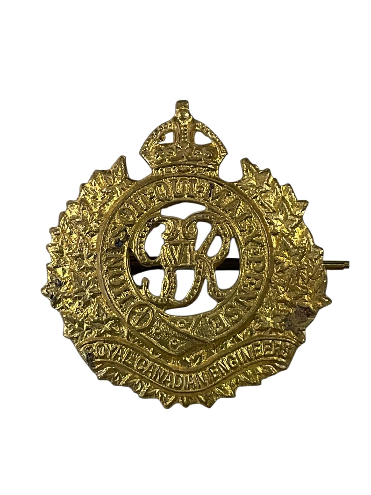 The WW2 Royal Canadian Engineers (RCE) Cap Badge is an authentic insignia worn by members of the Royal Canadian Engineers during the Second World War. This badge typically features the distinctive elements associated with the RCE, including a crowned garter inscribed with the unit’s motto, encircling the royal cypher and set above a scroll bearing the designation “Royal Canadian Engineers.” Made of brass or bi-metal, the badge was designed to be affixed to the service dress cap, serving as both a unit identifier and a symbol of the corps’ contributions to military engineering, construction, and support. The RCE played a vital role in bridging, fortification, demolition, and infrastructure projects throughout the conflict. This cap badge provides a tangible link to the uniforms of Canadian military engineers and represents the service and history of the corps within the broader context of the Allied war effort.