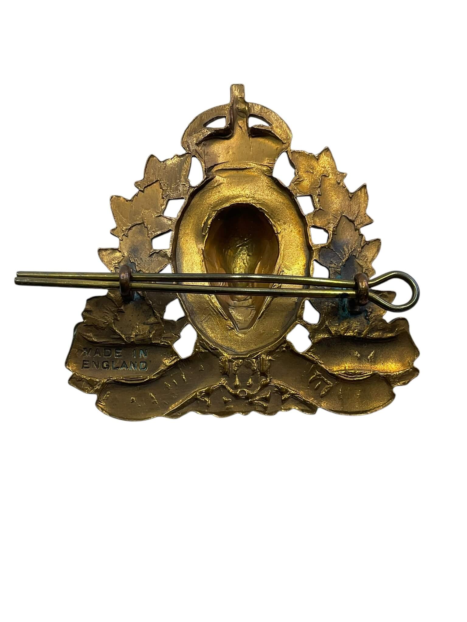 This WW2 Royal Canadian Mounted Police (RCMP) Cap Badge is a remarkable piece of Canadian history. Crafted during the tumultuous years of the Second World War, it was proudly worn by members of the RCMP, symbolizing their commitment to maintaining peace and order. The badge showcases intricate detail, featuring the iconic buffalo head, a crown representing the monarchy, and the RCMP motto ‘Maintiens Le Droit’ (Uphold the Right). It is constructed from durable metal, designed to endure tough conditions. Its historical significance and craftsmanship make it a valuable collectible for historians, military enthusiasts, or anyone with an interest in Canadian heritage. This badge not only represents the RCMP but also embodies the resilience and dedication of the Canadian forces during one of the most challenging periods in world history.