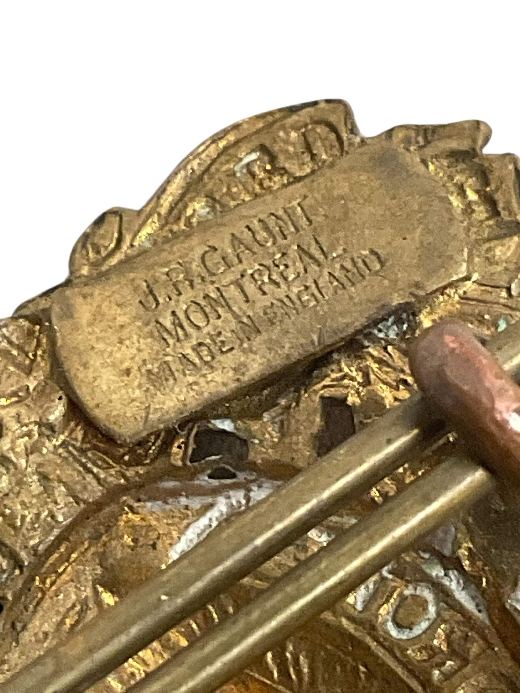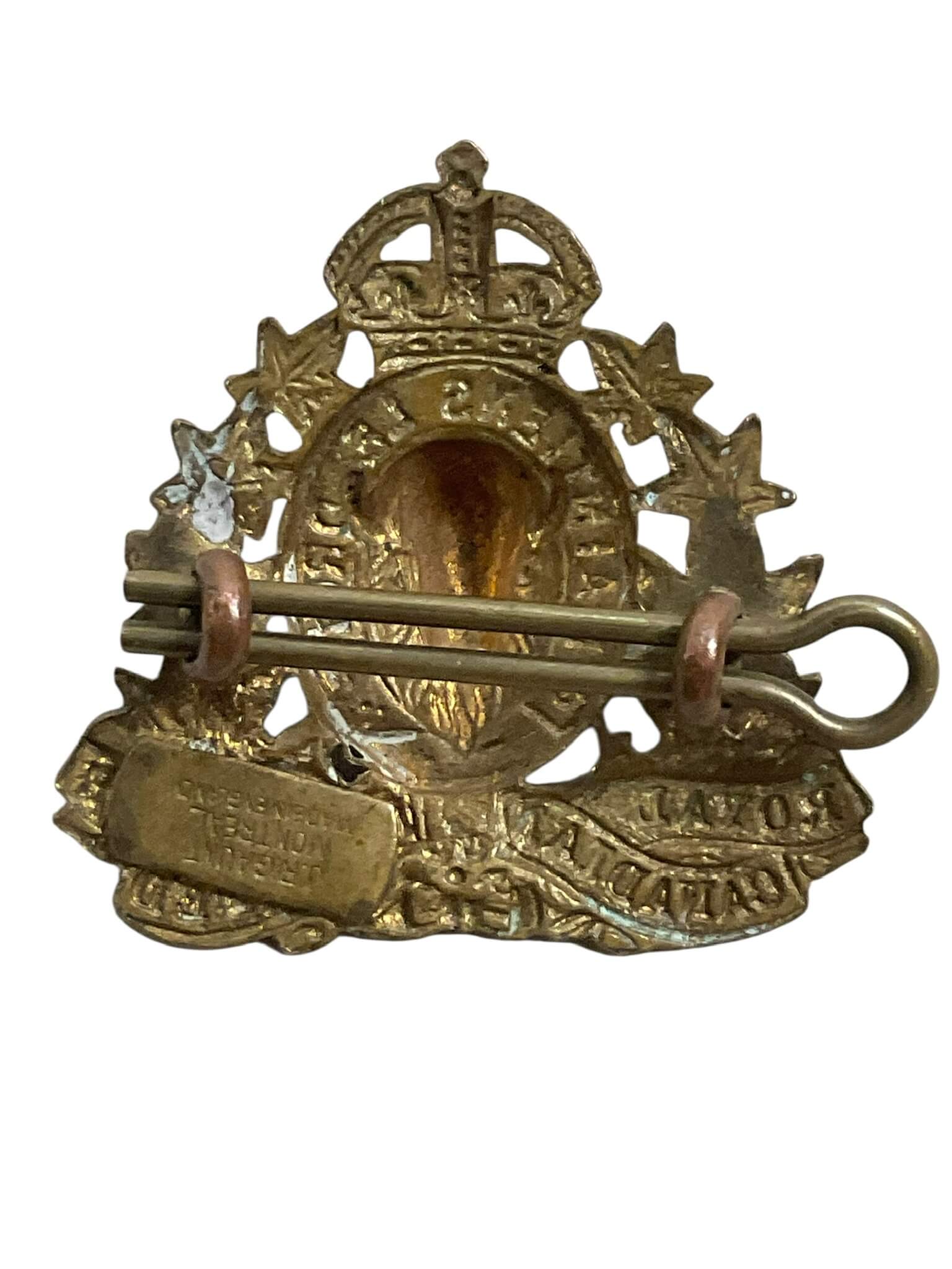 The item is a single World War II-era collar insignia representing the Royal Canadian Mounted Police (RCMP). This piece features the distinct RCMP insignia design used during the period and is marked by the maker on the reverse, confirming its authenticity and origin. Such insignia were worn on the uniform collar by RCMP personnel during the Second World War, serving as a formal indicator of rank and service branch. The construction is consistent with wartime manufacturing techniques and typically utilizes brass or similar durable metal materials, with defined emblem detail and a secure fastening system for attachment to the uniform. Maker marked examples are valued for their traceable provenance, providing insight into the insignia’s production and distribution during the conflict. This collar insignia represents a segment of the RCMP’s uniform history and offers a tangible connection to Canada’s military and policing contributions during World War II.