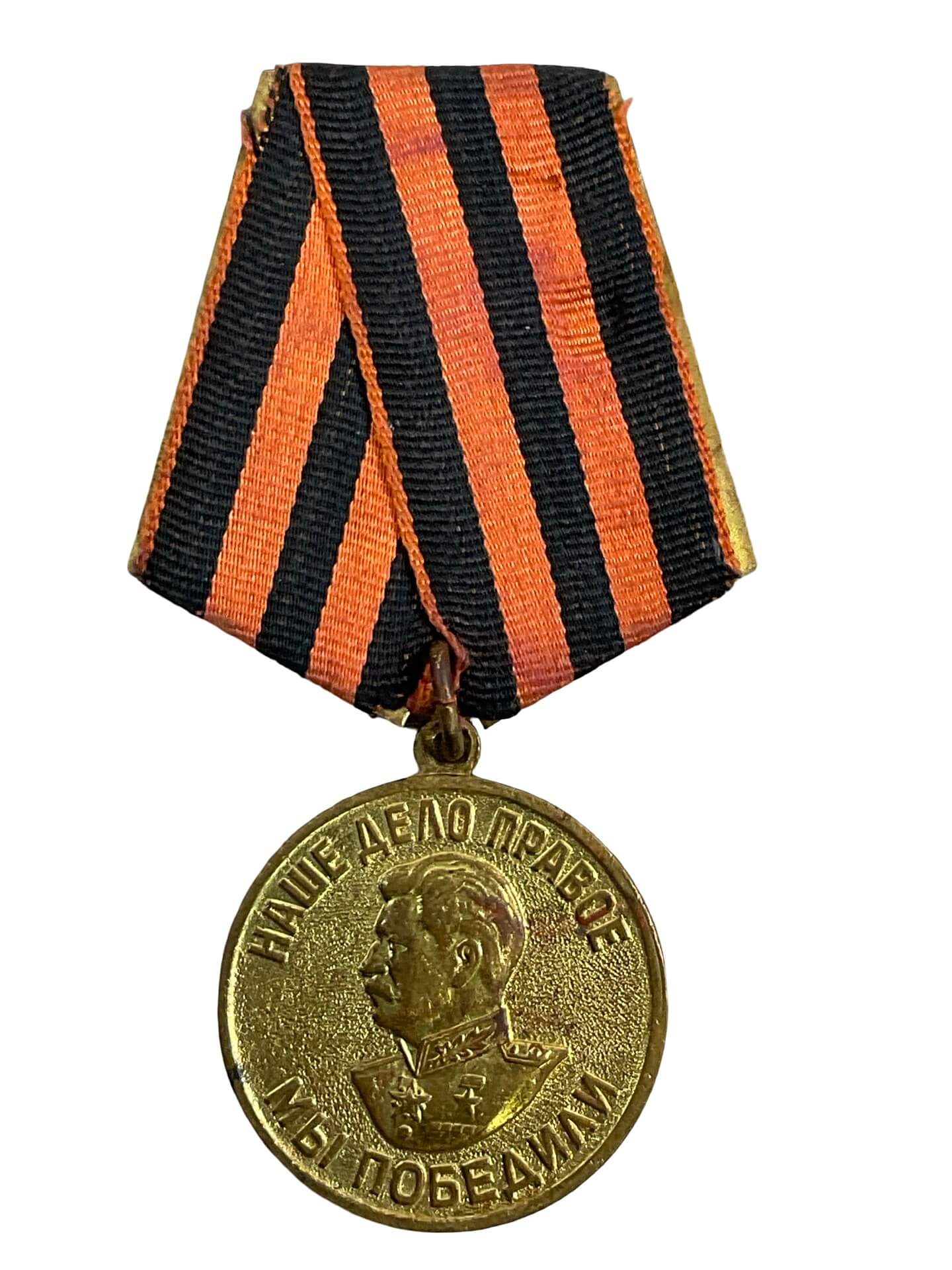 The WW2 Russian Soviet Medal For the Victory Over Germany Full Size is a military decoration awarded to Soviet service personnel who participated in the defeat of Nazi Germany during the Great Patriotic War (1941–1945). Instituted on May 9, 1945, this circular brass medal features a relief portrait of Joseph Stalin on the obverse, encircled by an inscription in Russian translating to “Our Cause is Just – We Won.” The reverse bears the inscription “For Victory Over Germany in the Great Patriotic War 1941–1945” along with a five-pointed star. The medal is suspended from a pentagonal mount, with a ribbon displaying the black and orange stripes of the Order of Glory (St. George’s ribbon). Approximately 14 million of these medals were awarded, making it one of the most widely issued Soviet campaign medals. It remains a significant artifact representing Allied victory on the Eastern Front in World War II.