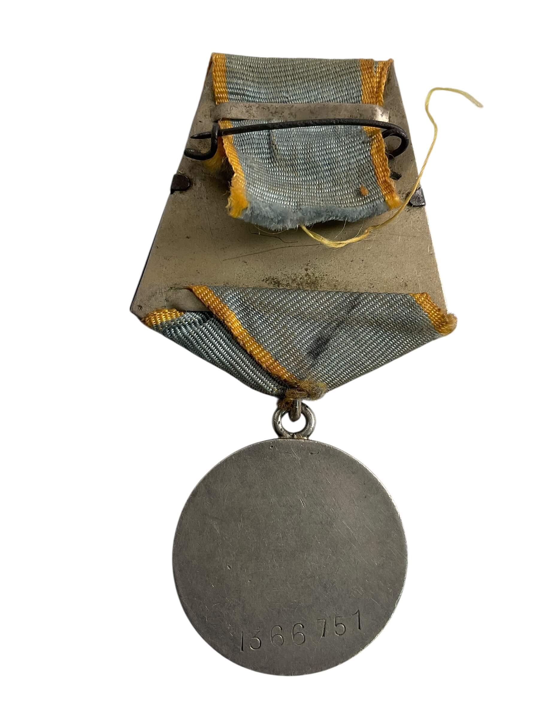 The WW2 Russian Soviet Military Merit Medal Full Size is an original military decoration awarded by the Soviet Union during the Second World War. Established in 1938, this medal recognized enlisted personnel and non-commissioned officers of the Red Army, Navy, border, or internal security troops for exemplary performance in combat and outstanding service. The medal is composed of silver and measures approximately 32 millimeters in diameter