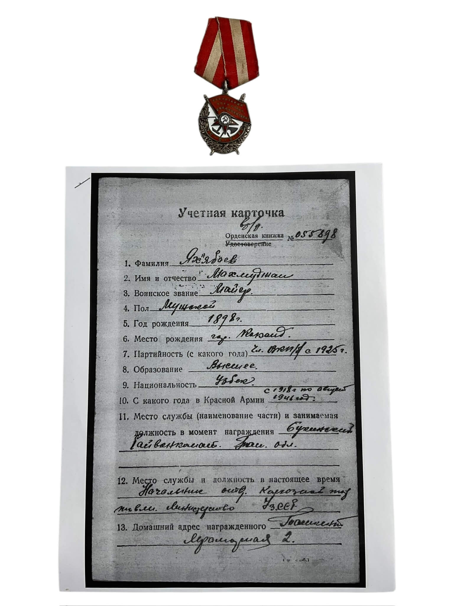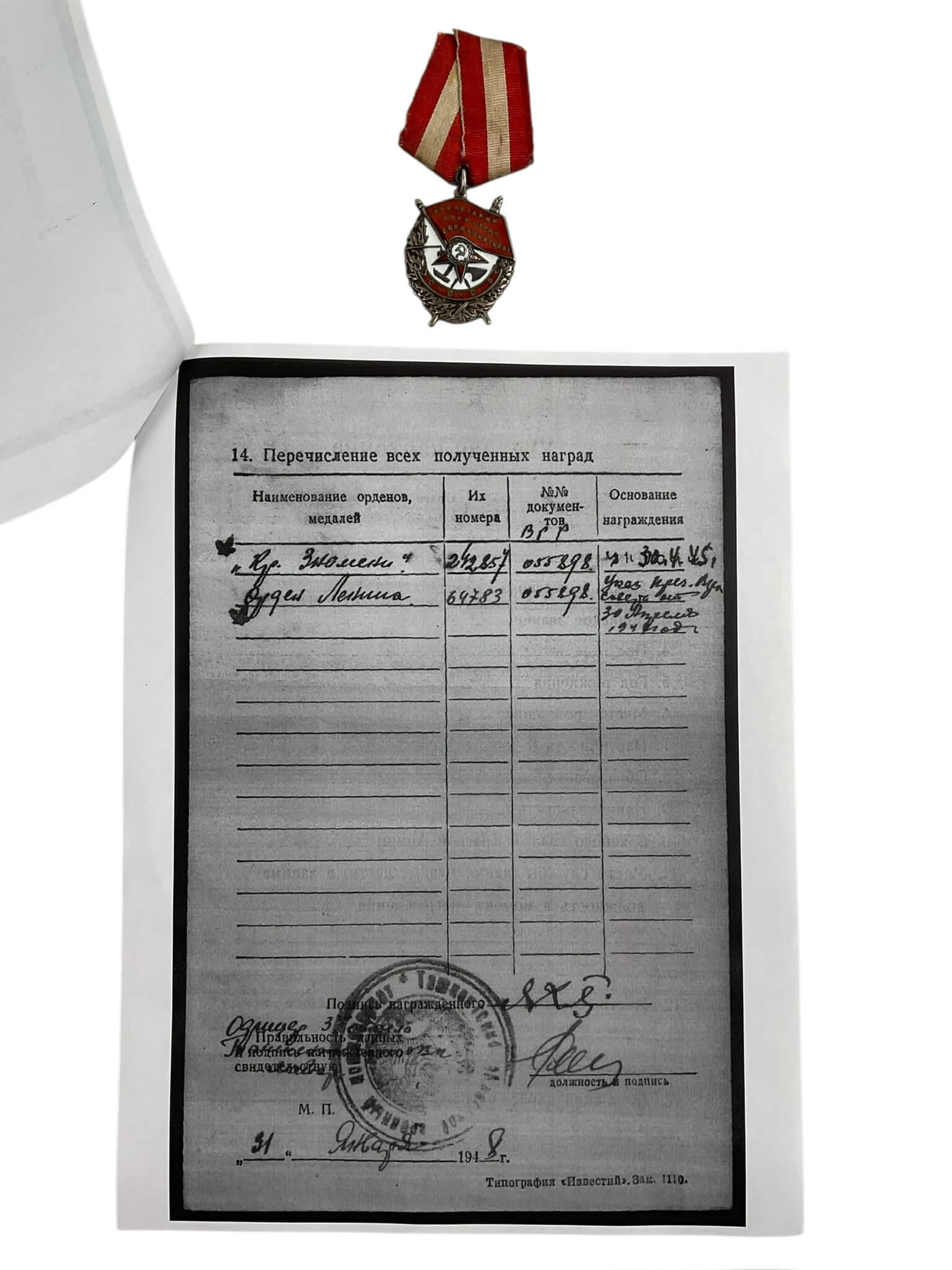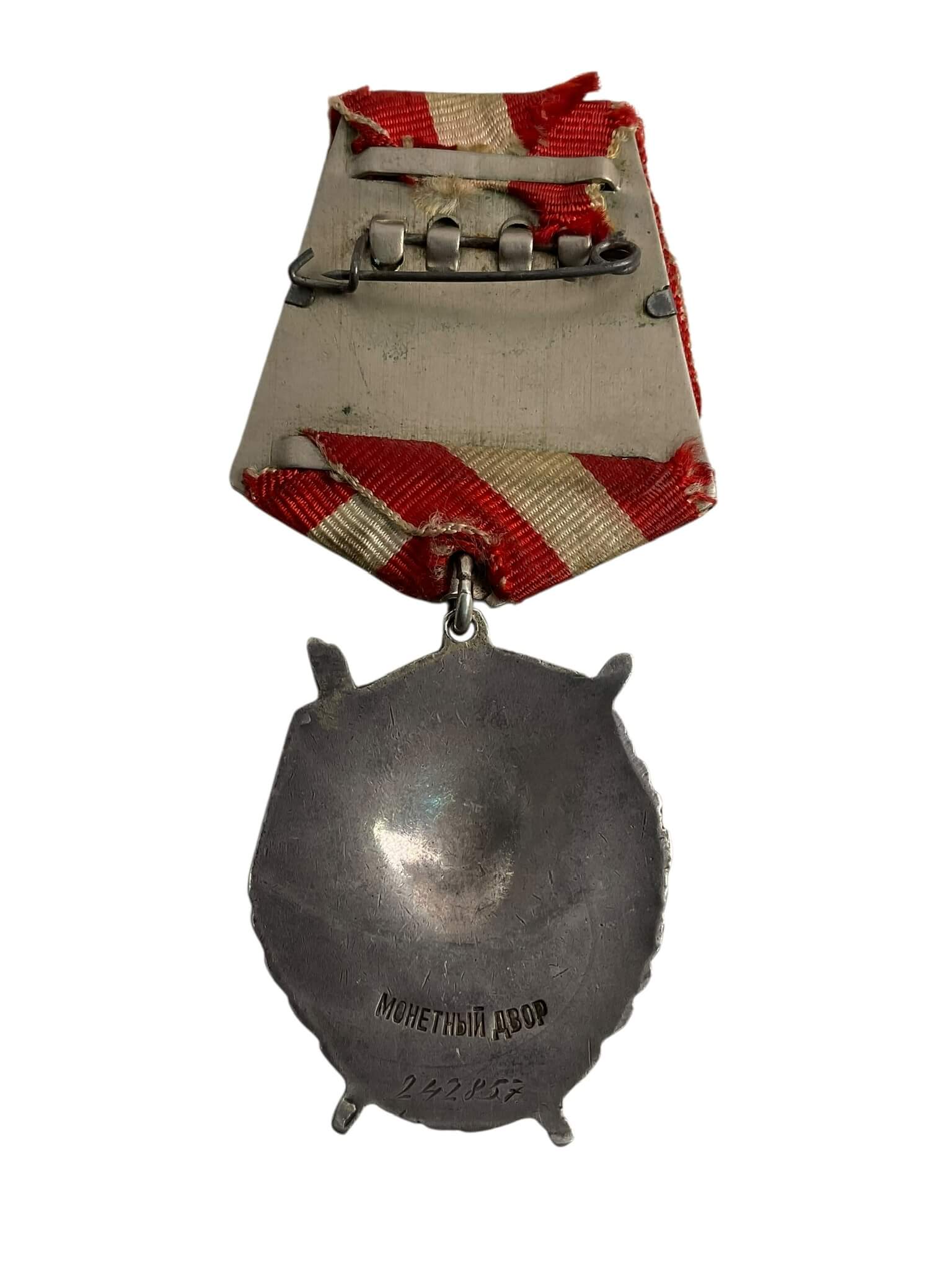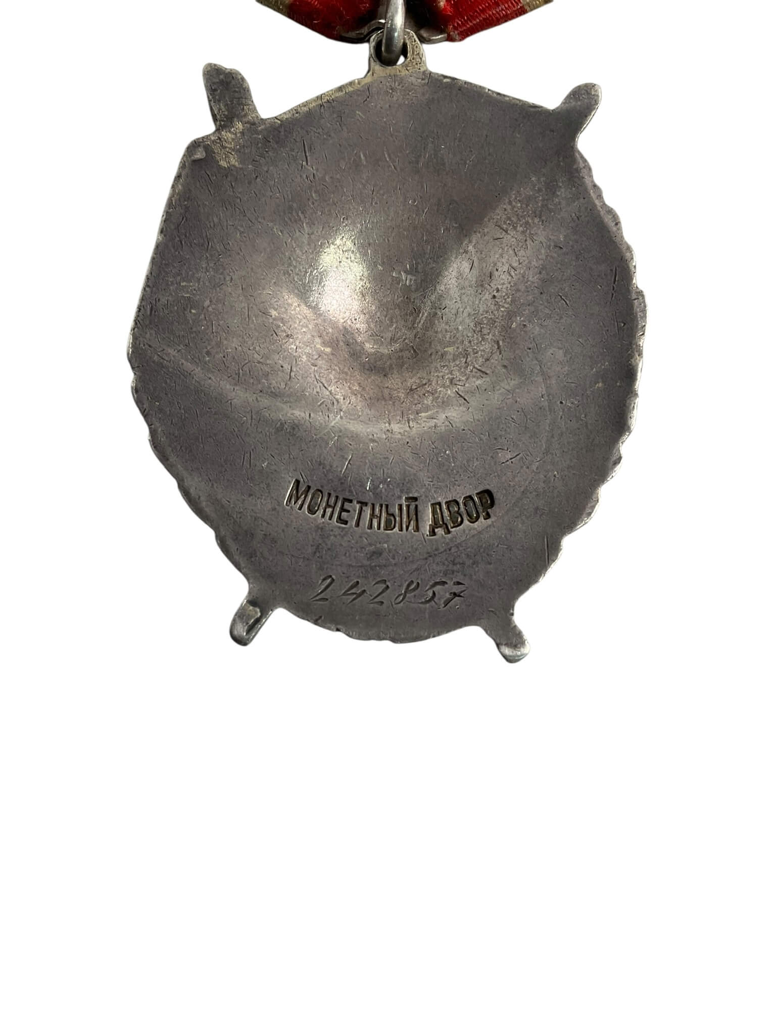 The Order of the Red Banner was one of the Soviet Union’s earliest and most distinguished military decorations, instituted in 1918. It was awarded to military personnel and units for exceptional courage, dedication, and leadership in combat. This original example features the classic design of a red-enamelled banner inscribed with “Proletarians of all countries, unite!” and the hammer and sickle emblem, set atop a silver starburst with crossed rifles. Each decoration bears a unique numbered serial on the reverse, corresponding to its official award documentation. This item includes detailed research relating to its issuance and the recipient’s service, providing historical context and verification. Recipients of the Order of the Red Banner served in various significant campaigns throughout the Second World War, contributing to the medal’s legacy as a symbol of valor in Soviet military history. The Order reflects both the art of Soviet-era craftsmanship and the history of the Red Army during World War II.