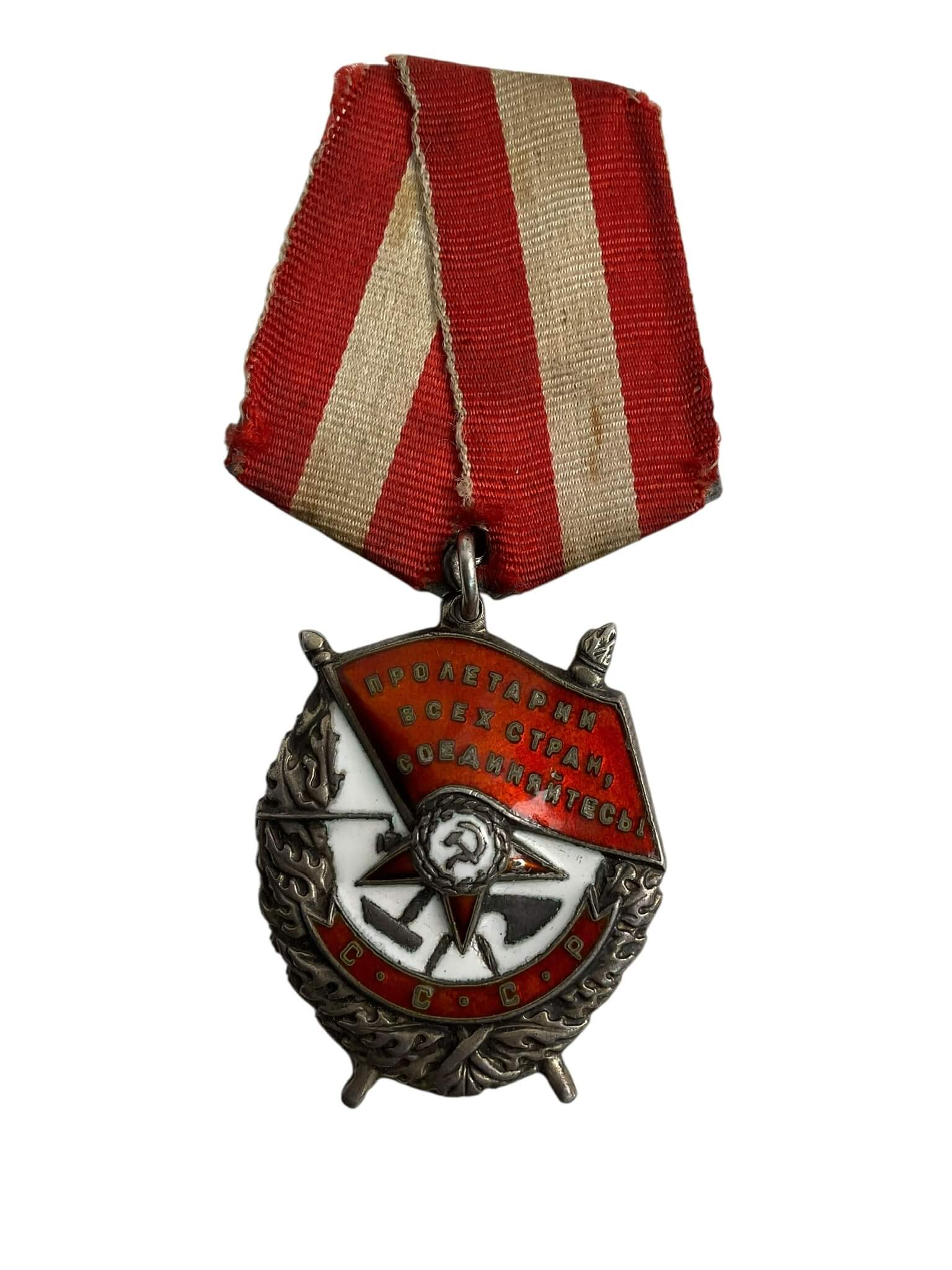 The WW2 Russian Soviet Order of the Red Banner was one of the Soviet Union’s earliest and most esteemed military decorations. Established in 1918, it recognized military personnel who demonstrated exceptional courage, self-sacrifice, and leadership in combat. The medal features a red enameled banner bearing the words “Proletarians of all countries, unite!” above a central medallion with the hammer and