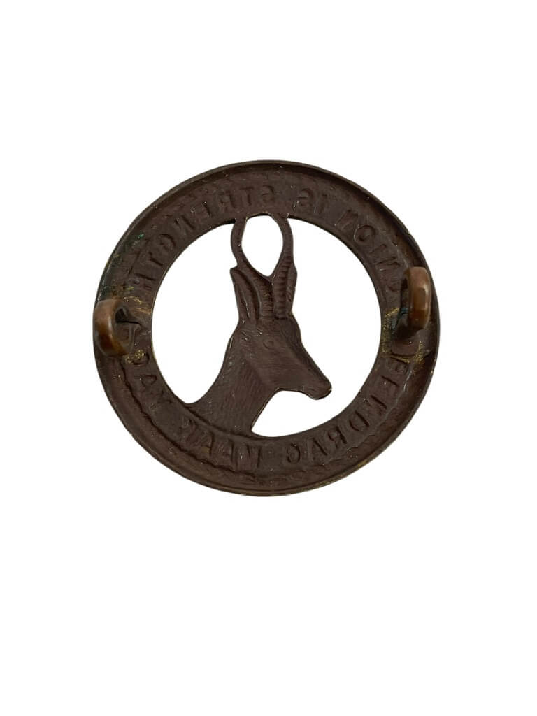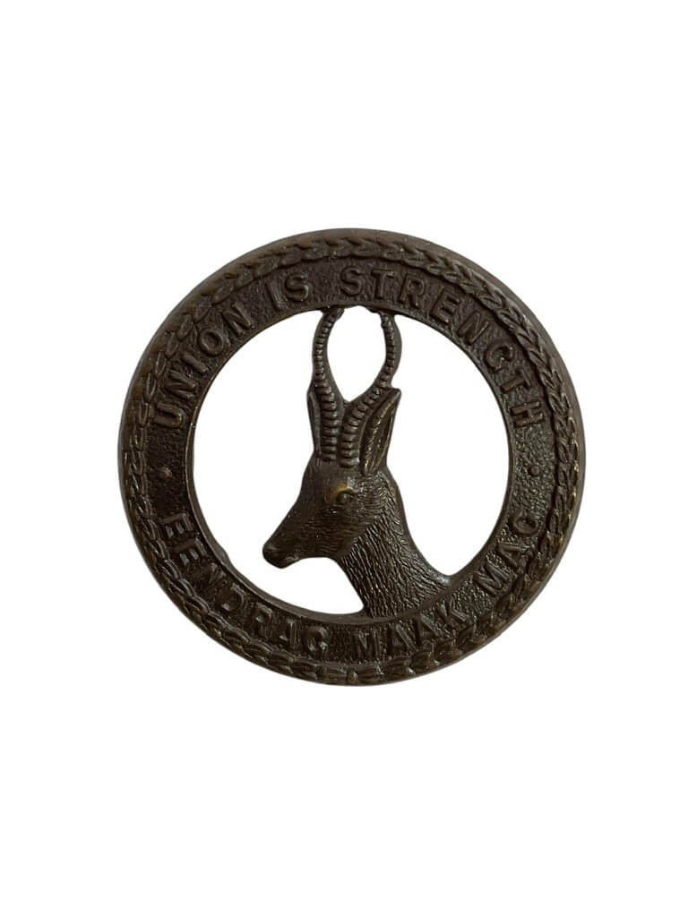 The ‘WW2 South African Infantry Cap Badge’ is a remarkable historical artifact from the era of World War II. This emblem, worn on the headgear of South African infantrymen, signifies the bravery and honour of the soldiers who served in the global conflict. The badge, typically made from brass or other durable metals, features intricate designs that highlight the unique identity of the South African military. It often displays the country’s coat of arms or other national symbols, symbolizing the wearers’ loyalty to their nation. The WW2 South African Infantry Cap Badge is an emblem of service and duty, and it serves as a tangible link to the past. Collectors and history enthusiasts around the world cherish it for its historical significance and the stories of valor and duty it represents. It offers a captivating glimpse into the military history of South Africa during one of the most tumultuous periods in world history.