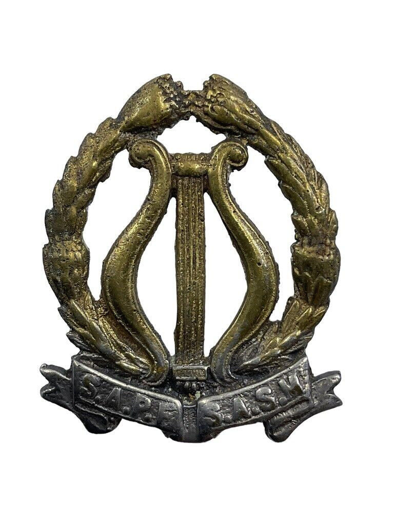 The “WW2 South SAPF Permanent Force Band Cap Badge” is a distinguished insignia worn by the South African Permanent Force Band members during World War II. This badge served not only as a symbol of the band’s official status but also as a emblem of pride and identity for its wearers. Crafted with meticulous detail, the badge typically features iconic imagery and emblems reflective of South African military heritage. Made from durable materials, it was designed to be affixed to the band’s uniform caps, ensuring easy recognition and differentiation from other military units. Collectors and historians value this badge for its historical significance and its representation of the musical contributions to morale and ceremonial duties during the war. Today, it stands as a poignant reminder of the vital role that music and its performers played in boosting the spirits of troops and civilians alike during one of history’s most challenging periods.
