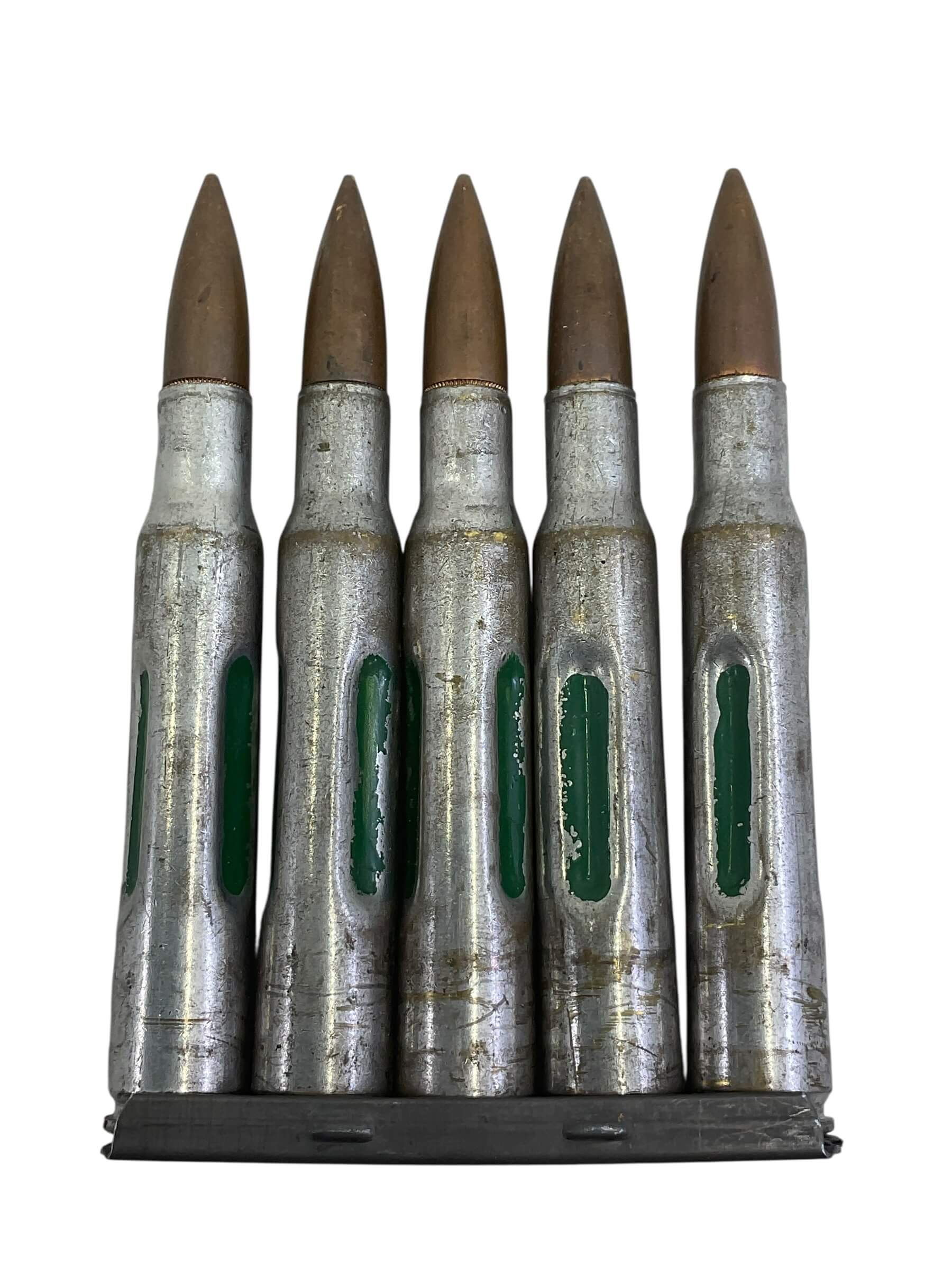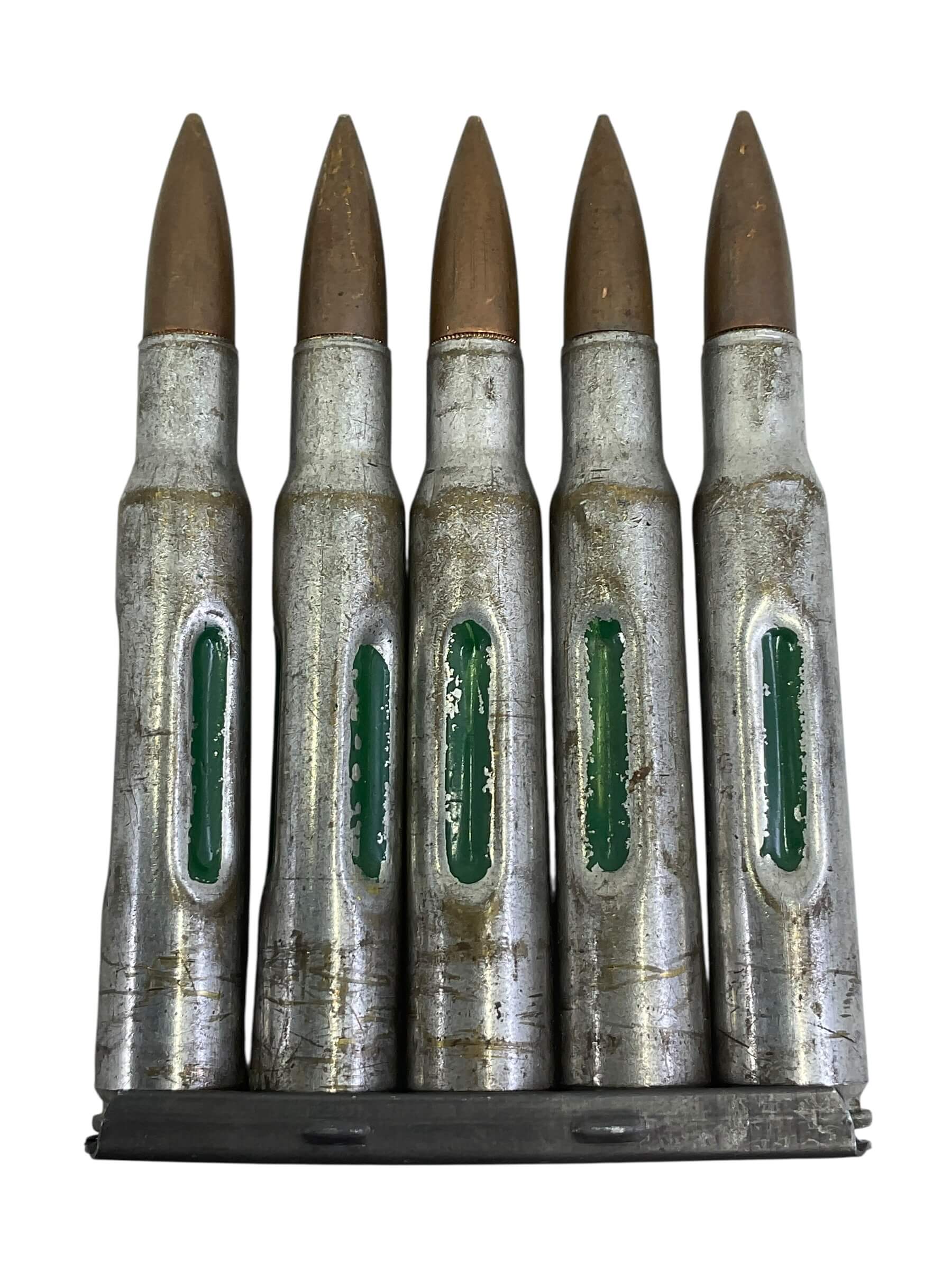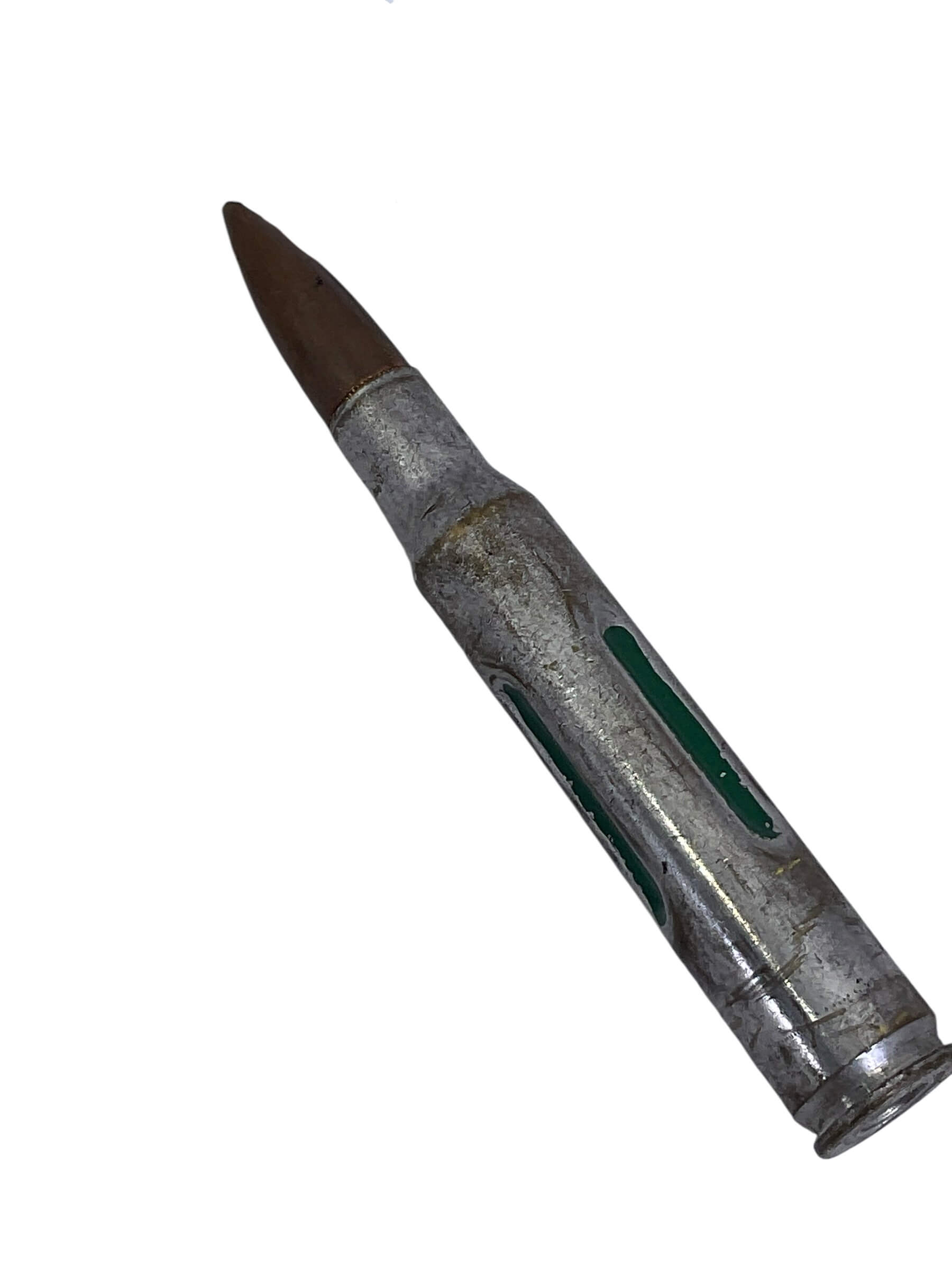 The WW2 US .30-06 Springfield Dummy Rounds INERT are non-functional replicas of the standard .30-06 Springfield ammunition used by United States forces during the Second World War. Manufactured to serve as training rounds, these inert cartridges were utilized for weapon handling instruction, loading and unloading drills, and mechanical function testing. The dummy rounds are constructed to match the dimensions and exterior appearance of live ammunition. Typically, they include identifying features such as fluted cases, drilled holes, or other markings to distinguish them from live rounds and to indicate the absence of powder and primer. The .30-06 Springfield cartridge was the primary rifle and machine gun round for the U.S. military from 1906 through the post-war era, notably chambered in the M1903 Springfield rifle, M1 Garand, and Browning Automatic Rifle. These inert rounds serve as historical artifacts, reflecting period-accurate design and manufacturing methods without posing any explosive risk.