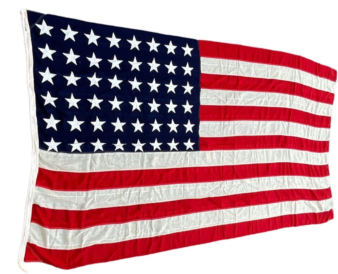 This vintage WW2 US 48 Star Flag, measuring an impressive 12 feet long by 6.5 feet wide, is a remarkable piece of history and craftsmanship. Made in Canada during the World War II era, this flag symbolizes a significant period in American history with its 48 stars, representing the states of the Union at that time. Crafted from durable bunting material, it exudes the robust and enduring spirit of that era. This flag would have likely been used for official ceremonies, parades, or as a patriotic display, embodying the unity and resilience of the United States during the 1940s. Its considerable size makes it a striking and meaningful addition to any historical collection or patriotic display, preserving the legacy of a defining moment in American and global history.