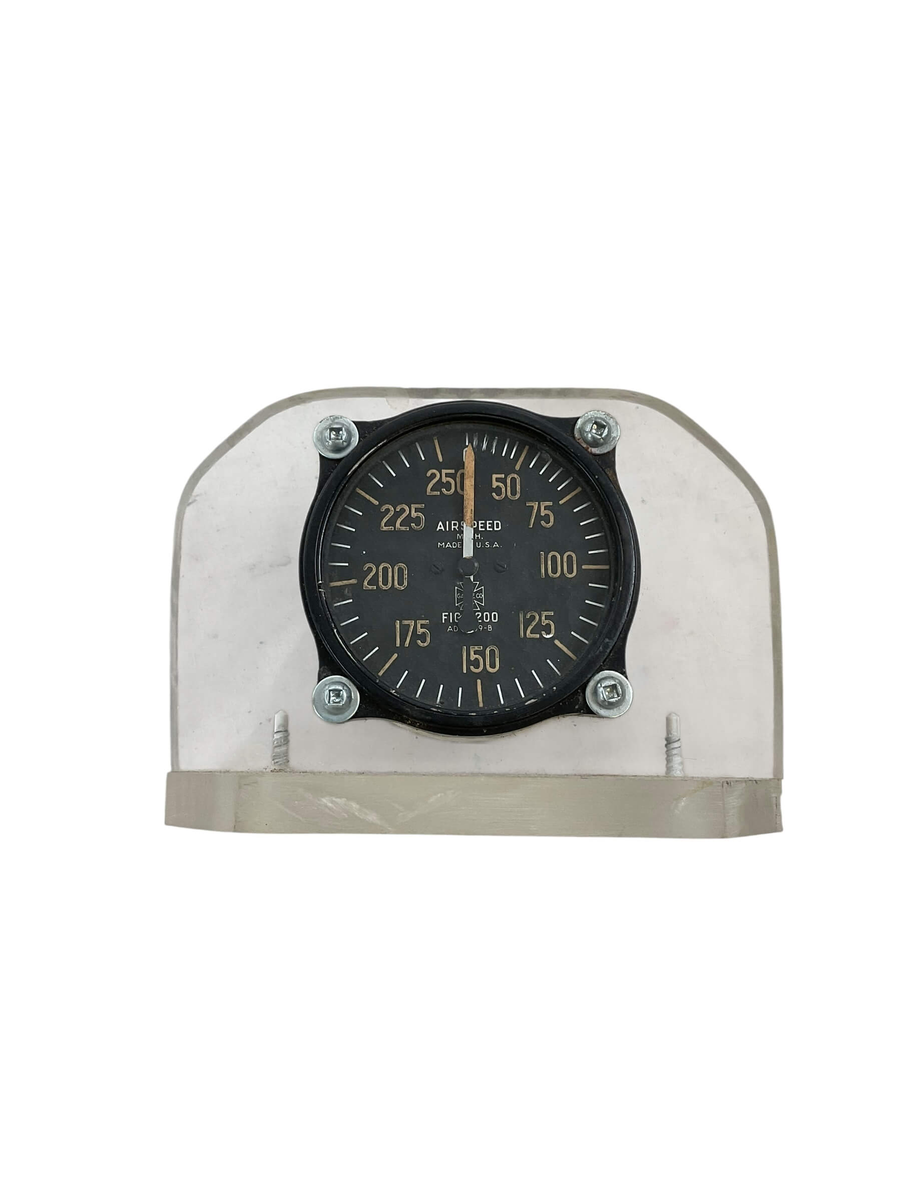 The ‘WW2 US Aircraft Airspeed Indicator’ is a vintage aviation instrument designed and used primarily during the Second World War in American military aircraft. This device played a crucial role in flight operations, providing pilots with real-time data on their aircraft’s speed relative to the surrounding air. Constructed with a mix of metals and glass, it features a circular face with engraved numeric values and a moving pointer, a design that is both simple and functional. The airspeed indicator often had its place in the cockpit’s central panel, providing easy visibility for the pilot. It is an iconic memento from a significant period in aviation history, symbolizing the technological advancements of that era. Collectors and history enthusiasts value it not only for its historical significance but also for the glimpse it provides into the engineering and design aesthetics of the period.