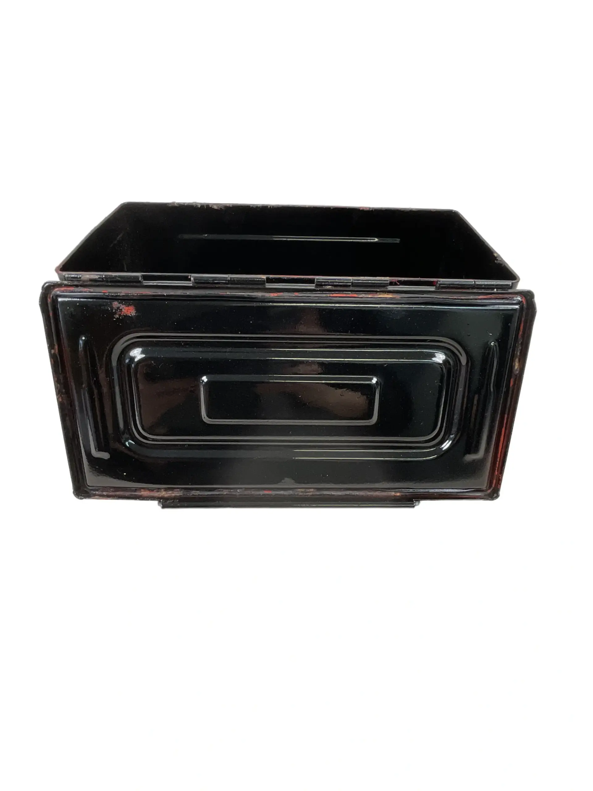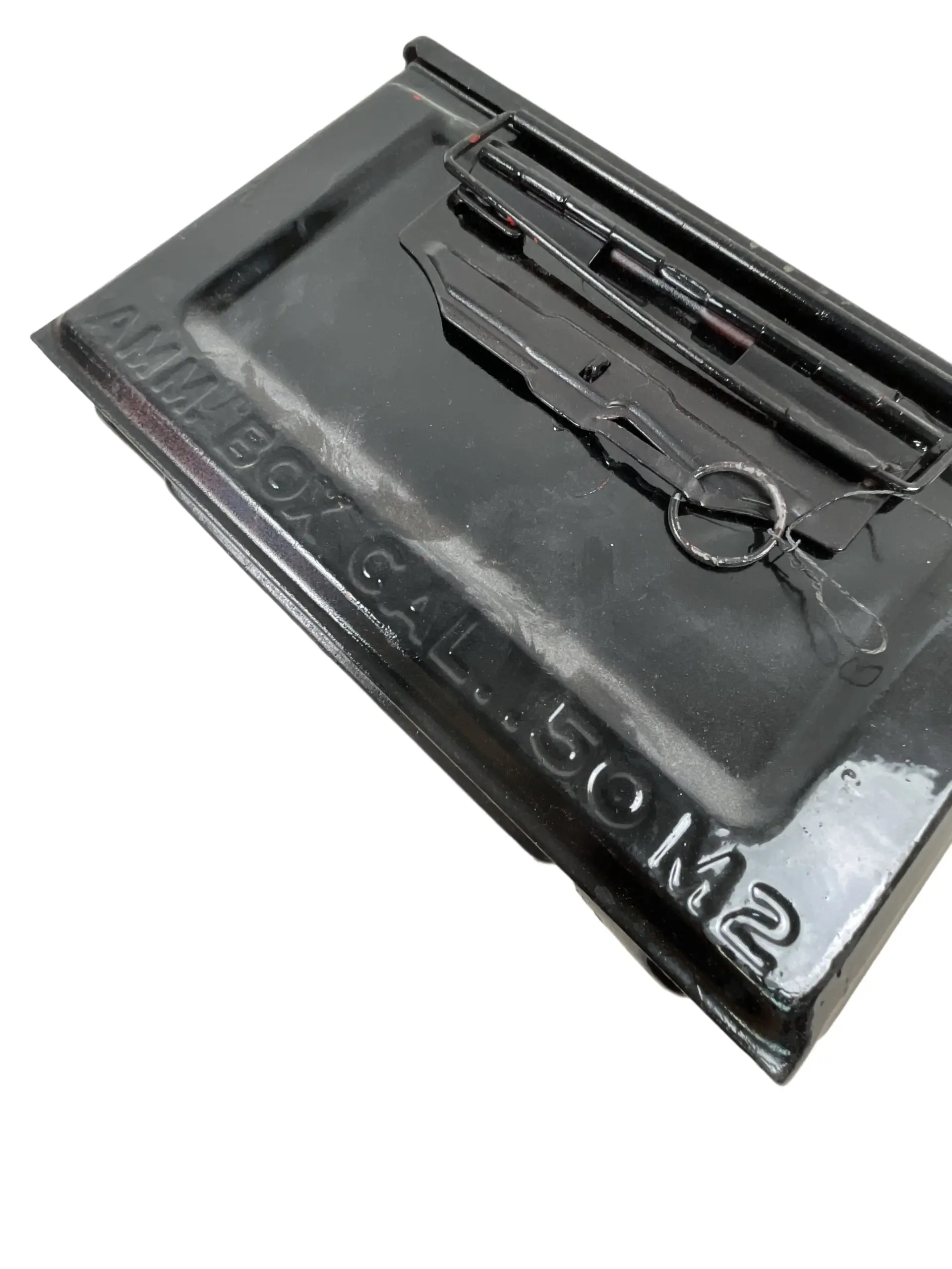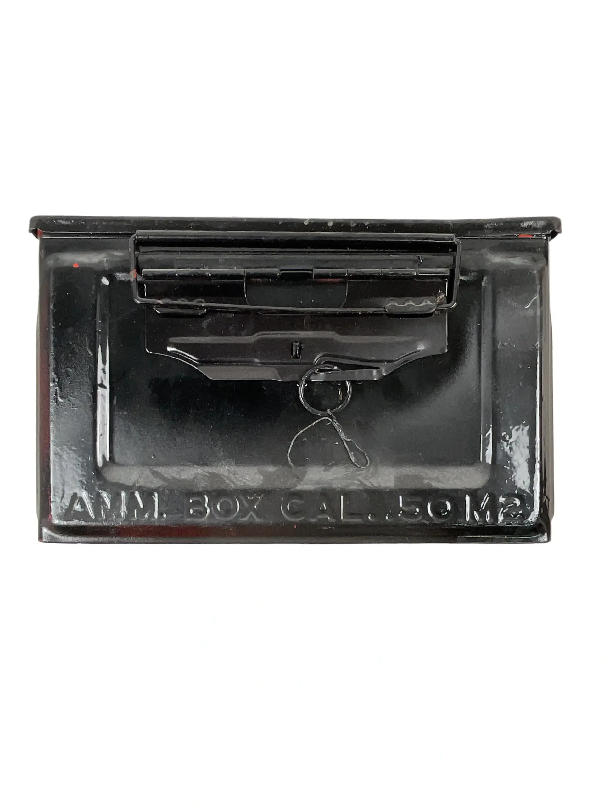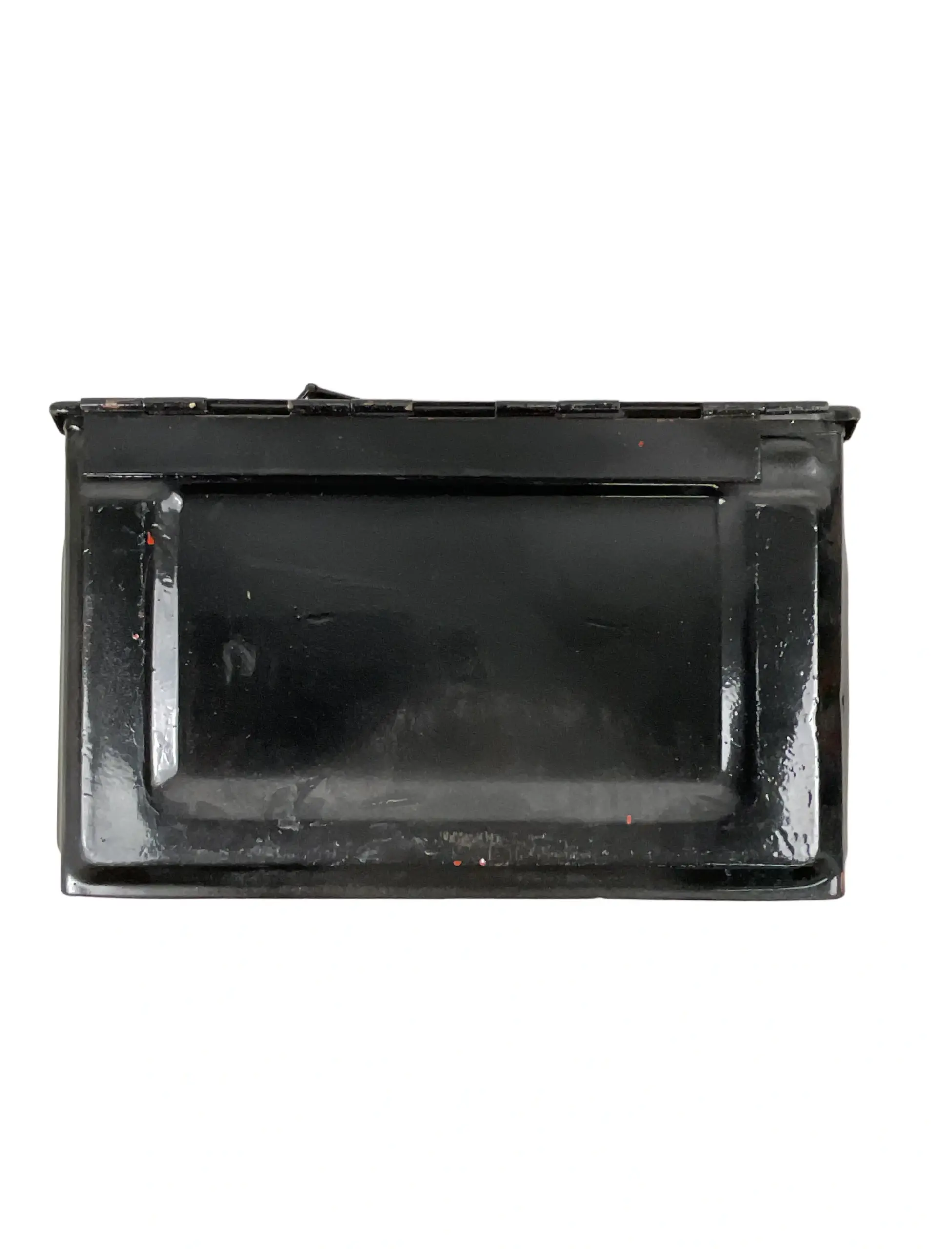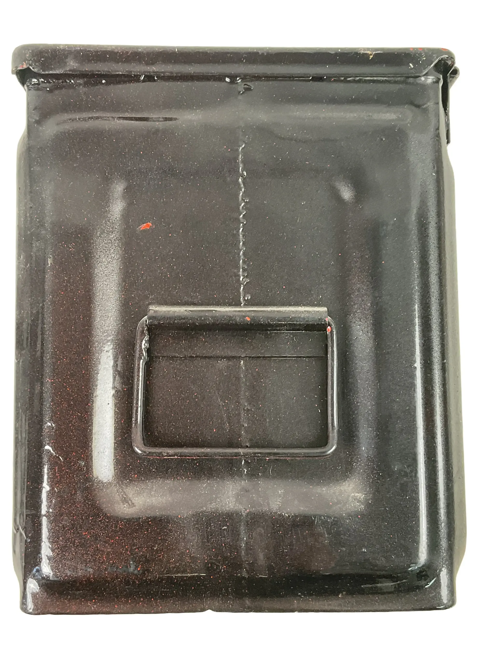 The WW2 US Army 50 Caliber Ammo Can is a storage container originally designed to hold .50 caliber ammunition for the United States Armed Forces during the Second World War. Manufactured from durable steel, the can features a hinged lid with a rubber gasket, providing a moisture-resistant seal to protect ammunition from environmental conditions. Typical dimensions are approximately 12 inches in length, 6 inches in width, and 7 inches in height. The exterior is usually finished in olive drab, marked with stenciled lot numbers and caliber designation. The robust build and convenient folding handle made it suitable for active military operations, ensuring safe transport of ammunition to the front lines. After World War II, these containers have been repurposed for various storage needs due to their rugged construction. This item is sold empty and retains the historical characteristics and functional design representative of mid-20th-century military equipment.