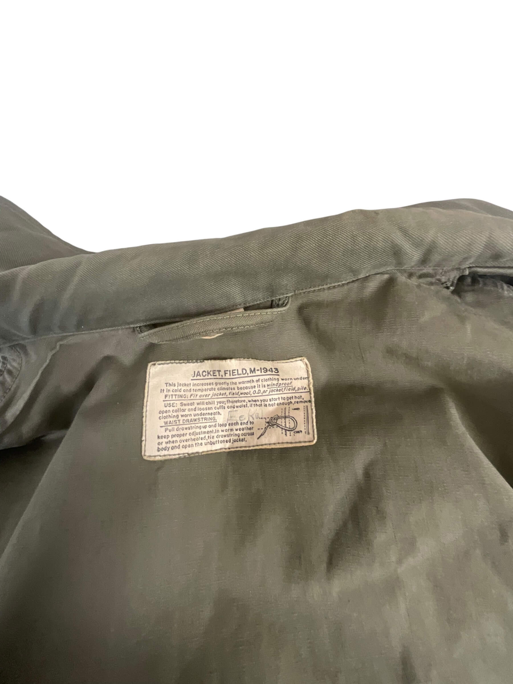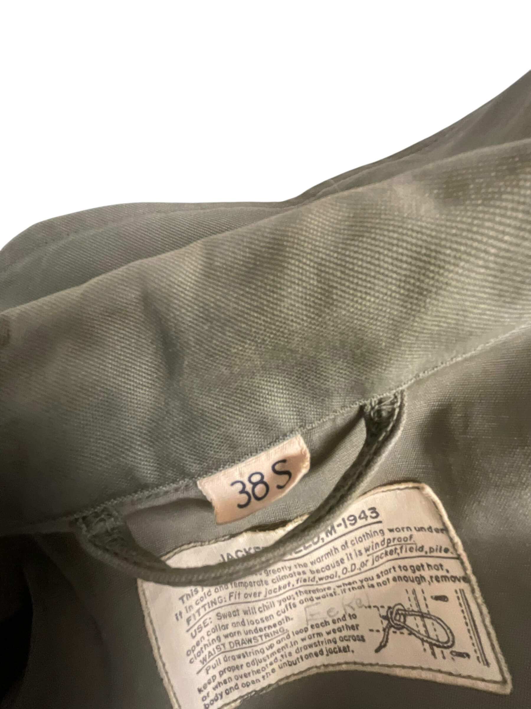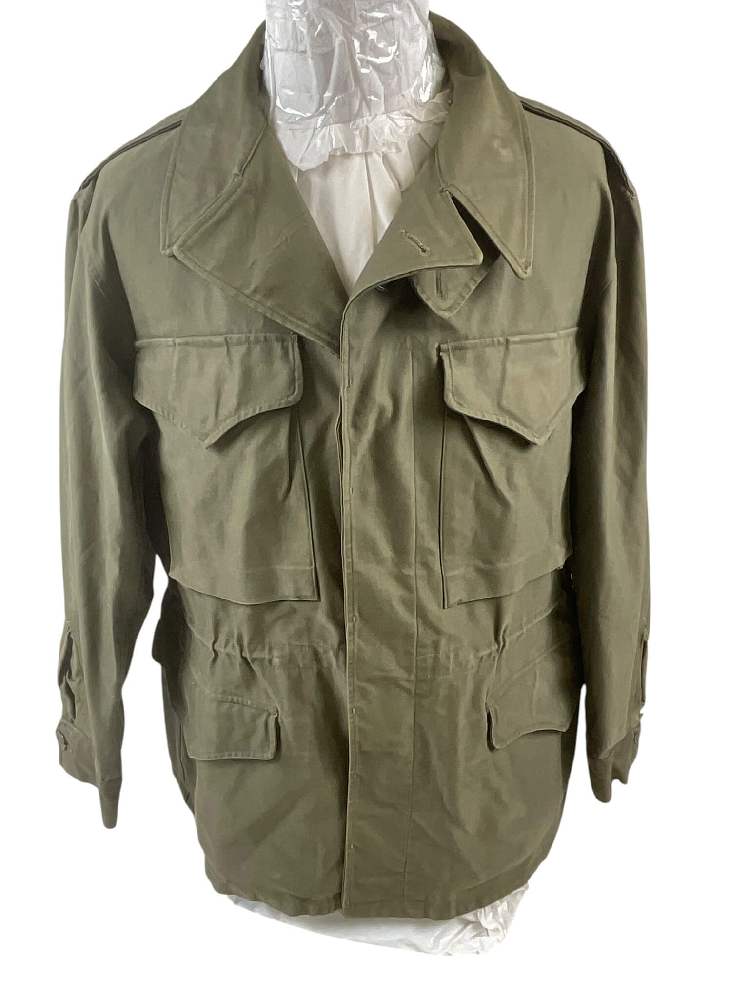 The WW2 US Army Field Jacket M43, size 38 Short, is an example of the standardized outerwear issued to American ground forces beginning in 1943. Officially designated as the M-1943 field jacket, this garment reflects the transition toward more practical and versatile military clothing during World War II. Constructed from olive drab cotton sateen, the M43 features a button-front closure, concealed thigh-length coverage, and adjustable cuffs. Four front pockets—including two chest and two lower cargo pockets—provide utility and accessible storage. The size 38 Short is designed for individuals with a chest measurement of approximately 38 inches and a shorter sleeve and torso length. The M43 jacket’s design prioritized both comfort and adaptability, allowing for additional layering in various weather conditions. This type of field jacket was widely used by US Army infantry and airborne units from late 1943 through the end of the war, setting the template for subsequent US military field jackets in the postwar era.