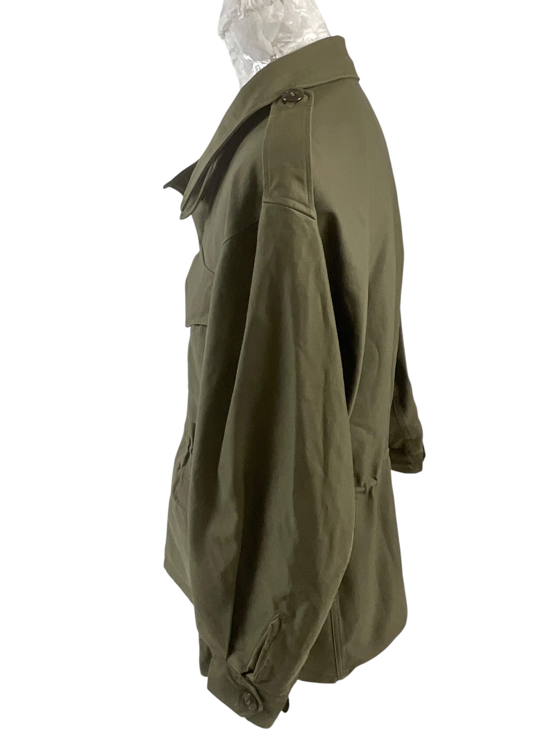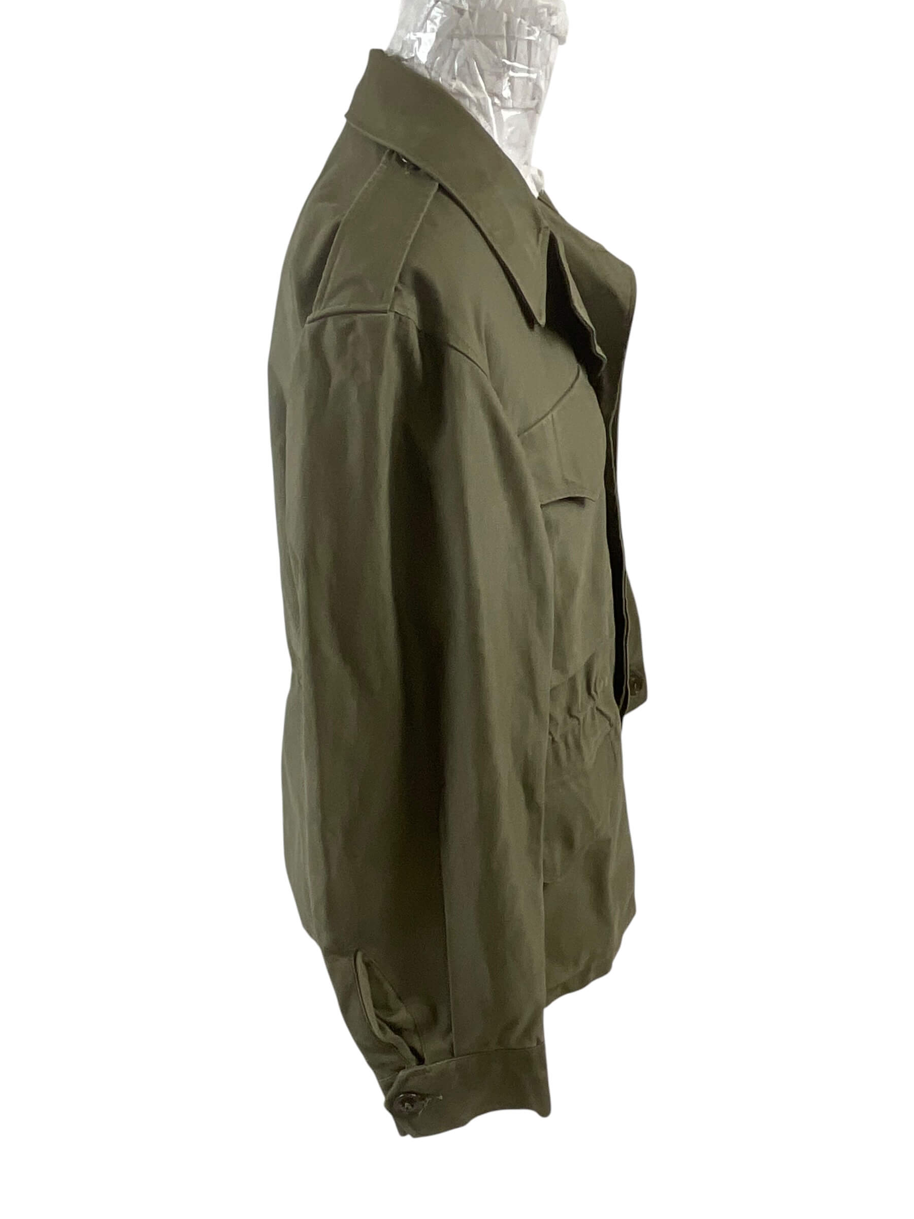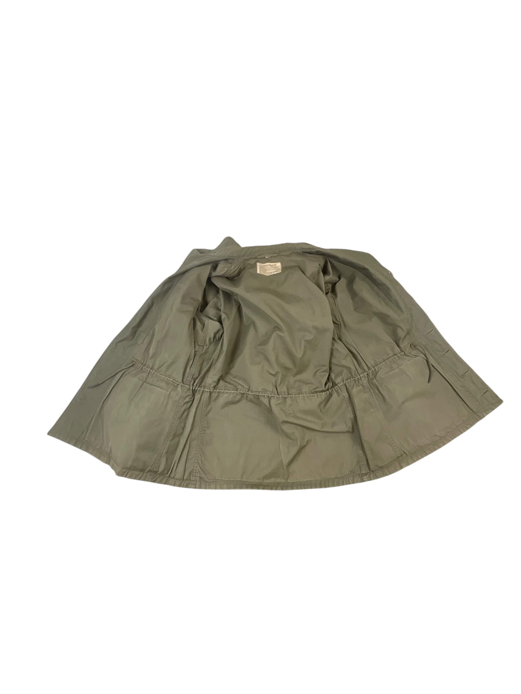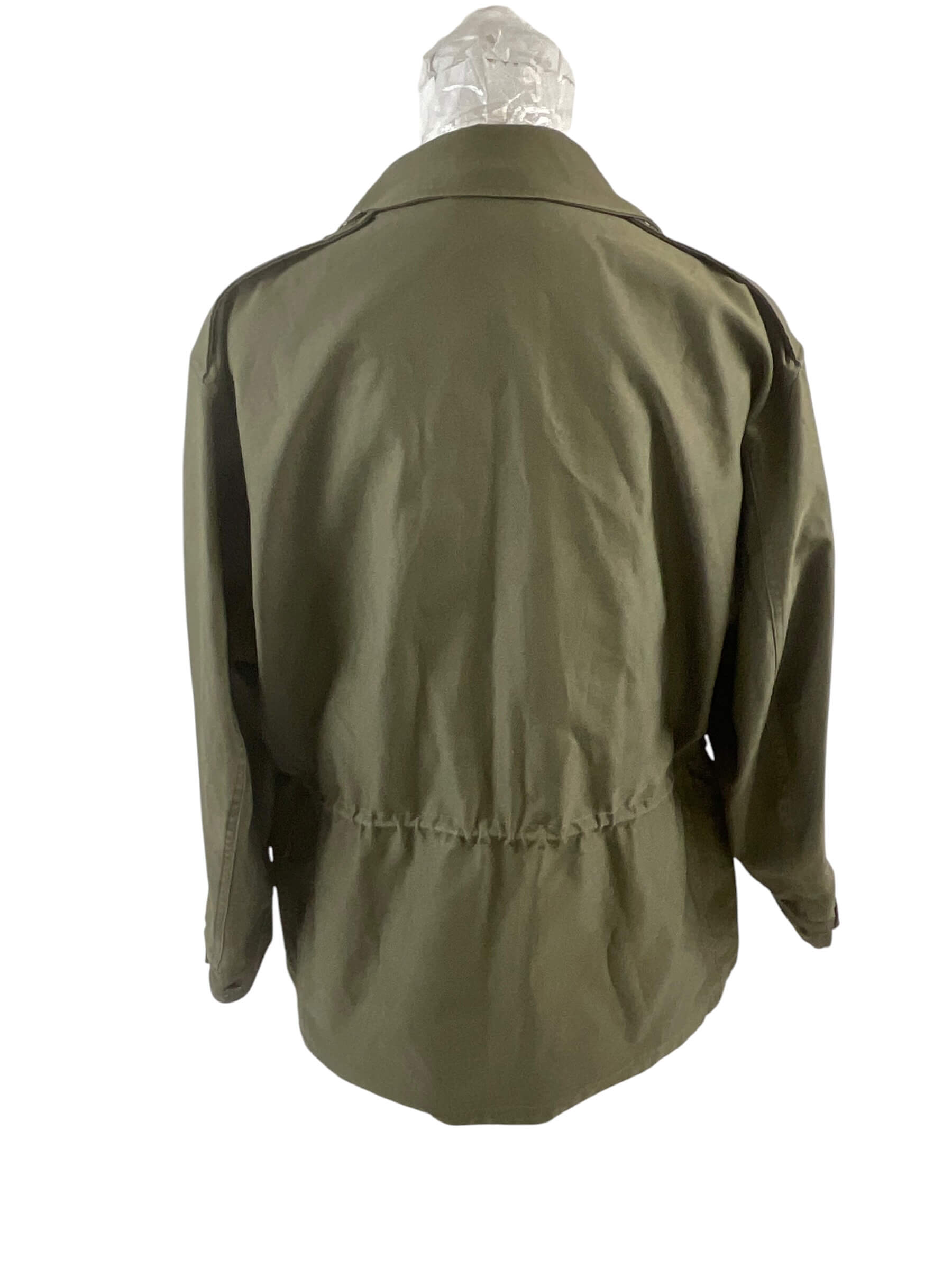The WW2 US Army Field Jacket M43, size 38 Short, is an example of the standardized outerwear issued to American ground forces beginning in 1943. Officially designated as the M-1943 field jacket, this garment reflects the transition toward more practical and versatile military clothing during World War II. Constructed from olive drab cotton sateen, the M43 features a button-front closure, concealed thigh-length coverage, and adjustable cuffs. Four front pockets—including two chest and two lower cargo pockets—provide utility and accessible storage. The size 38 Short is designed for individuals with a chest measurement of approximately 38 inches and a shorter sleeve and torso length. The M43 jacket’s design prioritized both comfort and adaptability, allowing for additional layering in various weather conditions. This type of field jacket was widely used by US Army infantry and airborne units from late 1943 through the end of the war, setting the template for subsequent US military field jackets in the postwar era.