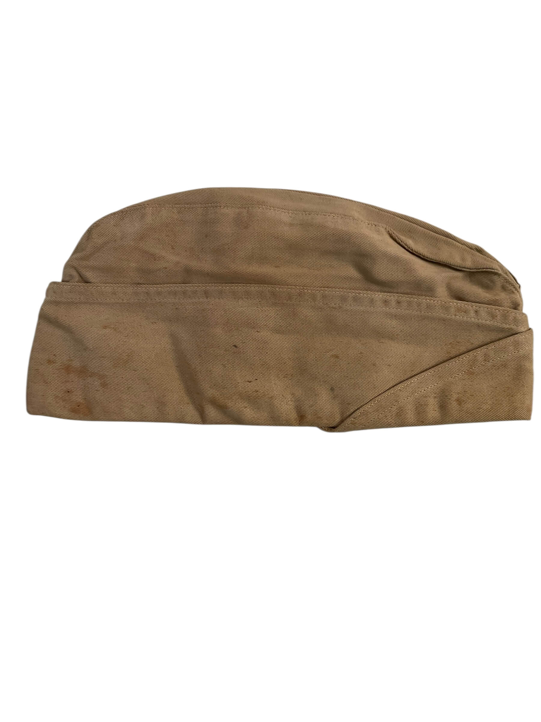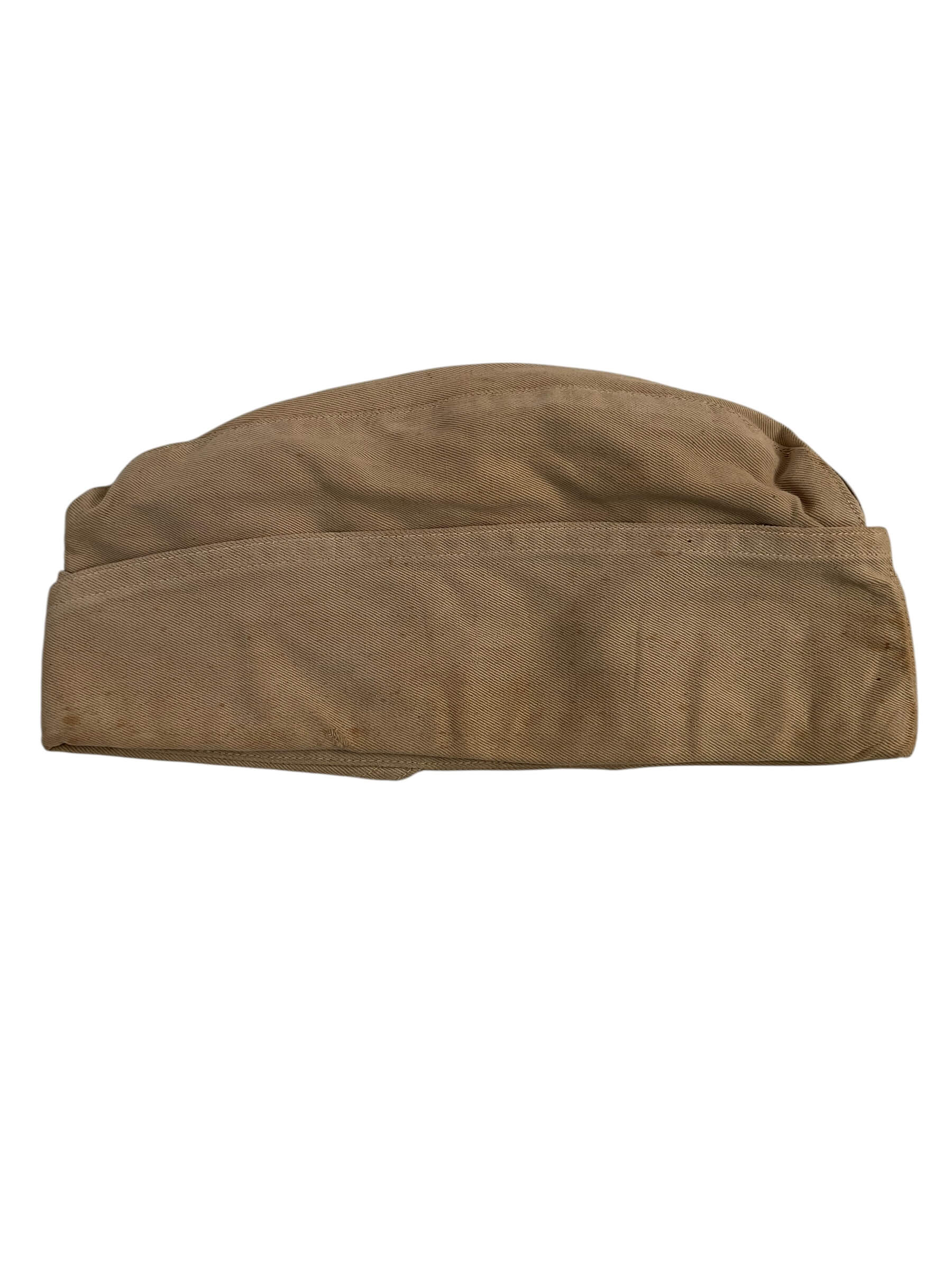 The WW2 US Army Garrison Cap, Tan, Size 7, is an original uniform component issued to United States Army personnel during the Second World War. The garrison cap, also referred to as a “side cap” or “overseas cap,” served as a standard piece of dress for soldiers when wearing the service uniform. Made from khaki-colored fabric, this cap features a foldable, flat design that allowed for easy storage in pockets when not in use. The tan color designated wear by Army personnel in warmer climates or with the summer service uniform. Size 7 corresponds to a head circumference of approximately 22 inches (56 cm). The cap typically incorporates reinforced stitching and may include provisions for distinctive branch piping or insignia, depending on unit assignment. This example is representative of the period and provides historical insight into standard US Army headgear during World War II.