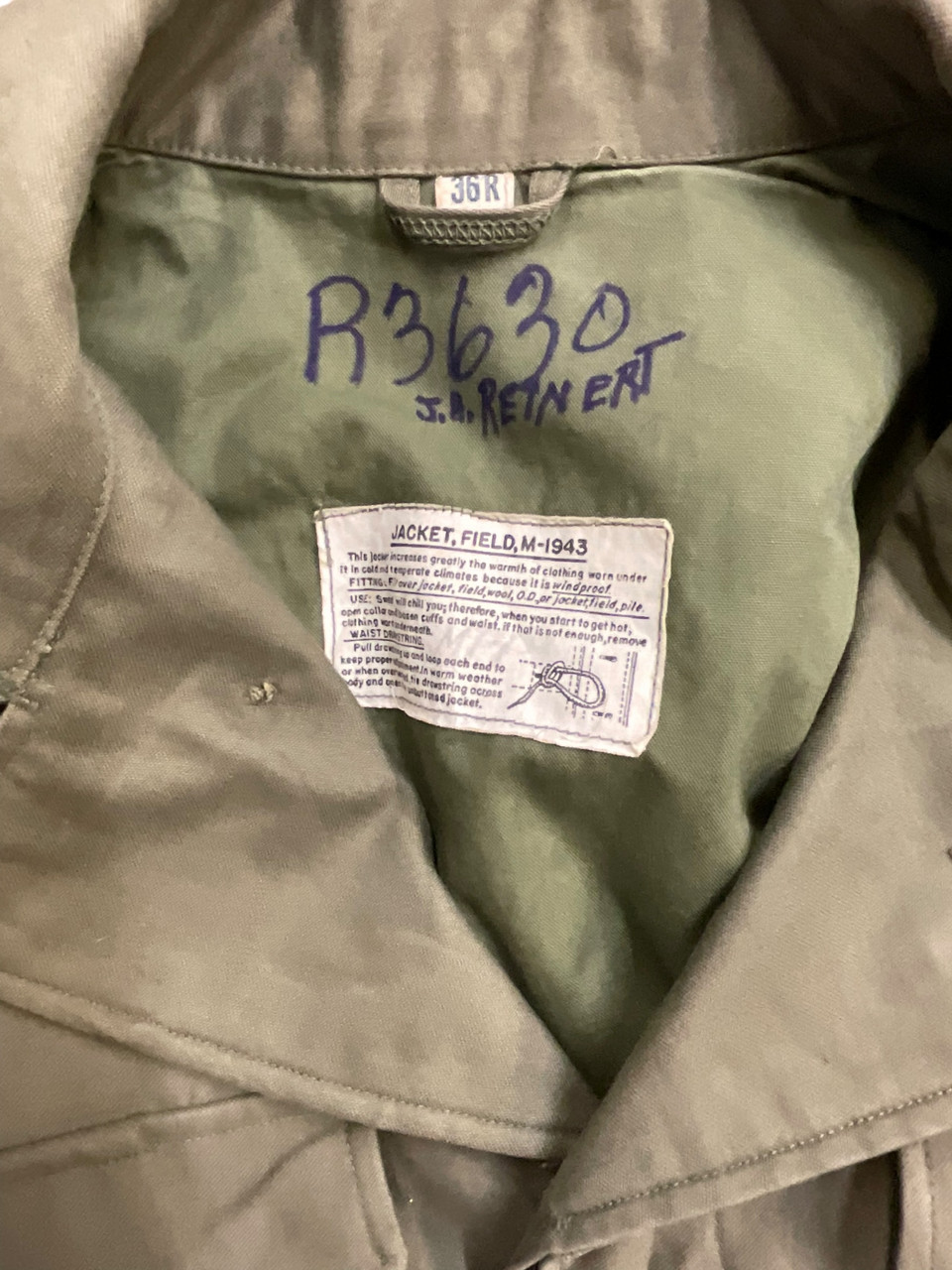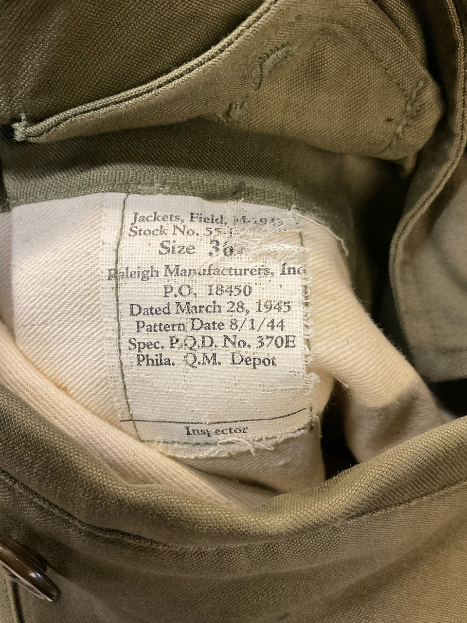 WW2 US Army M43 Field Jacket 370E 1945 Dated with Hood Size 36R