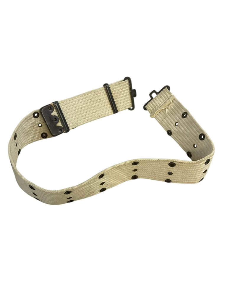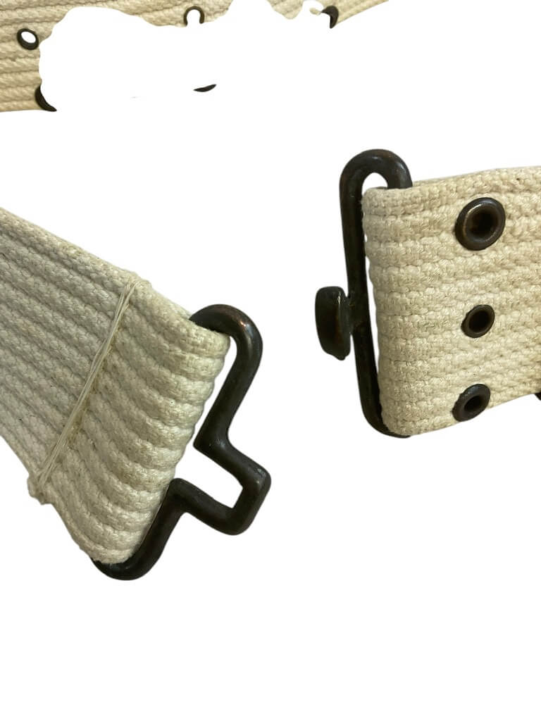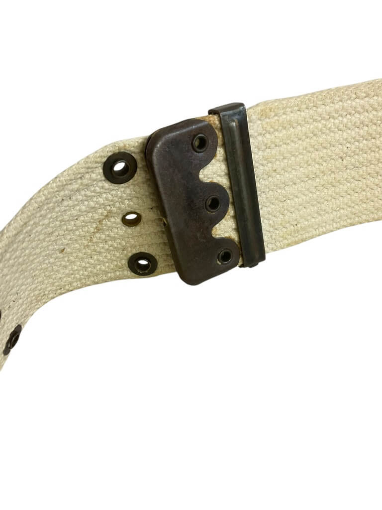 This WW2 US Army Military Police (MP) White Dress Web Pistol Belt is a remarkable piece of military memorabilia. This authentic artifact, designed to carry the standard issue sidearm of the Military Police during the Second World War, is steeped in historical significance. It is crafted from durable white webbing, reflecting the dress uniform standards of the era. The belt features a robust brass buckle for secure fastening and adjustment to fit. As a militaria collectible, it serves as a tangible reminder of the bravery and service of the U.S. Army Military Police during one of the most challenging periods in world history. This belt is not just a piece of military equipment, but a symbol of the valor and dedication of those who served in the line of duty.