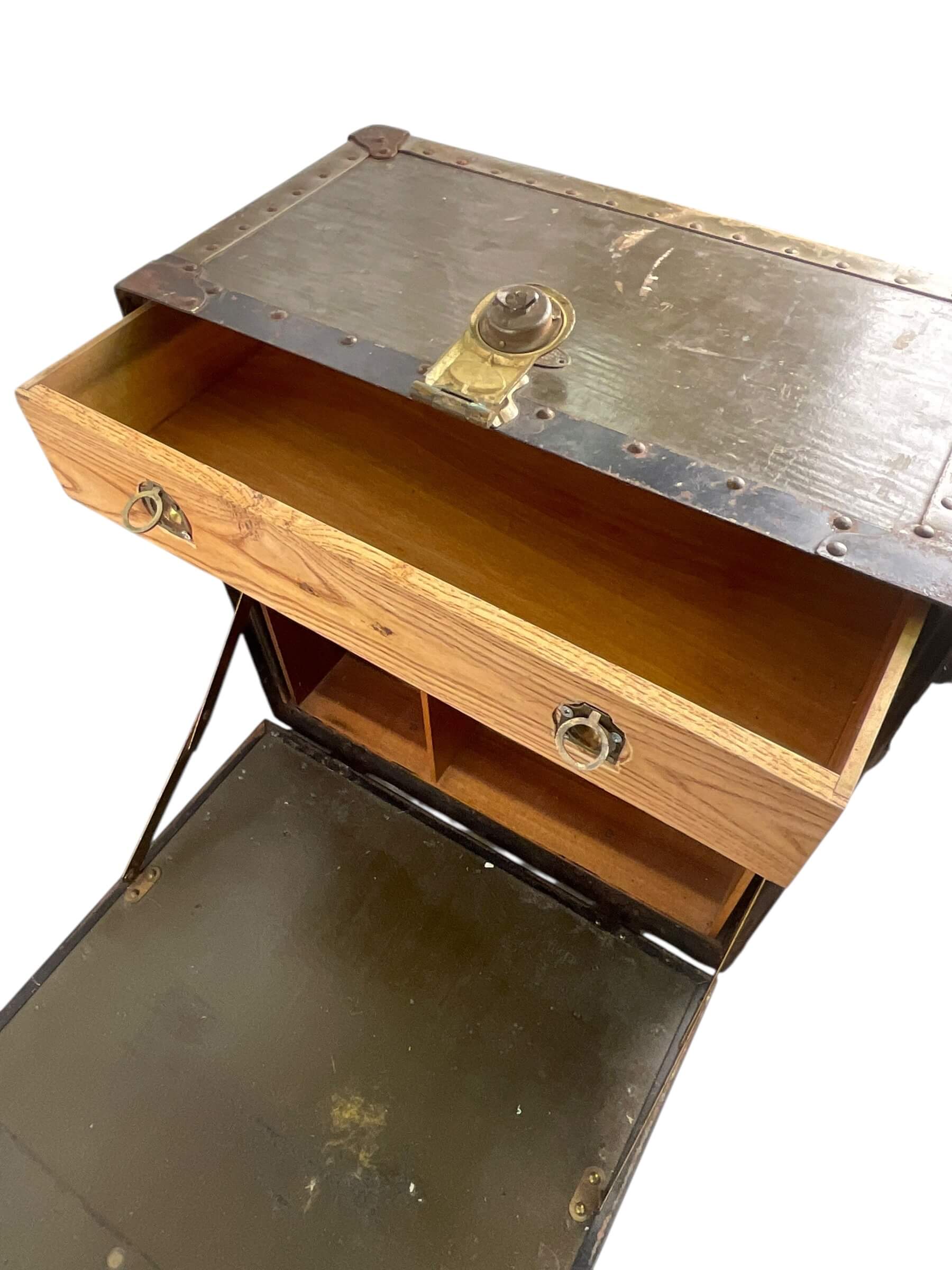 The WW2 US Army Officers Barracks Box, sized at 20″ X 19″ X 10″, is a historical military artifact utilized during the Second World War. Primarily used by officers in the American army, these boxes served as personal storage units in barracks, facilitating the safekeeping of crucial documents, personal belongings, and small pieces of equipment. Crafted from sturdy wood, the box exhibits robust construction, with metal reinforcements for added durability and security. It features handling on its sides for ease of transport. The box is usually found in a deep olive drab color, representative of the US military color scheme of the era. It carries both chronological and cultural significance, reflecting a tangible piece of wartime history and offering insight into the living conditions of army officers during WW2. It does not include any fakes or reproductions unless explicitly stated in the title.
