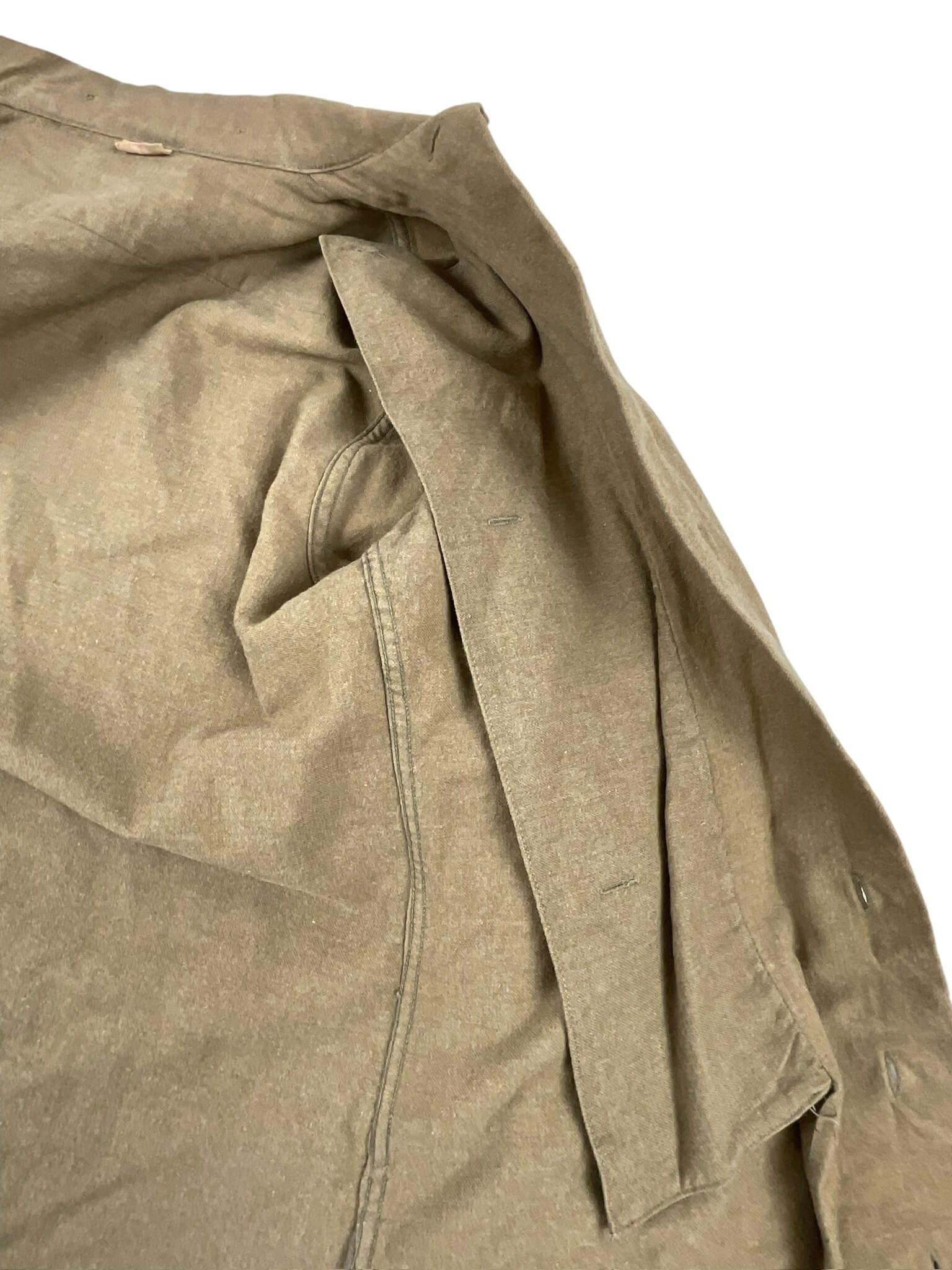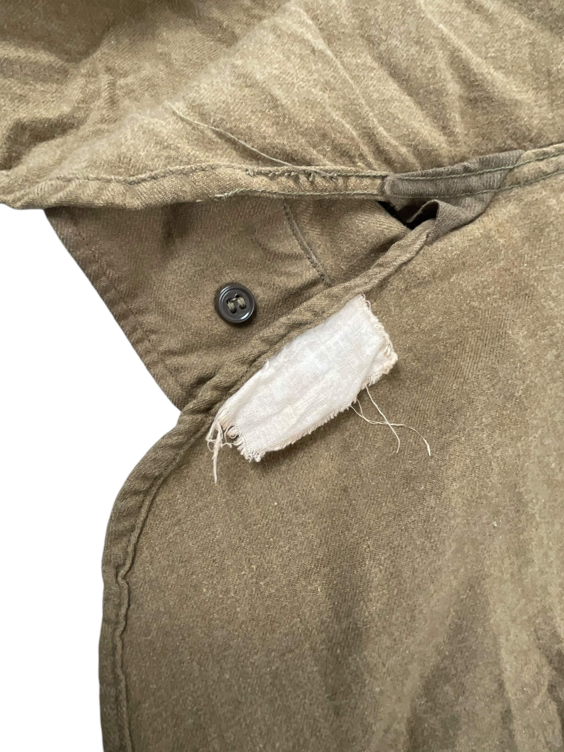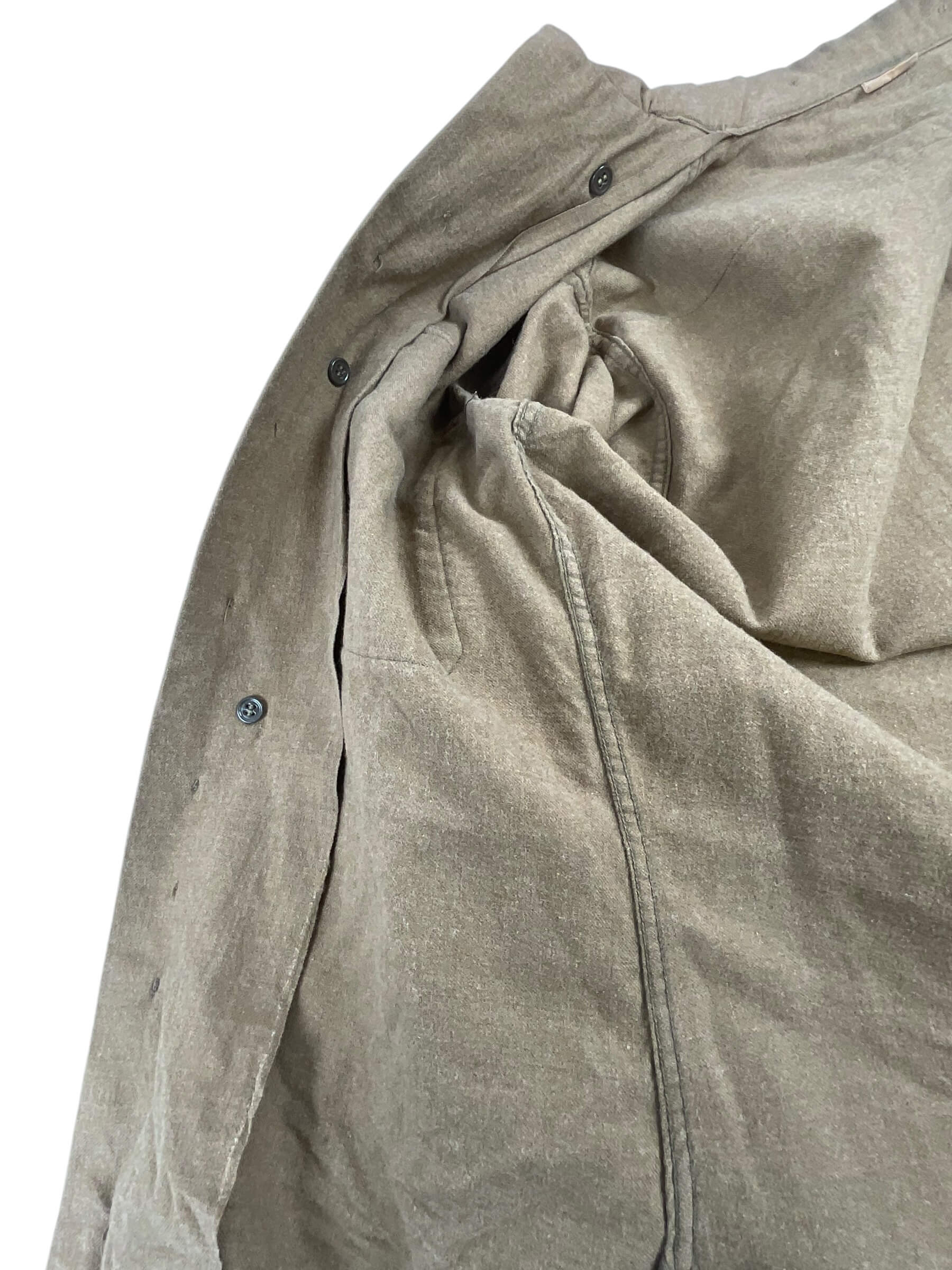 This is an authentic WW2 US Army Other Ranks Shirt, size 14 1/2, complete with its original gas flap, a feature designed to shield soldiers from chemical warfare. This impressive piece of military history is made from high-quality olive drab wool and features two chest pockets and a standard collar. The addition of the gas flap, which can be buttoned across the face, makes this a rare find for any collector. The shirt is in excellent condition, considering its age and historical significance. It stands as a tribute to the brave soldiers who fought in World War II and provides a tangible link to an important period of American history. This item would make a remarkable addition to any military memorabilia collection or could be used in historical reenactments.
