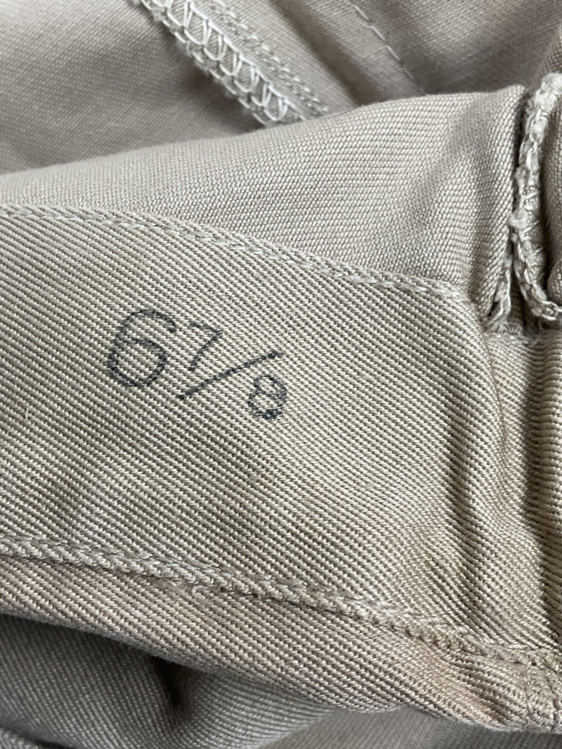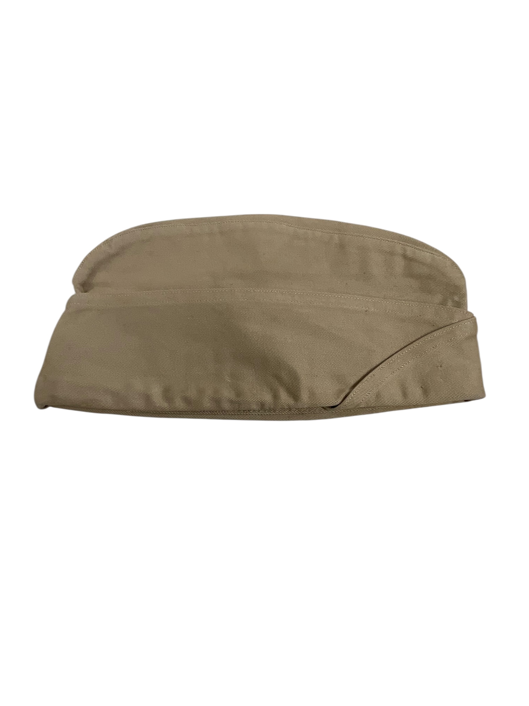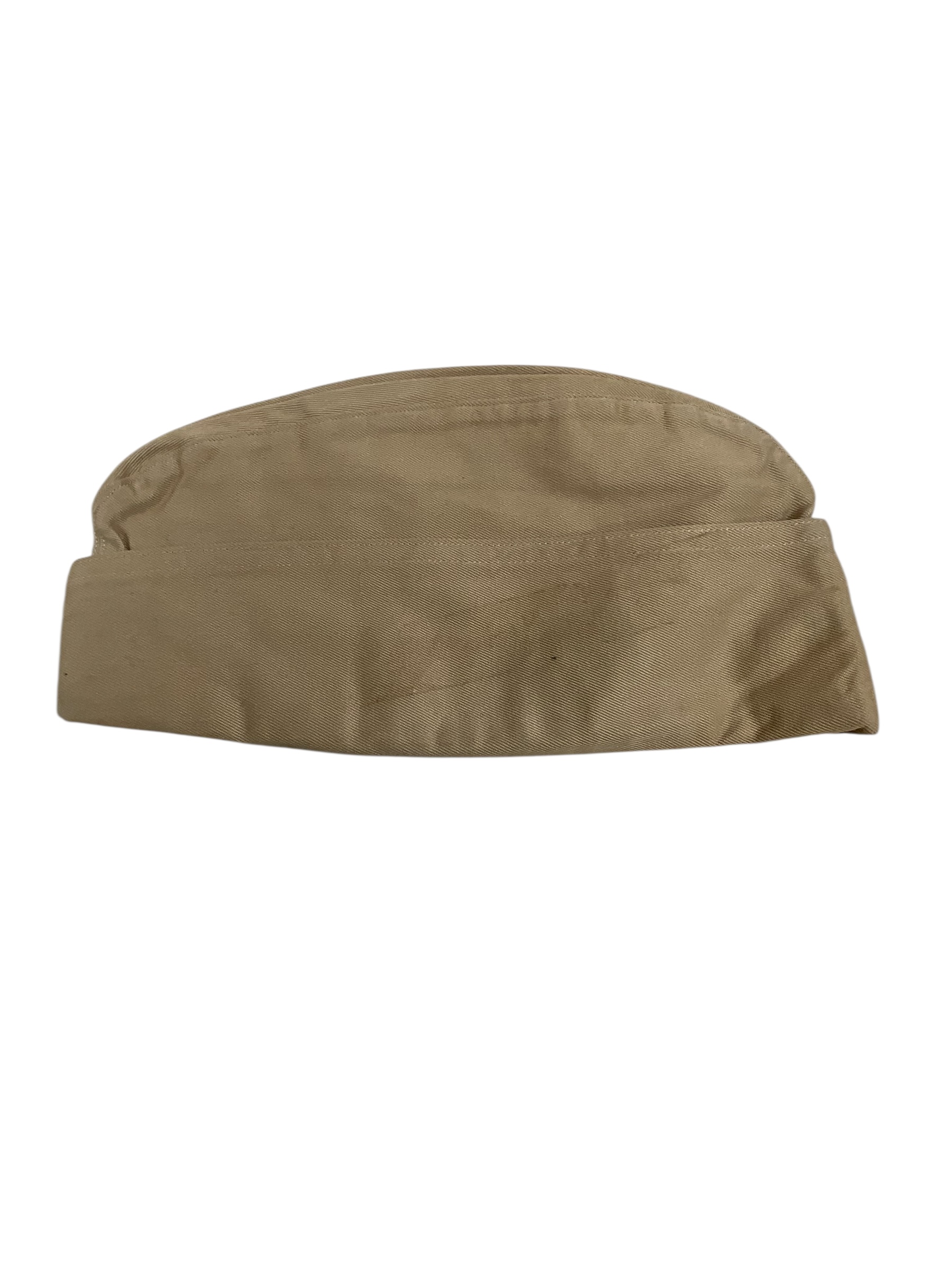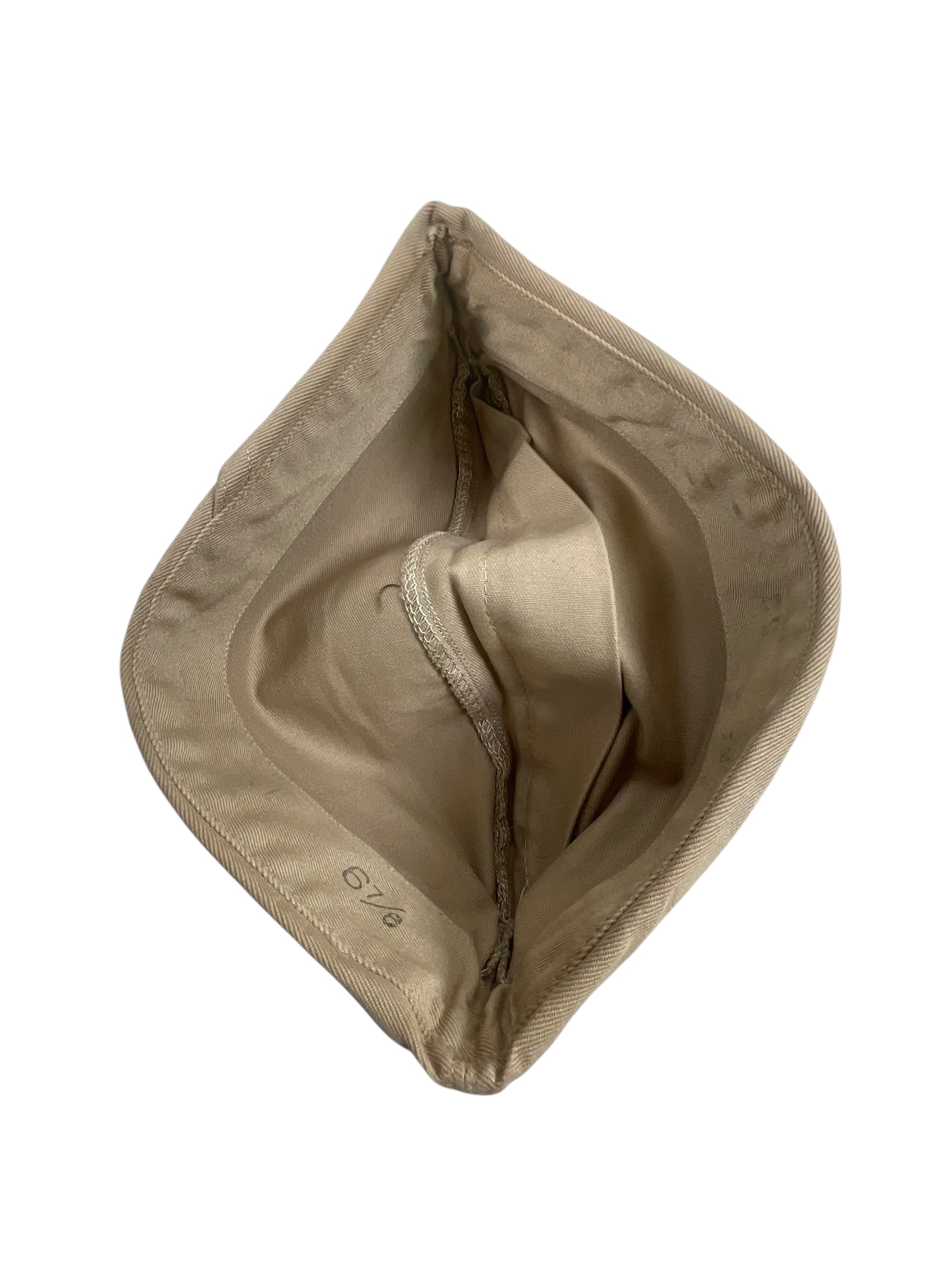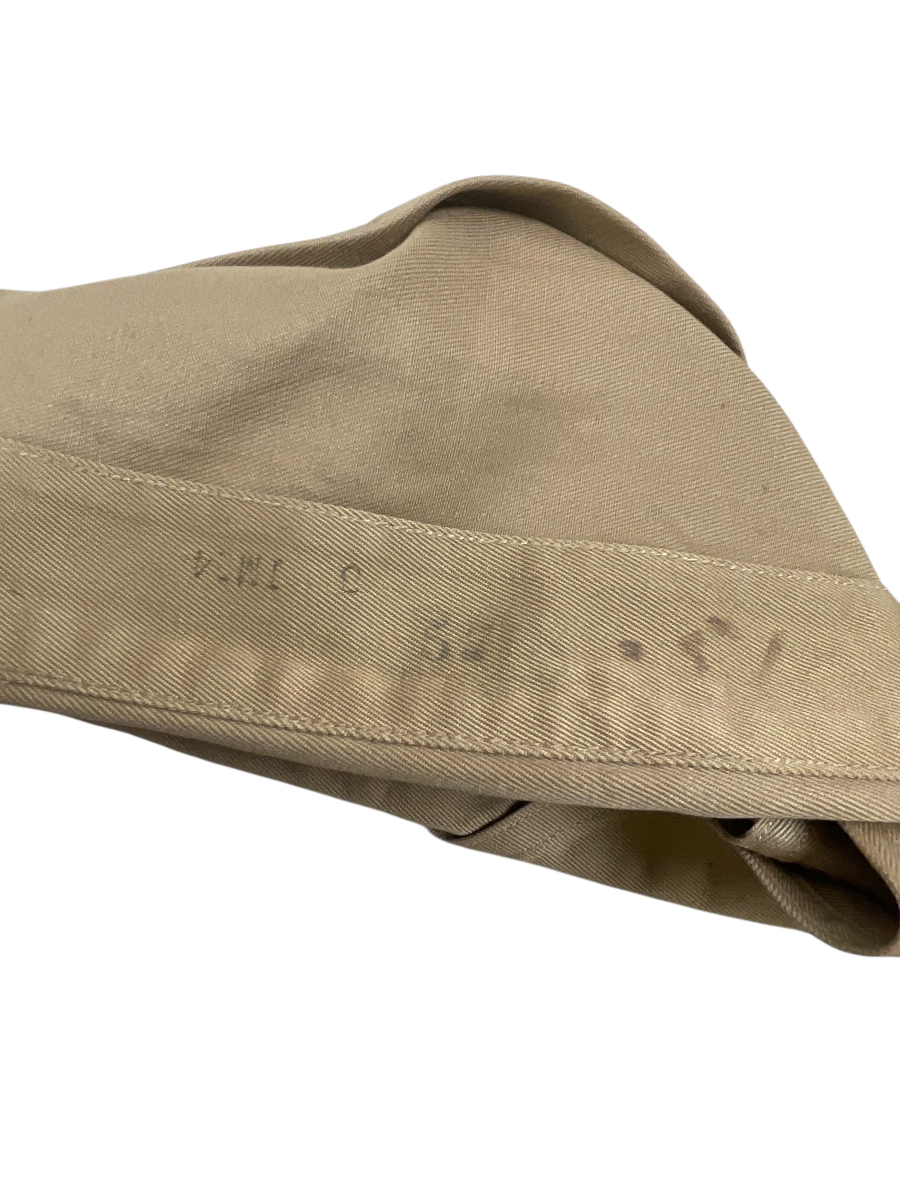 The WW2 US Army Tan Garrison Cap, size 6 7/8, is a standard-issue piece of headgear used by United States Army personnel during the Second World War. Commonly referred to as a “side cap” or “overseas cap,” this item is characterized by its fold-flat design, lightweight tan fabric construction, and absence of a brim. The color was typically worn by Army personnel in warm or tropical climates and was part of the summer uniform ensemble. The cap features reinforced piping along the upper edge, with stitching appropriate to its era of manufacture. The inside of the cap is marked according to its size, 6 7/8, and may include additional manufacturer or quartermaster stamps, depending on the production batch. This type of garrison cap reflects standard U.S. Army uniform regulations from the early 1940s and is frequently sought by collectors and historians interested in American military uniforms from the WW2 period.