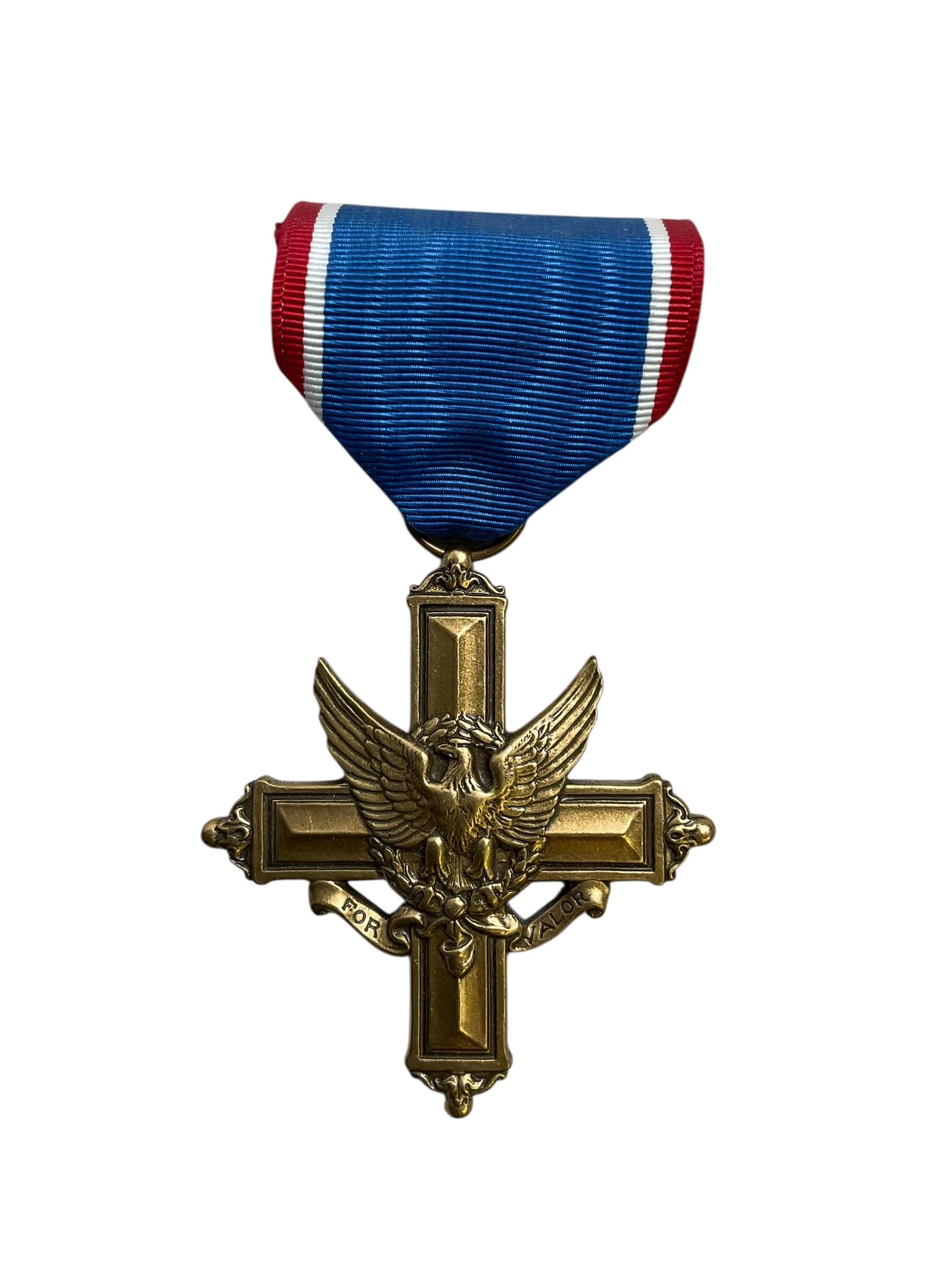 The WW2 US Distinguished Service Cross Full Size Medal is a prestigious military decoration awarded by the United States Army. This medal, second only to the Medal of Honor, was instituted in 1918 to recognize extraordinary heroism and gallantry in combat. It features a bronze cross pattee with an eagle in the center and a laurel wreath, signifying victory, surrounding it. The reverse side of the medal bears the inscription “For Valor.” The ribbon is a patriotic blend of red, white, and blue stripes. This full-sized replica of the Distinguished Service Cross is an important piece of WWII memorabilia and serves as a testament to the bravery and sacrifice of the soldiers who served during this momentous period in history. It is perfect for collectors, history enthusiasts, or veterans looking to honor their service or that of a loved one.