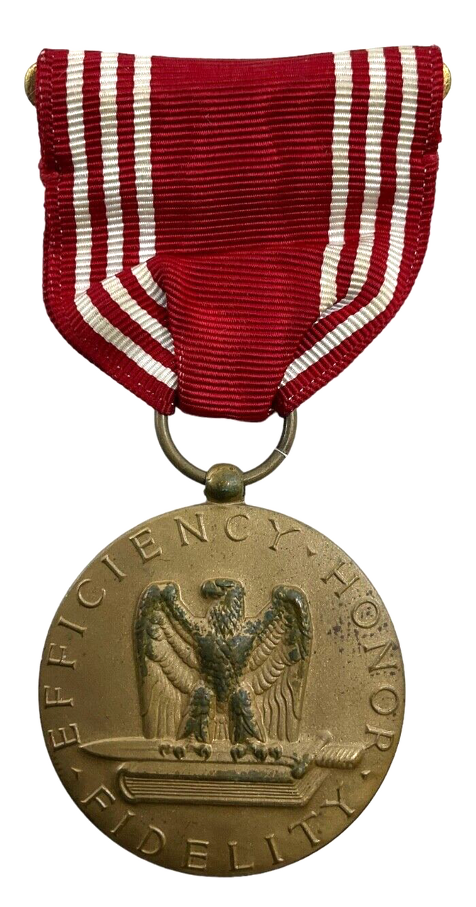 The WW2 US Good Conduct Medal & Ribbon named Cedric C. Maltpress is a distinguished historical artifact from World War II, honoring the exemplary behavior and faithful service of an American soldier. This medal, awarded to Cedric C. Maltpress, signifies his commitment to duty, integrity, and disciplined service throughout his military tenure. The set includes both the medal and ribbon, each designed with intricate detail reflective of the era’s military honors. The medal itself exhibits a fine bronze finish, bearing the profile of a soldier on the front and an eagle with the inscription “Efficiency, Honor, Fidelity” on the back. The accompanying ribbon features a distinctive red design, symbolizing valor and sacrifice. This collectible item not only serves as a poignant reminder of one soldier’s dedication but also offers a tangible connection to the broader narrative of courage and patriotism that defined the Greatest Generation.