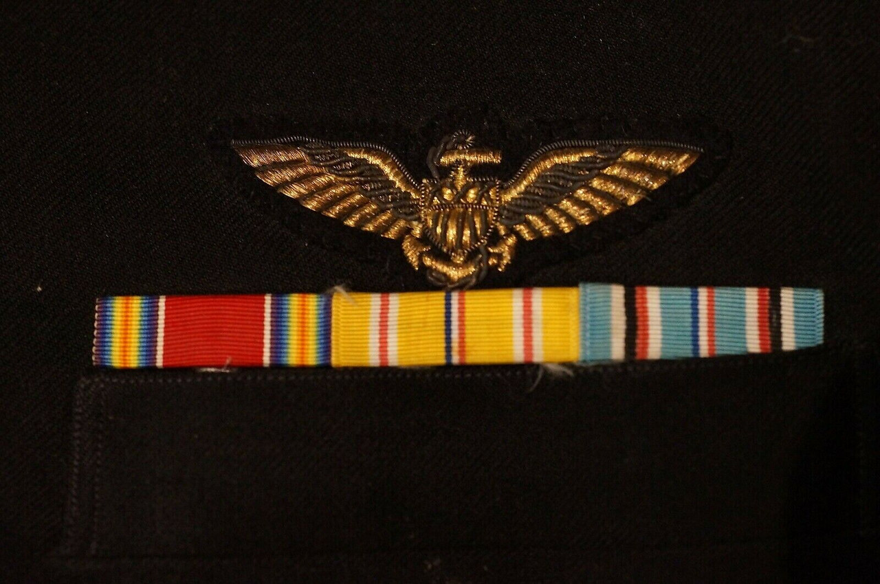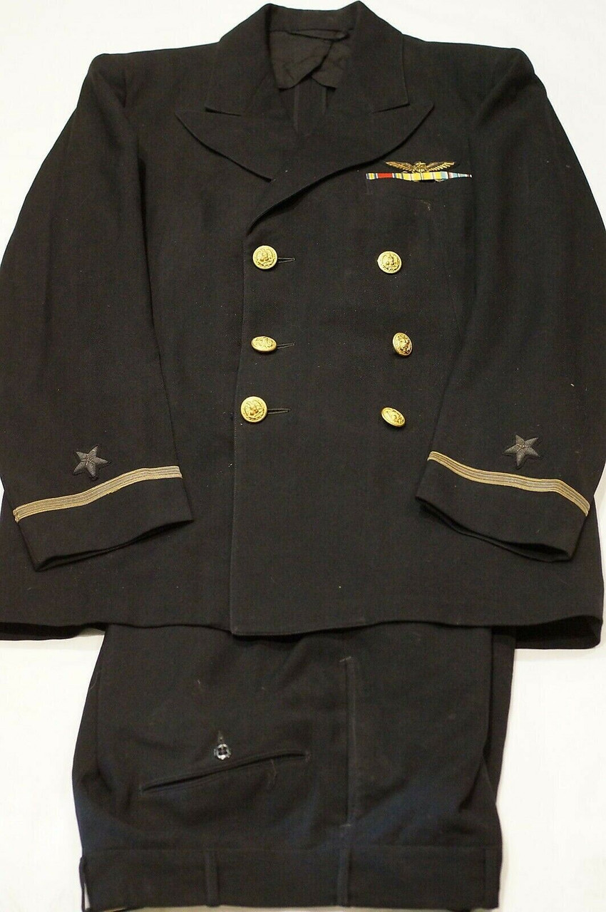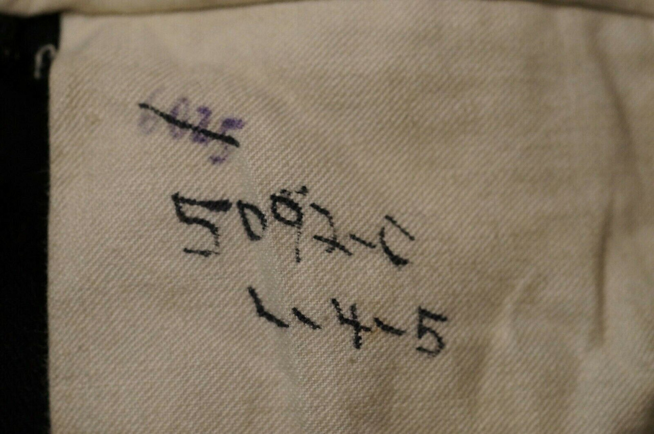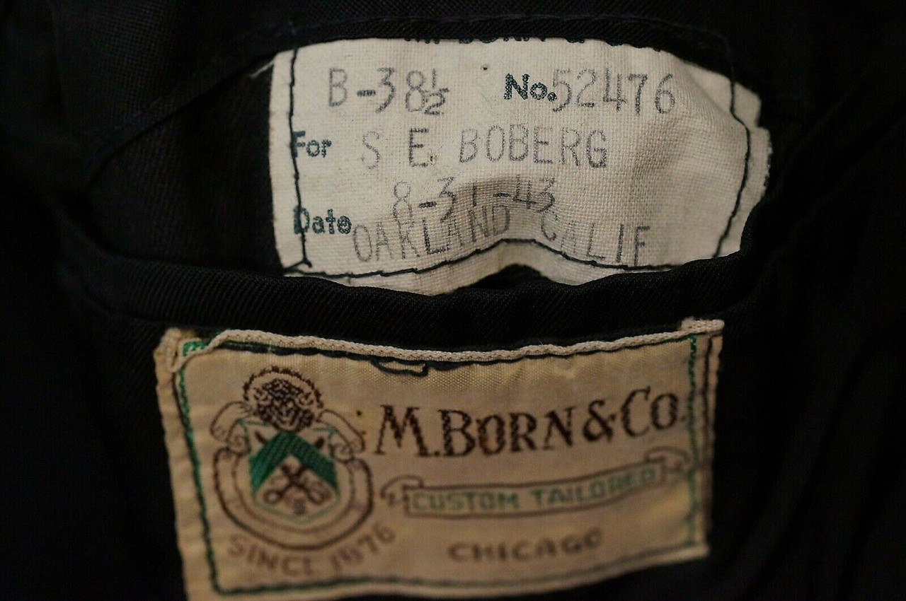 This is a used condition WW2 US Navy Officers Named Pilots Uniform Tunic. Manufactured by M.Born & Co. in Chicago. Dated 1943. Named S.E. Boberg. Complete with US Navy buttons, pilots wings badge, ribbon bar and ensign sleeve rank. Approximate measurements: jacket, shoulder width is 16.5″, sleeve inseam is 16.5″, and length is 29″; pants, for 29″ to 30″ waists, pant inseam is 31″. The uniform is in good shape with normal signs of use. I ship all over the world. GST of 5% is applicable on all sales within Canada.