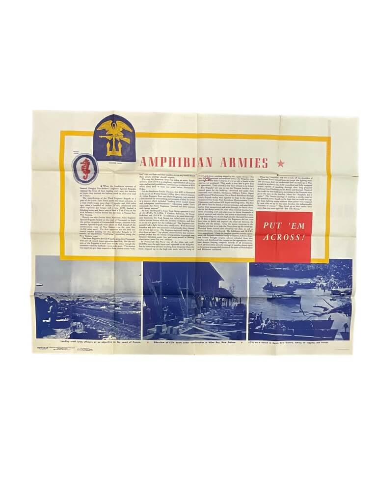 The ‘WW2 US Newsmap 47″ X 34 1/2″‘ is a significant piece of World War II memorabilia, originally produced by the U.S. government during the 1940s. Measuring a robust 47″ x 34.5″, this large-scale newsmap served as an informational tool for American soldiers and civilians alike, disseminating key updates about the progress of the war. The newsmap not only features detailed military maps and strategic global positioning but also includes news headlines, photographs, and summaries of significant events. It offers a visual and textual narrative of the war, providing a real-time perspective of the conflict as it unfolded. This authentic and historical document encapsulates a pivotal time in world history, making it a valuable collector’s item. It offers a direct insight into the socio-political landscape of the era, making it a must-have for history enthusiasts and collectors alike.