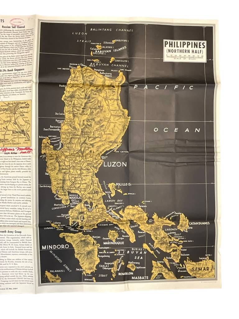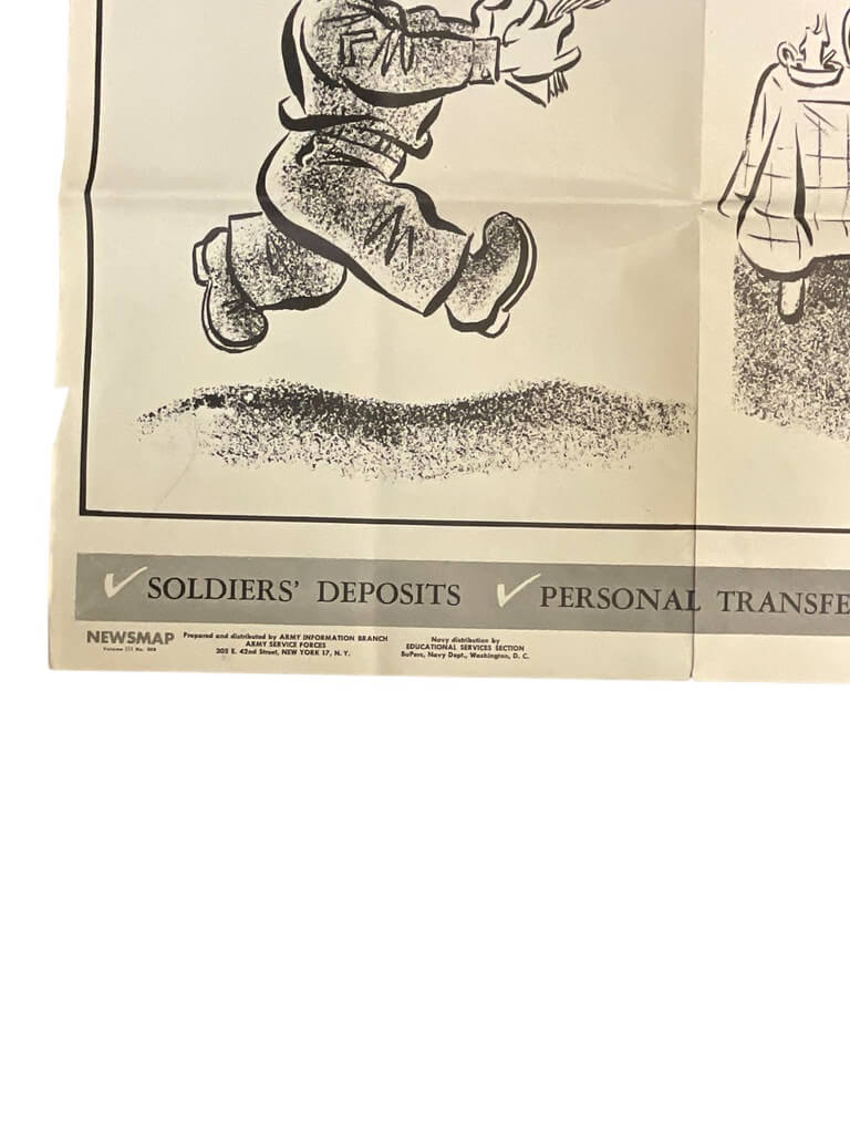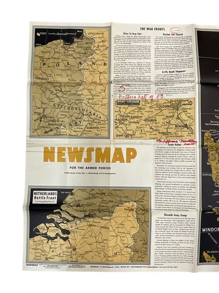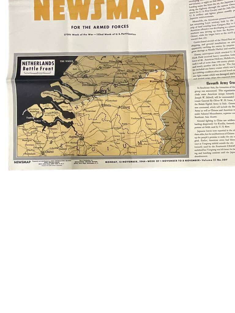 The item titled ‘WW2 US Newsmap Vol 3 No 30F 47″ X 34 1/2″’ is a fascinating historical artifact from the era of the Second World War. This Newsmap, a large, double-sided poster measuring 47 inches by 34.5 inches, is an authentic piece from 1944, intended by the US Government to inform servicemen about the progress of the war. It features a detailed global map on one side, highlighting critical military operations, and informative articles and illustrations on the other, offering insights into war efforts and cultural aspects of the time. As a volume 3, number 30F edition, it provides a unique snapshot of the war’s status at that particular point in time. This Newsmap is not just a collector’s item, but also a significant educational resource, shedding light on wartime communication and the global geopolitical landscape during one of history’s most pivotal periods.