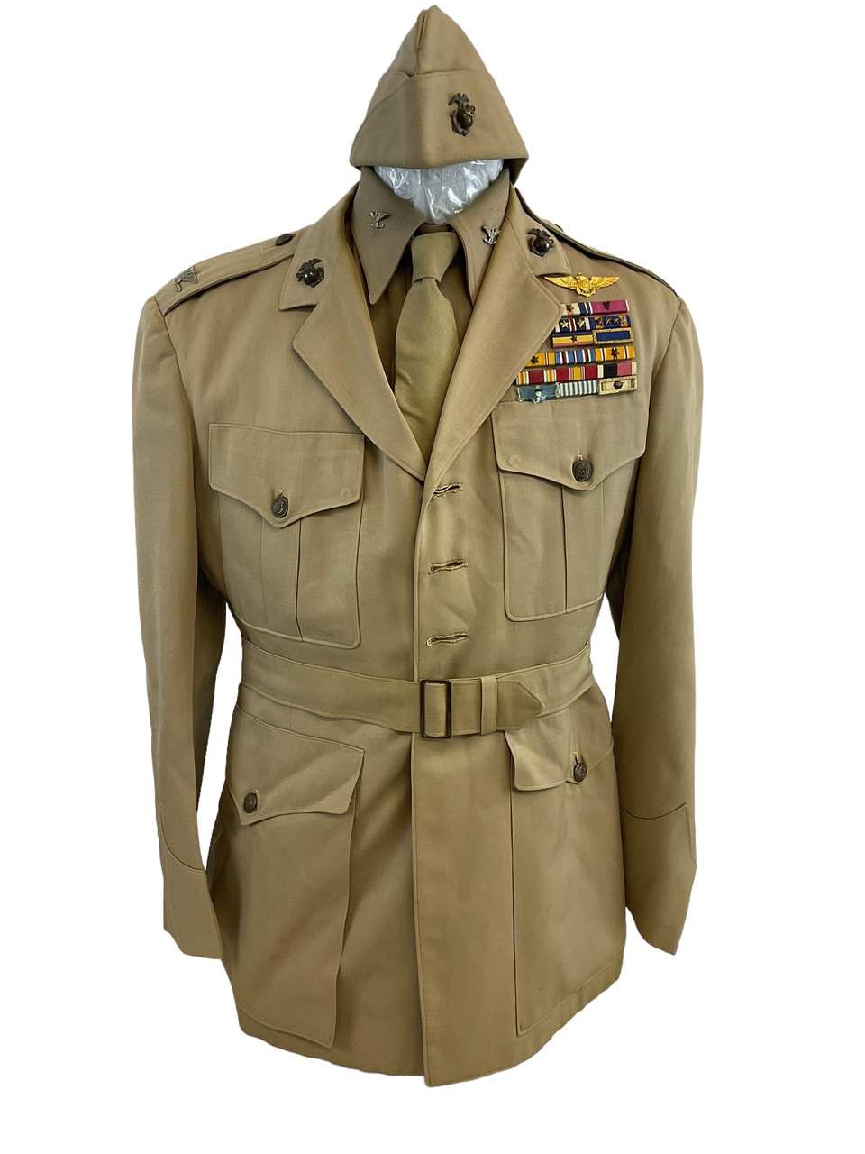 This exceptional collection features the uniform and sword of Donald Yost, a distinguished USMC Marine Corps ace with 8 victories during World War II. The meticulously preserved post-war uniform bears Yost’s name, offering a rare glimpse into the attire of a decorated fighter pilot known for his bravery and skill. The accompanying sword, a symbol of his esteemed rank and service, further complements this historical ensemble. Yost’s contributions to the US Marine Corps during one of history’s most tumultuous periods are commemorated through this carefully curated set. Ideal for collectors and history enthusiasts, this collection is not only a tribute to Yost’s heroism but also a tangible connection to the valor and sacrifice of those who served in WW2. This is a unique opportunity to own a piece of military history that honors an American hero and his legacy.